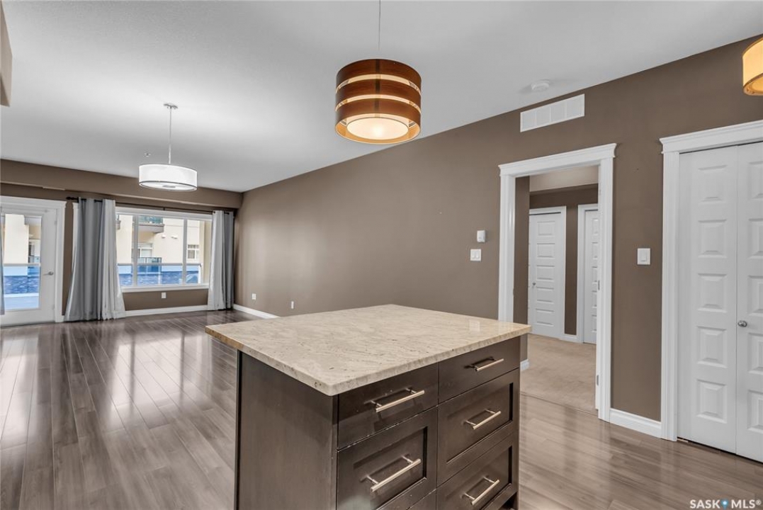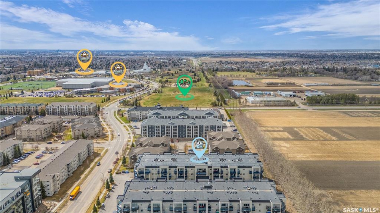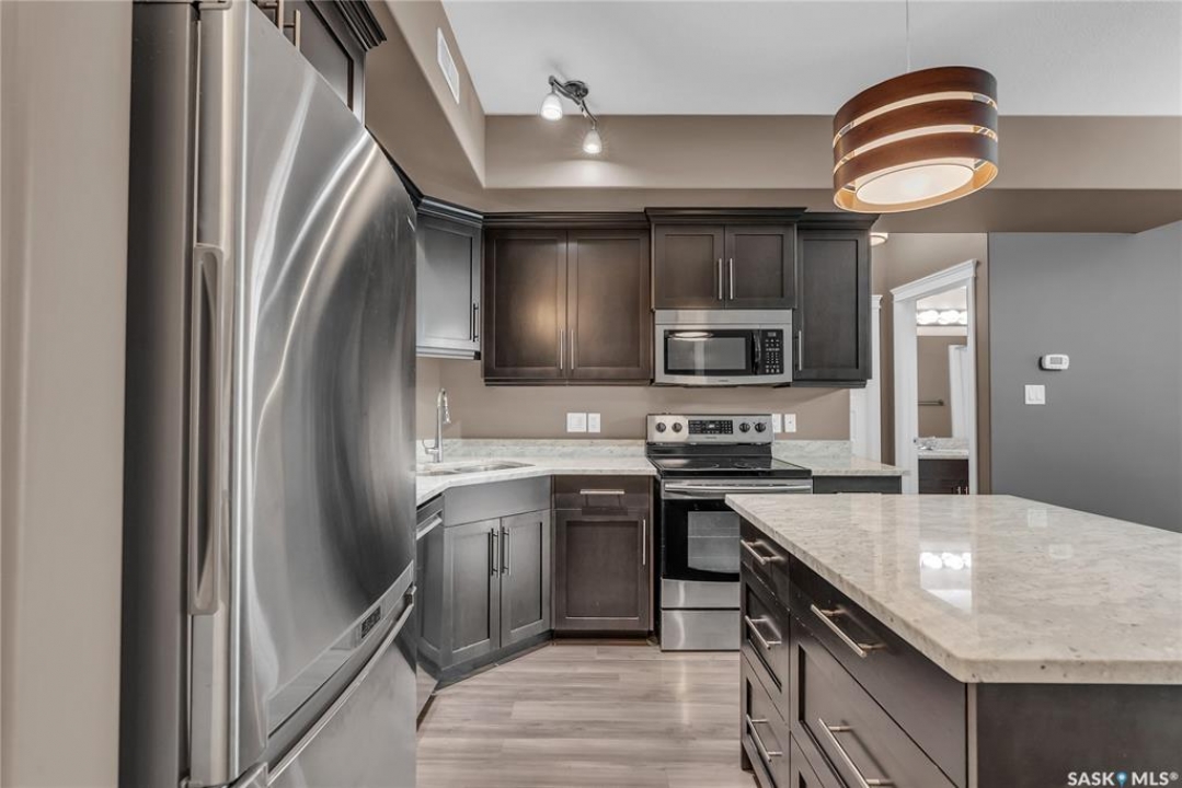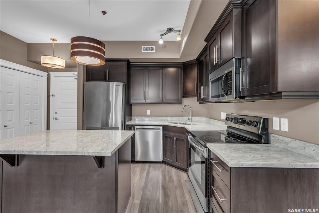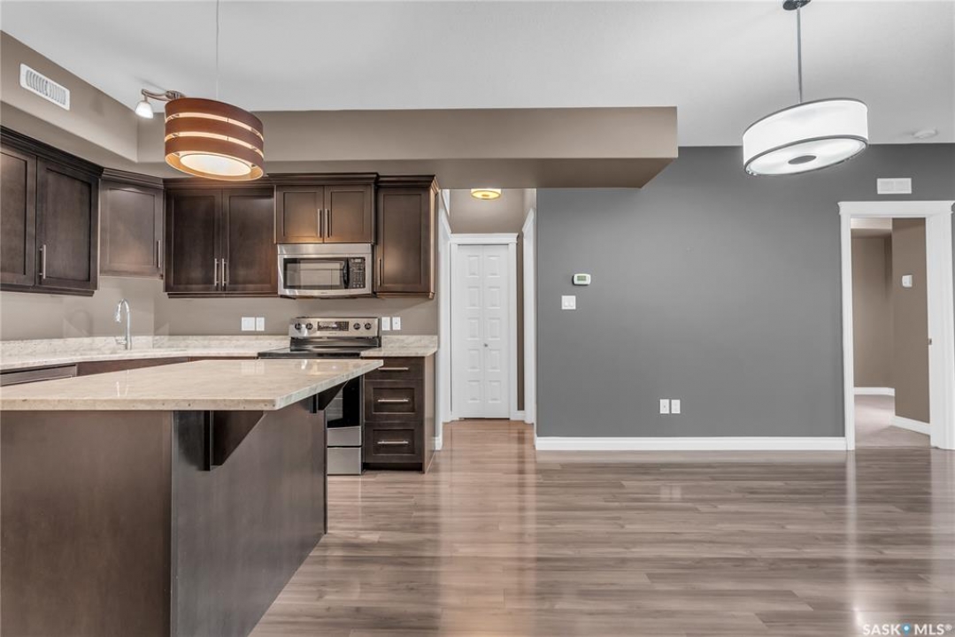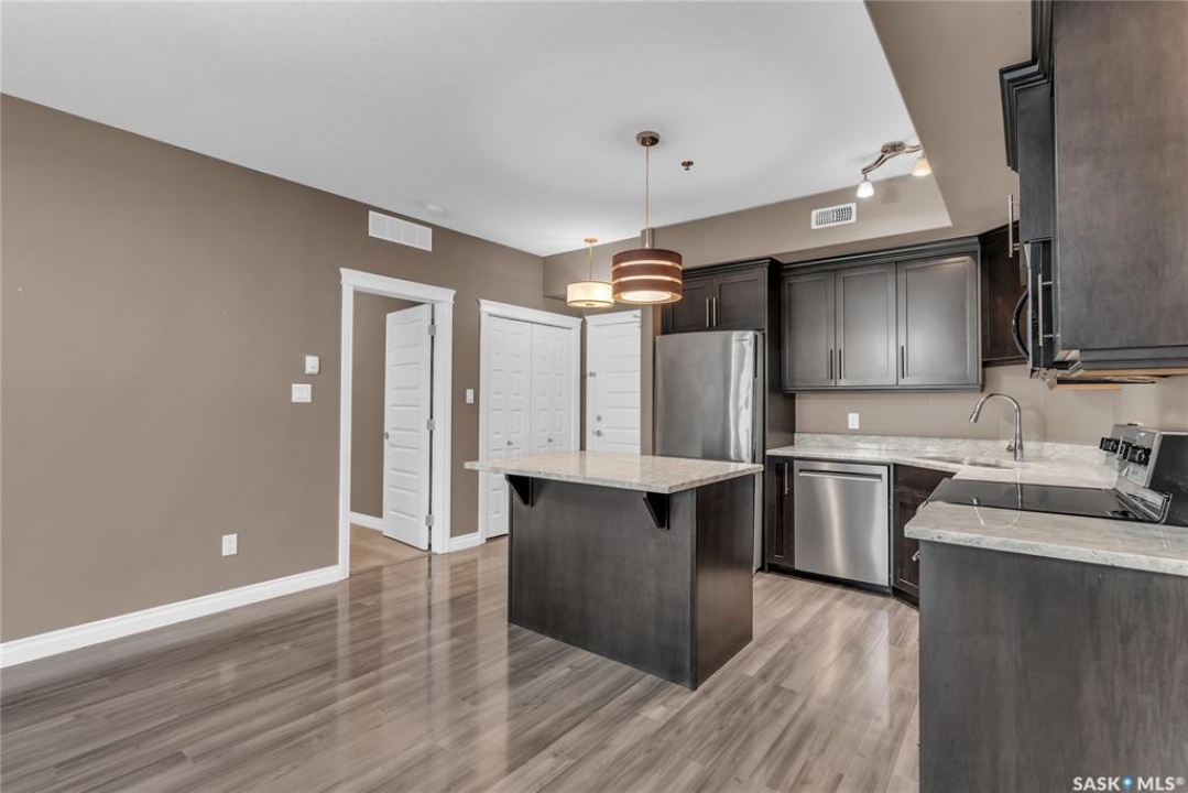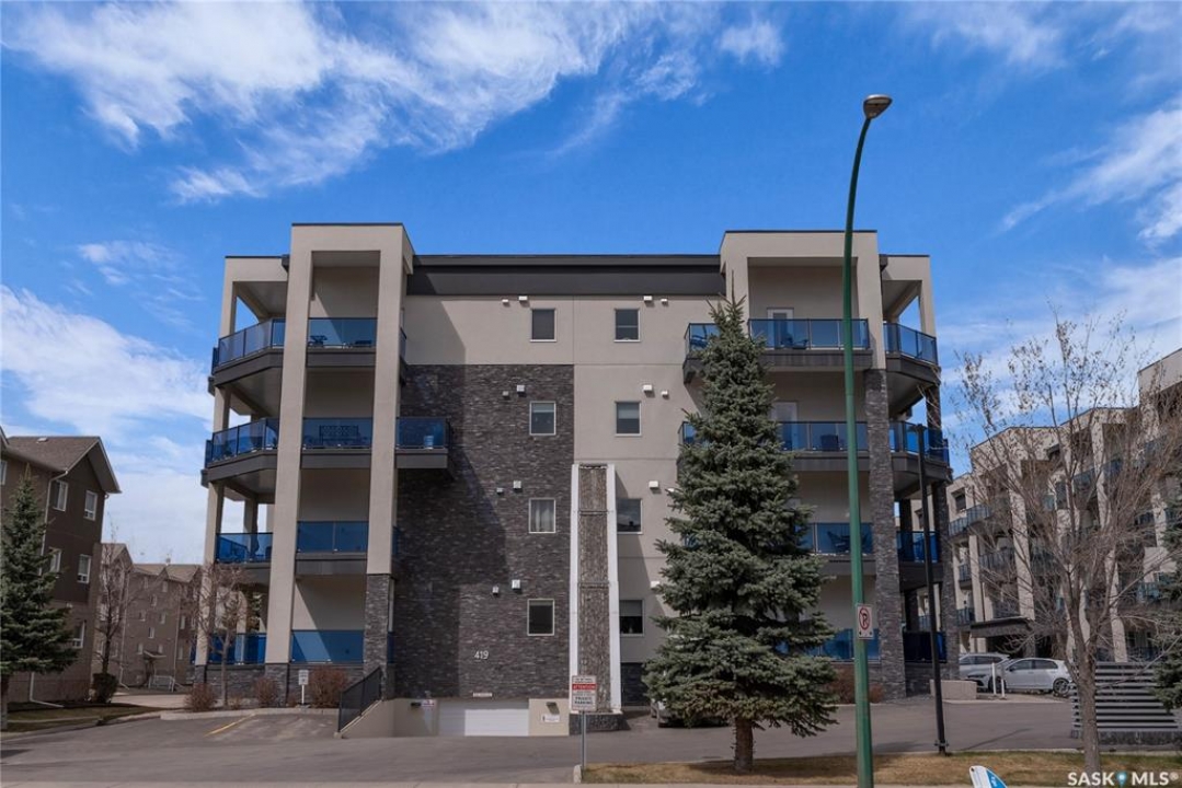 Remarkable main floor 2 bedroom and 2 bathroom condo with 1 underground parking stall in University Heights. Original owners never lived in, been only used as a rental for family. This unit has never had any pets or been smoked in. Modern open floor plan with kitchen, dining and living room area. Spacious kitchen with all appliances, maple cabinetry, granite countertops, large island and undermount sink. Huge primary bedroom with 2 sizable closets and 3pce en-suite. Additional bedroom and 4pce bathroom on opposite side of living room. In-sundry room with storage. Huge, covered balcony includes natural gas bbq hook-up. There is 1 titled underground parking spot #60 and storage room in Row C 111. The building has amenities room, amazing car wash, wood shop and fitness room. Bonus building 423 beside has a bar, pool table area that all residence can access. Close to U of S, schools, shopping, restaurants, medical and many amenities in walking distance. This one is waiting for you to call home!