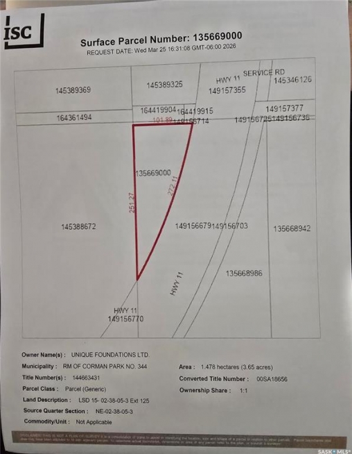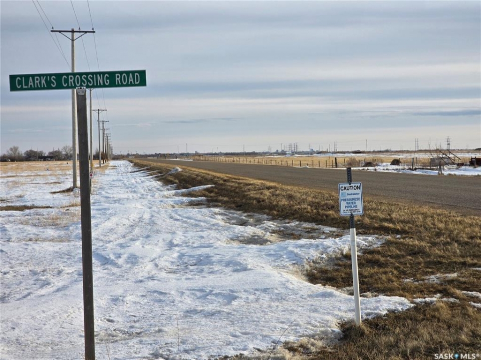 Minutes form Saskatoon. Residential Zoned DCR1. Over 890 feet (272 M) of Highway frontage. 3.6 ACRES West of or beside the "SASKATOON SHINES" Sign. Access through Clark's Crossing Road. Services located in ditch or on 'Clarks Crossing Road (TWP RD 381).' Great investment opportunity. From Hwy 11 go West on Corman Park Road for 1 km then South/Left on RGE RD 3052 for 1.5 km then East/Left on Clarks Crossing Rd (TWP RD 381) for 1 km (to end). Property on Right.