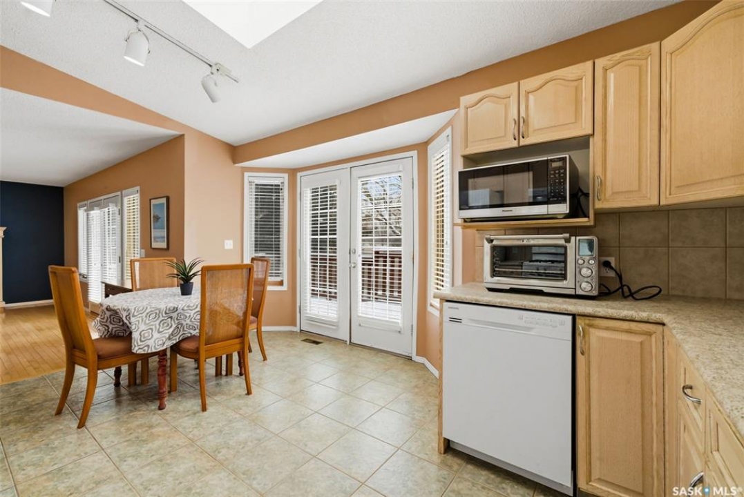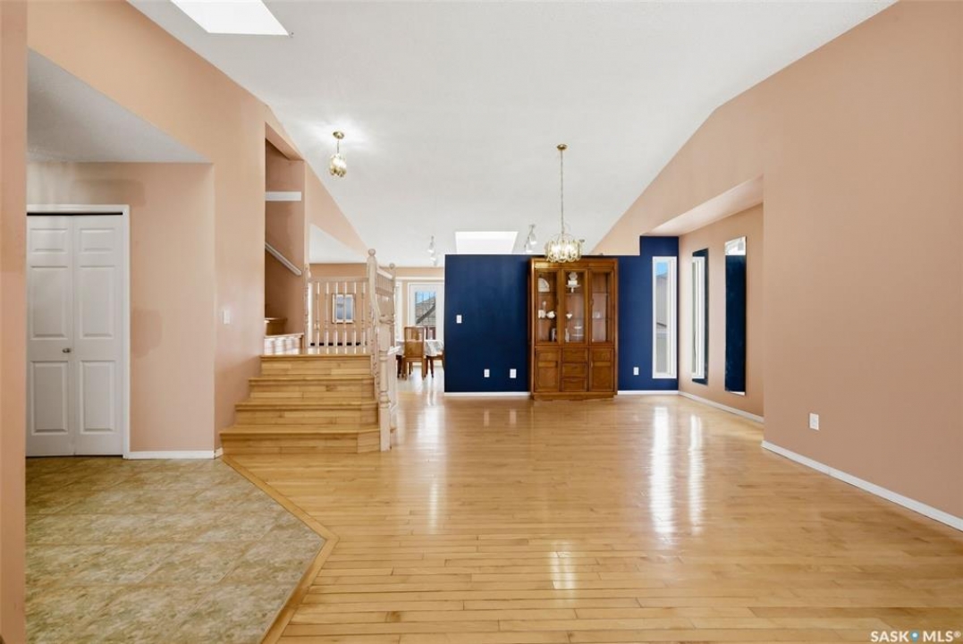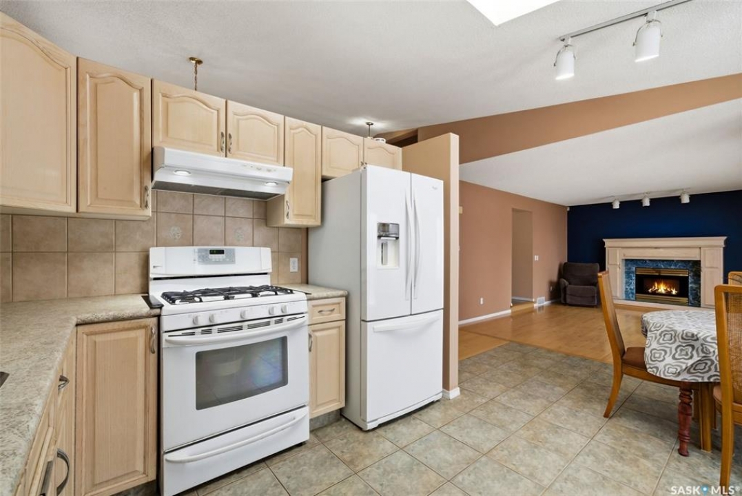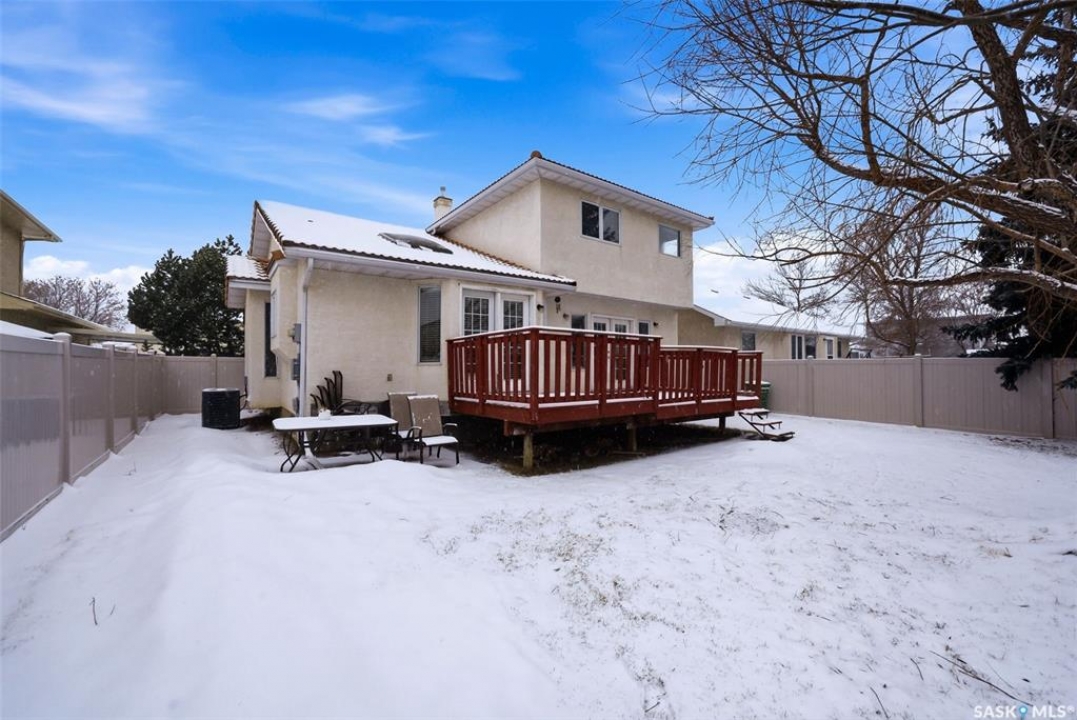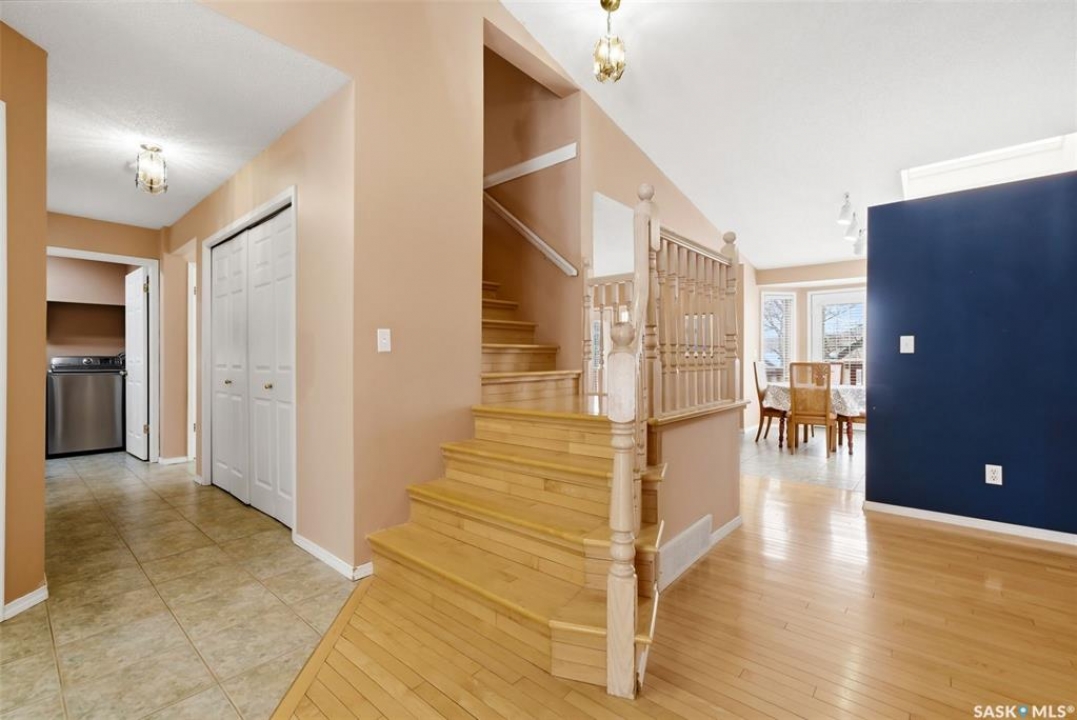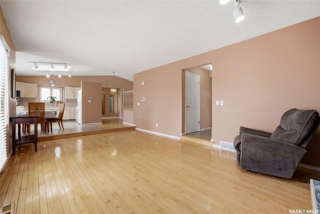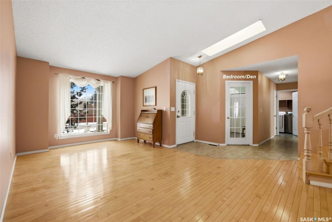 Excellent location for this 1992 Built 2027 sq. ft. 5 bedroom, 3 bathroom 2 story split with double attached (heated/insulated garage) in Woodland Grove. This one owner home was a show home when purchased in 1992 and features vaulted ceilings, skylights, lots of maple hardwood throughout and tile flooring. Kitchen features white washed oak cabinetry, vaulted ceiling with skylight, b/I dishwasher, gas stove, fridge, hood fan, tile flooring and double doors to deck and large backyard. Kitchen overlooks the familyroom with gas fireplace, maple hardwood flooring and garden doors to deck overlooking backyard. Livingroom with beautiful vaulted ceiling, hardwood flooring and overlooking the spacious diningroom. Main floor den/office with hardwood floors, laundryroom with washer & dryer included, large handy 2 pc bathroom and direct entry to double attached heated/insulated garage. The staircase leading to the upper level is hardwood and features 3 bedrooms all with hardwood flooring, primary with 4 pc ensuite with jet tub and corner shower. There is also a 4 pc main bathroom upstairs. The basement has a bedroom developed, rough-in for bathroom, flat concrete floor in great condition and insulated walls ready for development. Large backyard with 2 tiered deck and PVC fencing. Quick possession