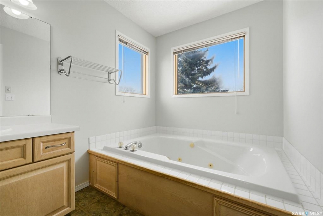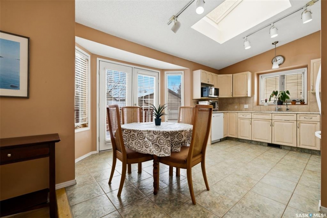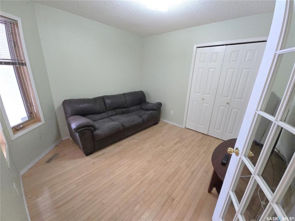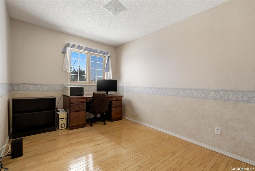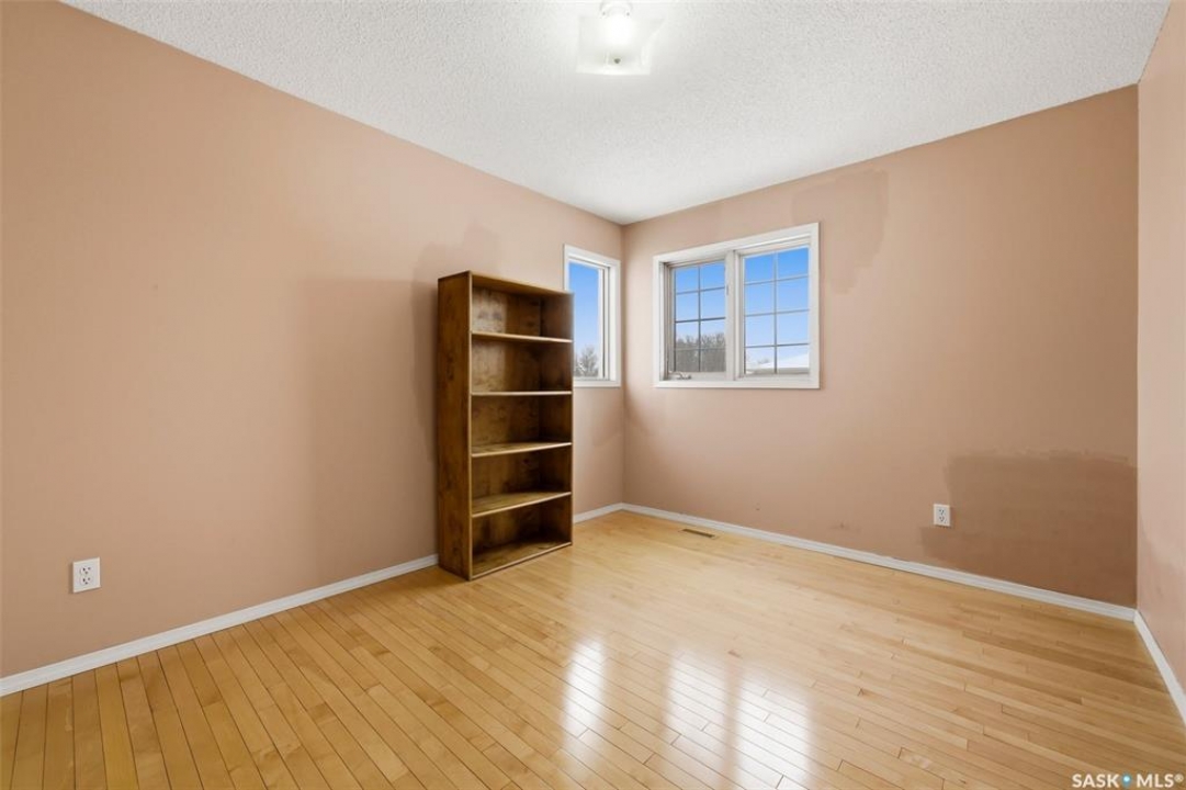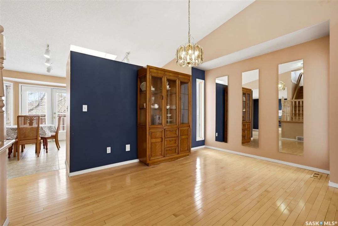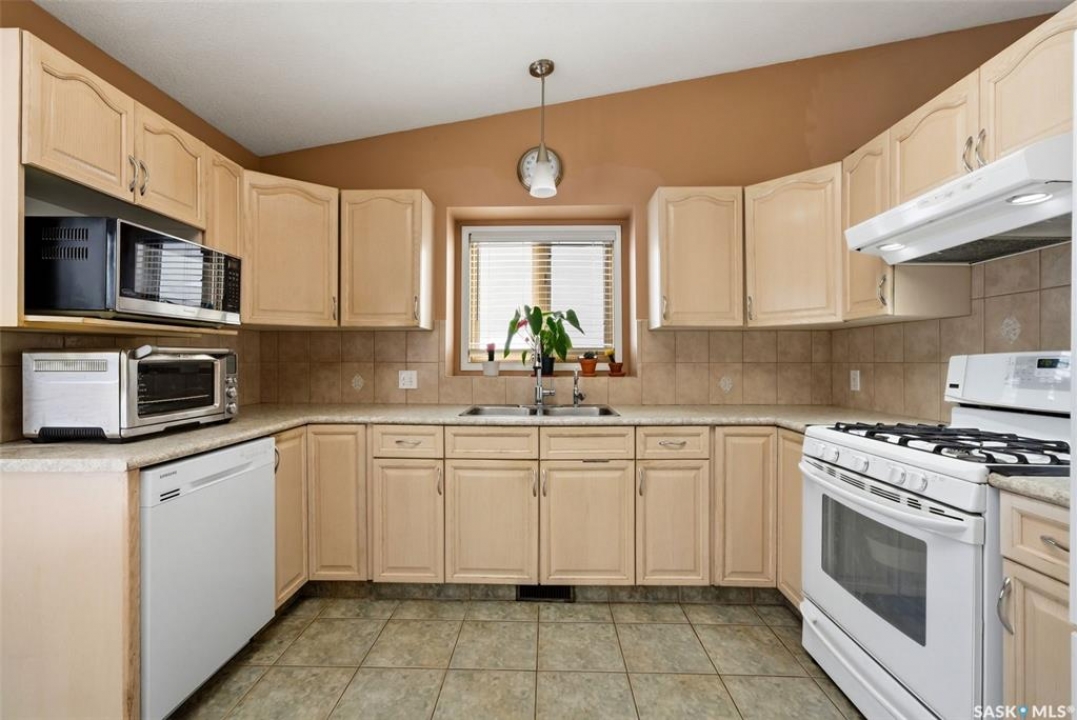 Excellent location for this 1992 Built 2027 sq. ft. 5 bedroom, 3 bathroom 2 story split with double attached (heated/insulated garage) in Woodland Grove. This one owner home was a show home when purchased in 1992 and features vaulted ceilings, skylights, lots of maple hardwood throughout and tile flooring. Kitchen features white washed oak cabinetry, vaulted ceiling with skylight, b/I dishwasher, gas stove, fridge, hood fan, tile flooring and double doors to deck and large backyard. Kitchen overlooks the familyroom with gas fireplace, maple hardwood flooring and garden doors to deck overlooking backyard. Livingroom with beautiful vaulted ceiling, hardwood flooring and overlooking the spacious diningroom. Main floor den/office with hardwood floors, laundryroom with washer & dryer included, large handy 2 pc bathroom and direct entry to double attached heated/insulated garage. The staircase leading to the upper level is hardwood and features 3 bedrooms all with hardwood flooring, primary with 4 pc ensuite with jet tub and corner shower. There is also a 4 pc main bathroom upstairs. The basement has a bedroom developed, rough-in for bathroom, flat concrete floor in great condition and insulated walls ready for development. Large backyard with 2 tiered deck and PVC fencing. Quick possession