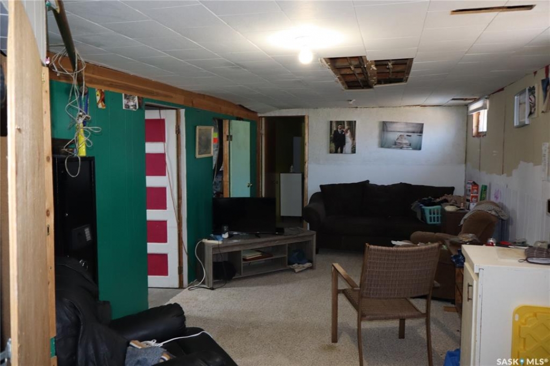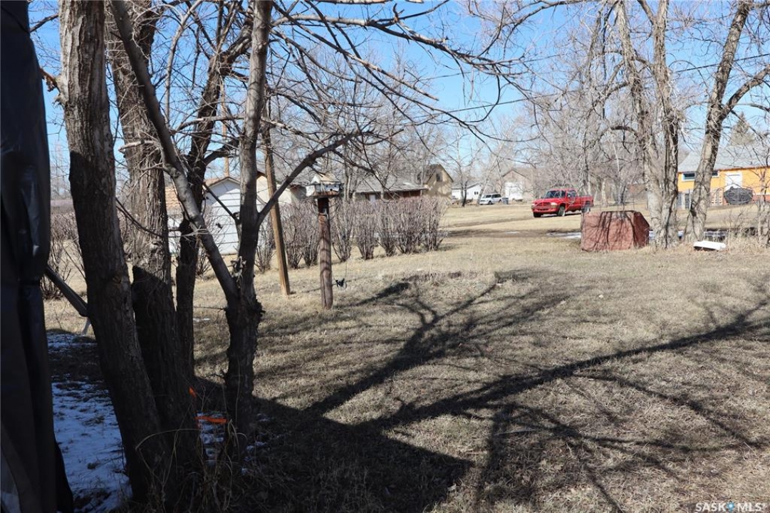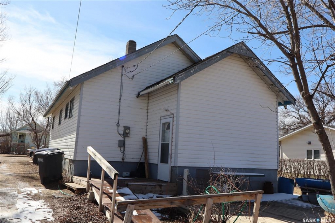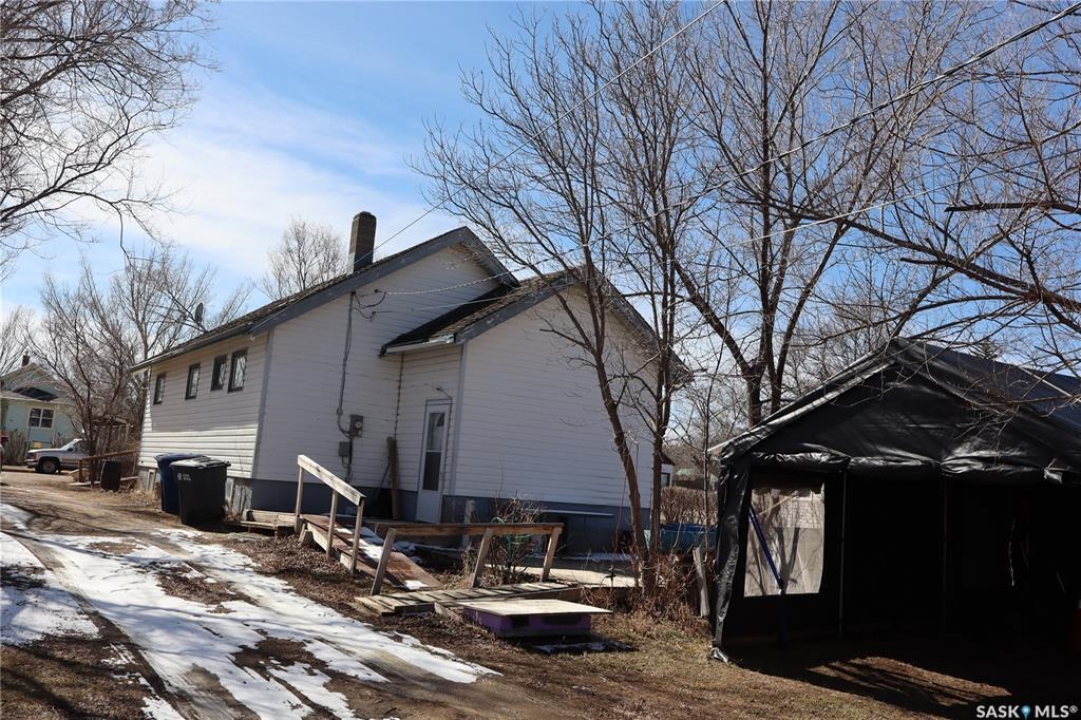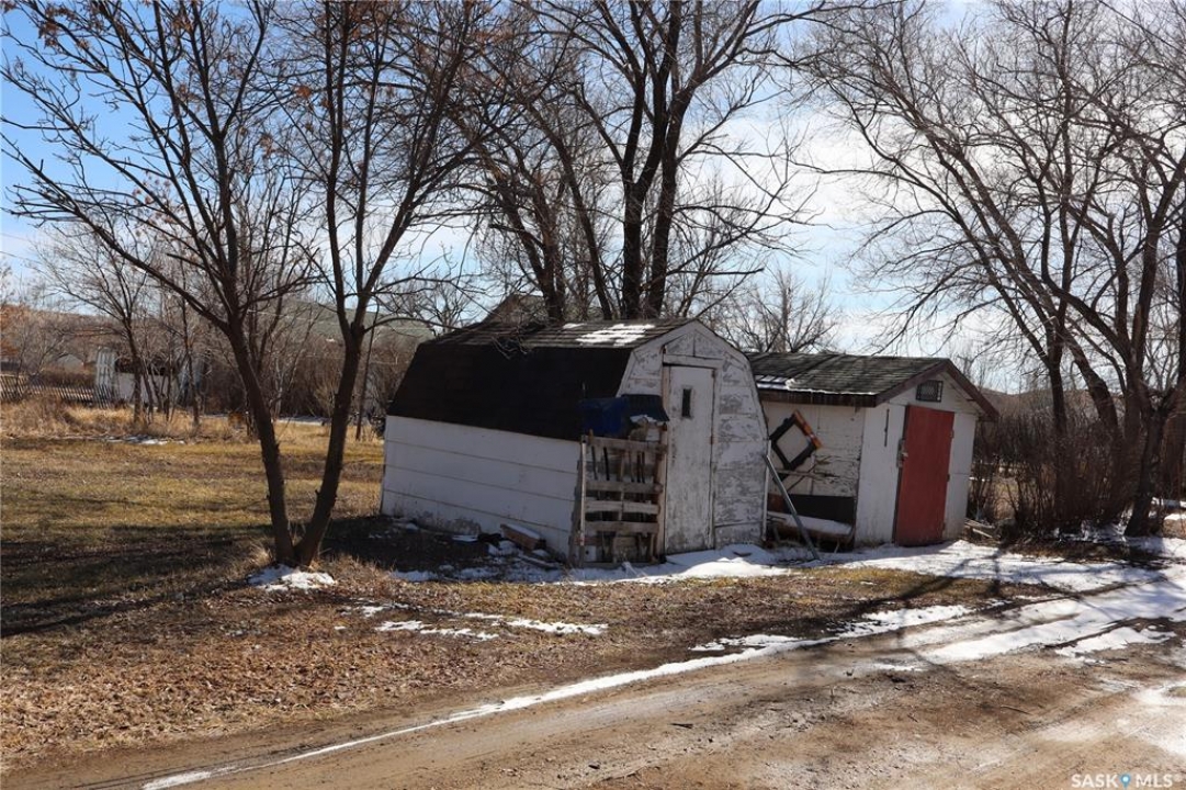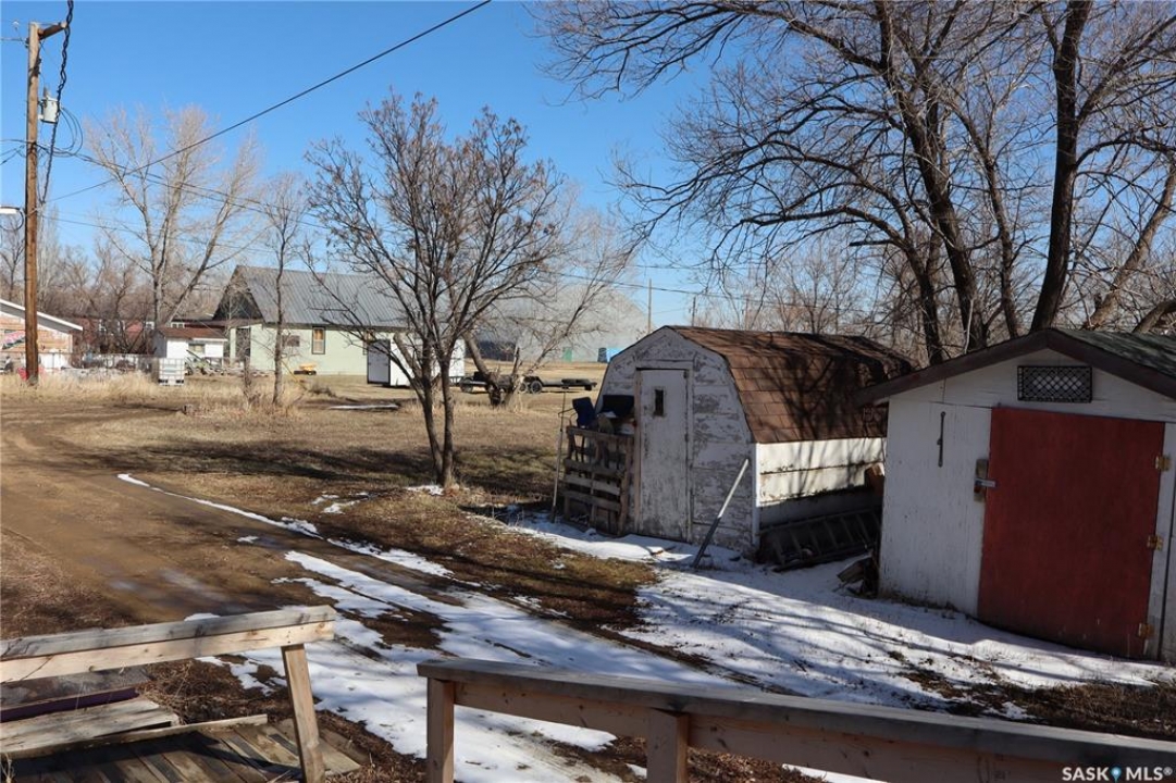 This property is situated in the Town of Willow Bunch and offers an excellent location. The residence occupies a double lot and comprises 860 square feet above an upgraded concrete basement. While the basement is not original to the home, its construction date is unknown. The main floor includes a spacious eat-in kitchen, main floor laundry conveniently located in the four-piece bathroom, a generous living room, two bedrooms, and access to the front porch. The bathroom is equipped with a stand-up shower and a claw foot tub, and the laundry utilizes a stacked unit. The basement has been developed to feature a large family room, a den currently used as a bedroom, a utility room with additional laundry facilities, a natural gas forced air furnace, an electric water heater, and ample storage space. Exterior amenities include a wheelchair-accessible ramp at the front entrance, a deck at the rear, and substantial outdoor space. Additional features comprise several older storage sheds, a portable garage, and an adjacent vacant lot that has served as a firepit area and garden. The house is enhanced by newer vinyl windows and upgraded flooring. This property presents an attractive opportunity; viewing is recommended.