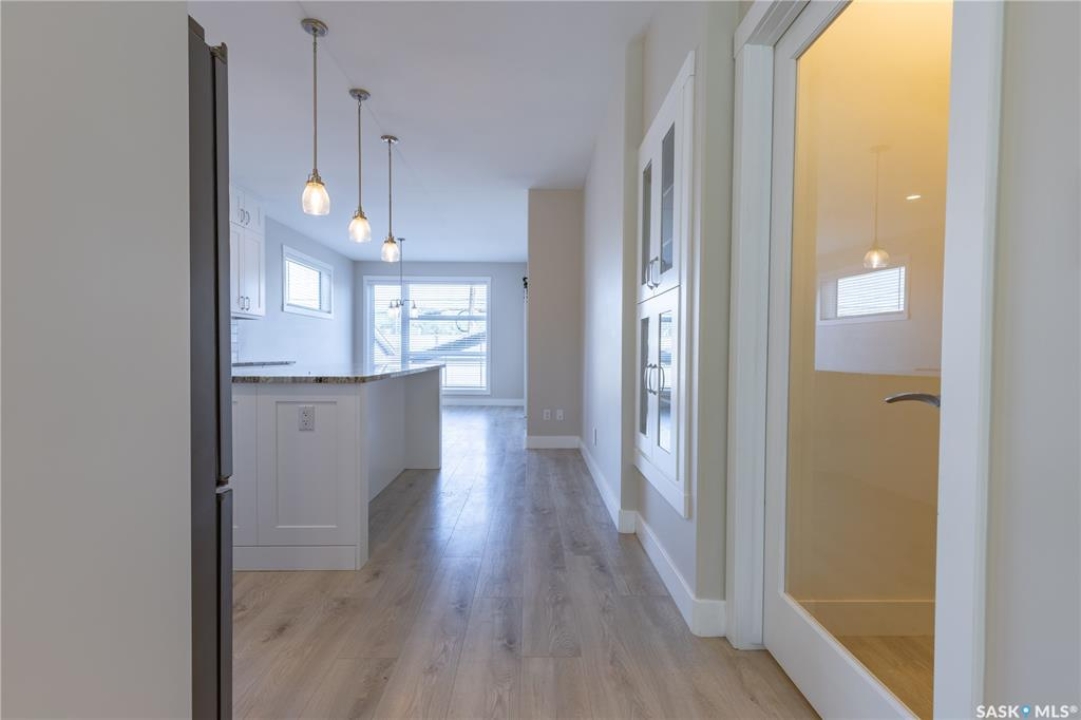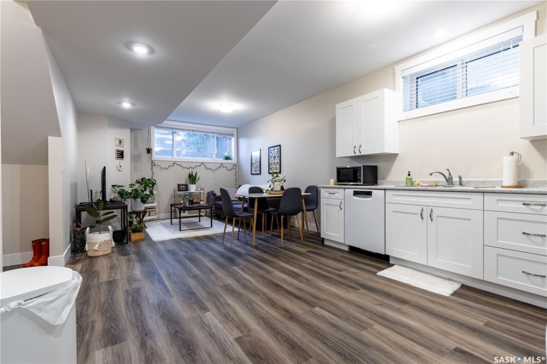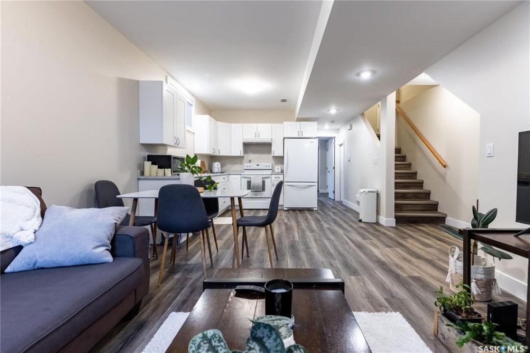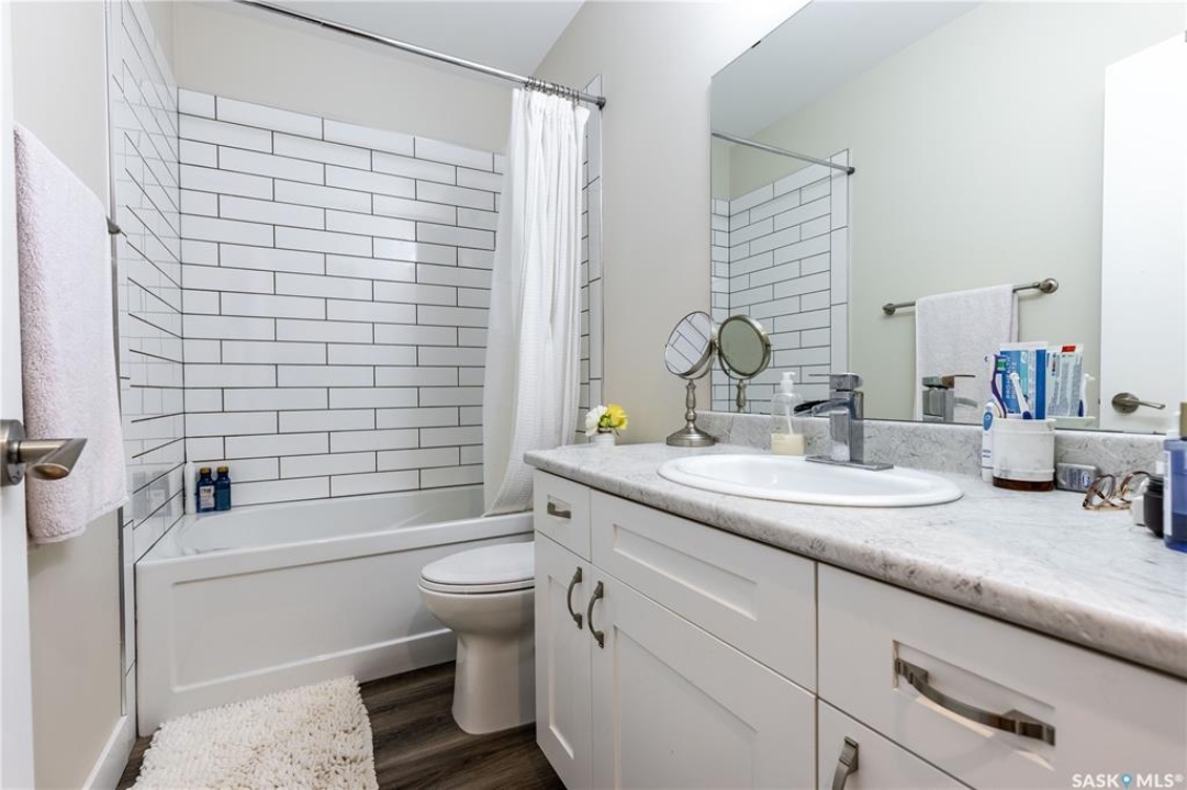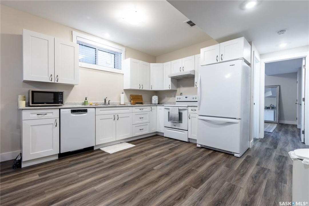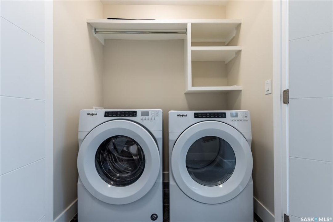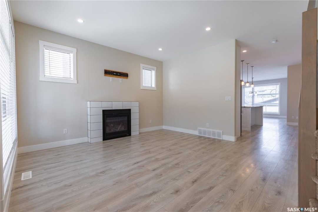 Welcome to 1037 7th Street East — a thoughtfully designed modern infill with a layout that just makes sense. The main floor offers a spacious, functional flow anchored by a large kitchen with ample cabinetry and a generous island, perfect for everyday living. A cozy fireplace adds warmth to the living area, while both front and rear entryways provide practical space with room for storage. A separate stairwell to the mechanical room is a smart touch you don't often see. Upstairs, the primary suite is a standout, featuring a walk-in closet and a well-appointed ensuite with a freestanding tub, tiled shower, and dual sinks. Two additional bedrooms are nicely sized, and second-floor laundry adds everyday convenience. The legal one-bedroom basement suite is bright, well laid out, and ideal for added income or extended living. The current tenant would be happy to stay, offering a seamless option for buyers looking for a mortgage helper. Outside, the home carries a clean, modern aesthetic with board and batten siding. Enjoy your morning coffee on the private balcony off the primary bedroom overlooking a mature, tree-lined street, or relax on the back deck. A double detached garage is complemented by a front concrete driveway for additional parking. A well-rounded home in a great location — ready for its next owner.