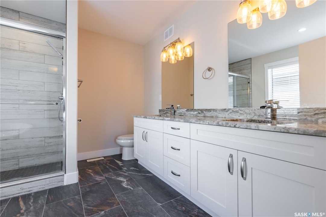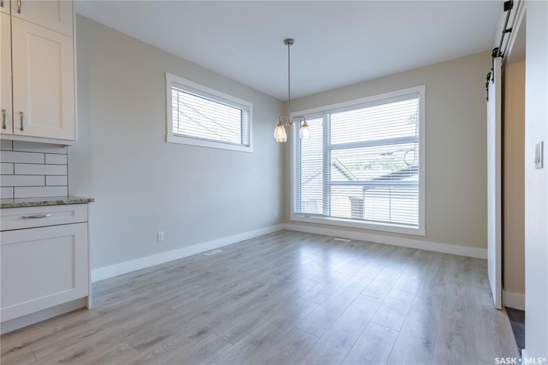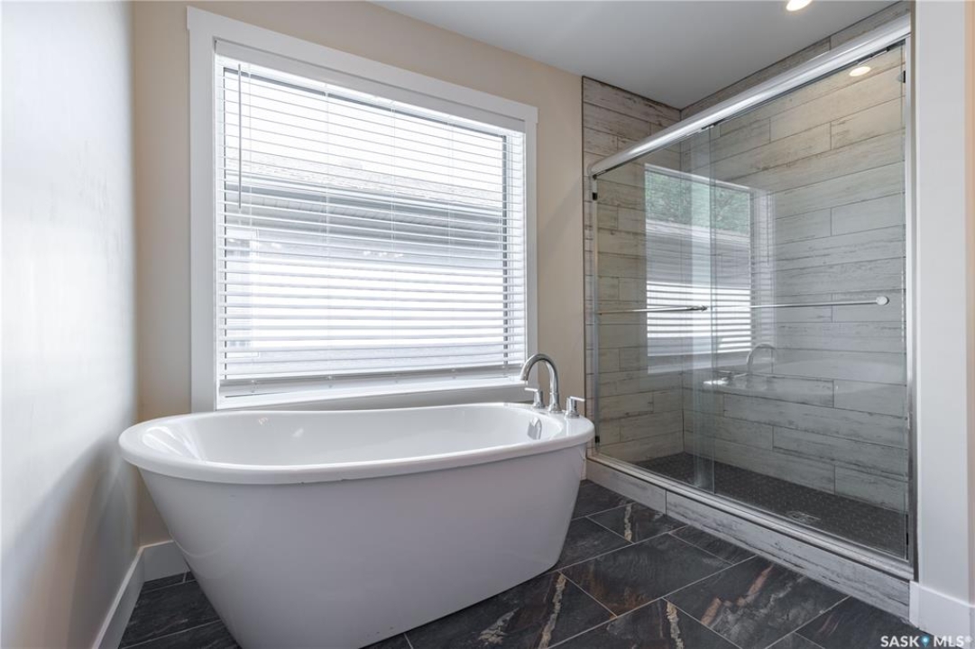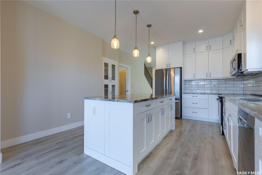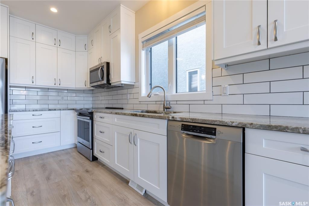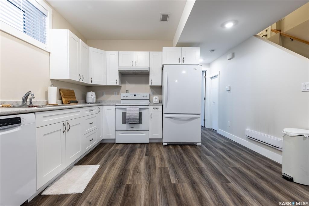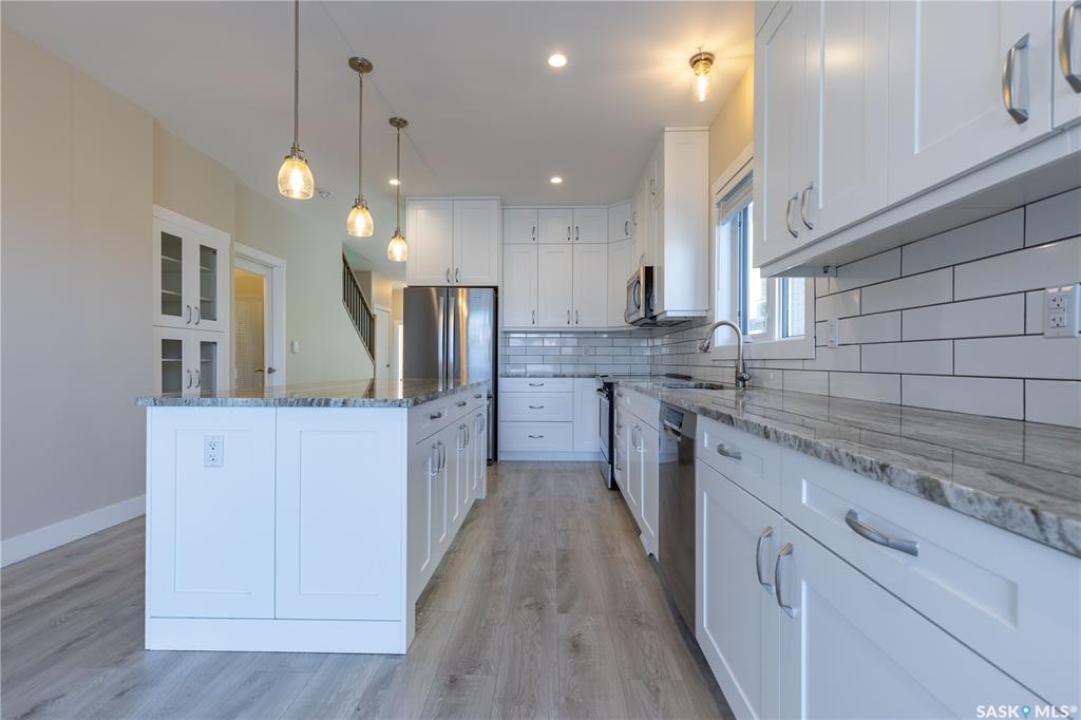 Welcome to 1037 7th Street East — a thoughtfully designed modern infill with a layout that just makes sense. The main floor offers a spacious, functional flow anchored by a large kitchen with ample cabinetry and a generous island, perfect for everyday living. A cozy fireplace adds warmth to the living area, while both front and rear entryways provide practical space with room for storage. A separate stairwell to the mechanical room is a smart touch you don't often see. Upstairs, the primary suite is a standout, featuring a walk-in closet and a well-appointed ensuite with a freestanding tub, tiled shower, and dual sinks. Two additional bedrooms are nicely sized, and second-floor laundry adds everyday convenience. The legal one-bedroom basement suite is bright, well laid out, and ideal for added income or extended living. The current tenant would be happy to stay, offering a seamless option for buyers looking for a mortgage helper. Outside, the home carries a clean, modern aesthetic with board and batten siding. Enjoy your morning coffee on the private balcony off the primary bedroom overlooking a mature, tree-lined street, or relax on the back deck. A double detached garage is complemented by a front concrete driveway for additional parking. A well-rounded home in a great location — ready for its next owner.