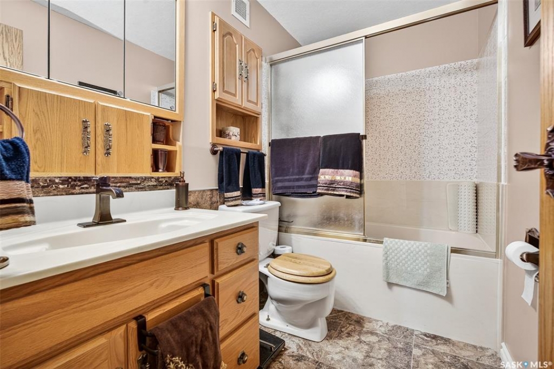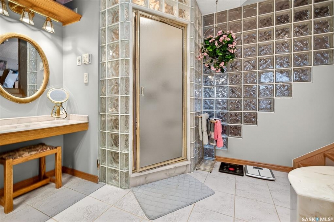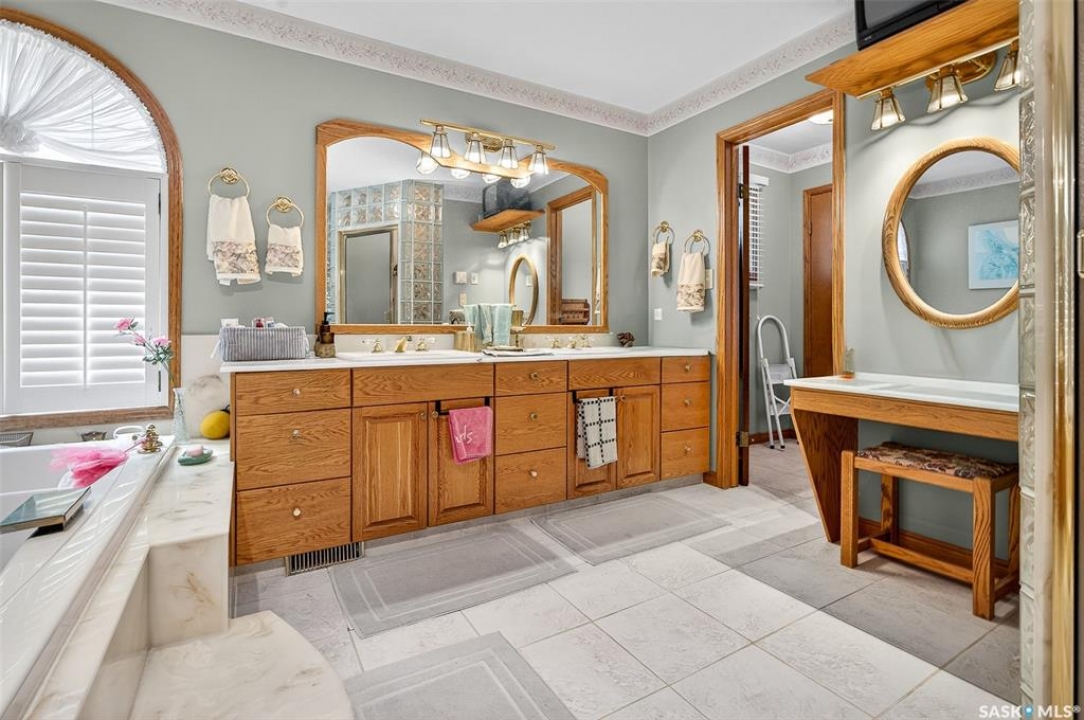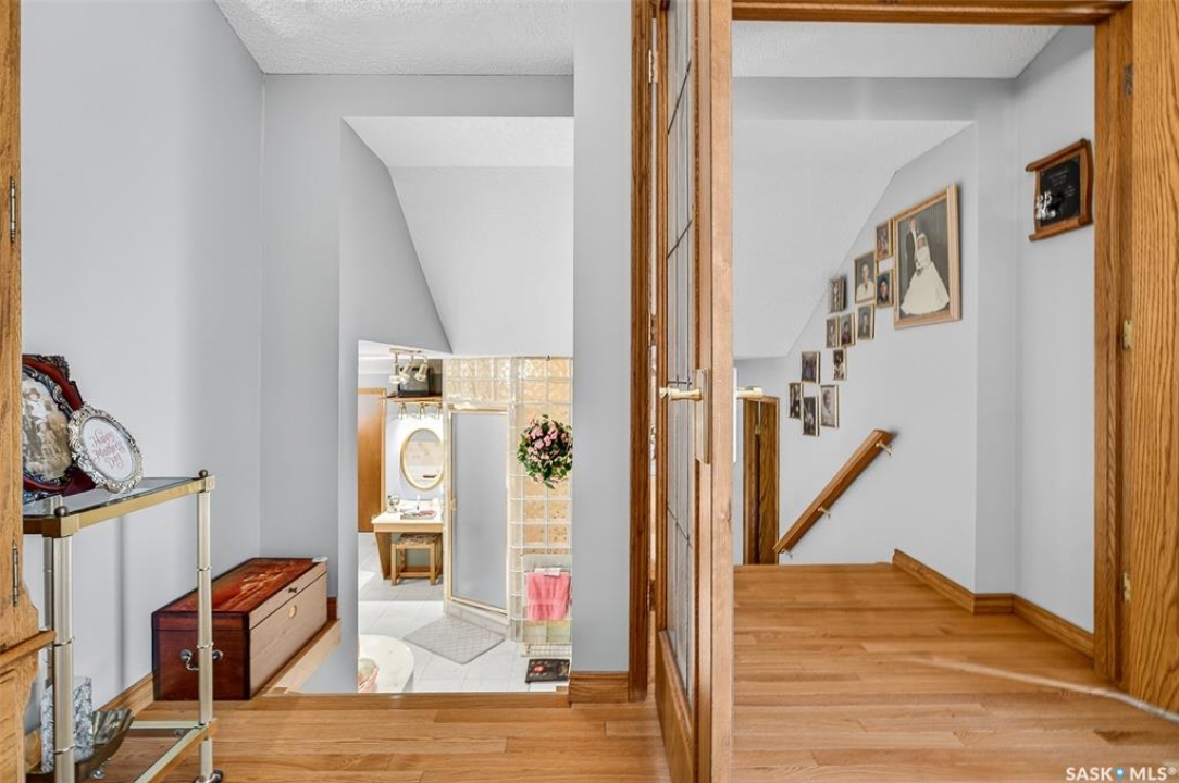 Custom...Comfort...Space!! Perfectly designed space in this modified bi-level home on popular NW crescent. Welcoming immense foyer leads to 3 levels of over 2400 sq feet of elegance. Large living room with bow window flows into a formal dining area with pillars and a bay window. The "chef" kitchen has an abundance of darker cabinetry, pantry, appliances and adjoins a bright southern facing sun room with skylights and overlooks a park-like yard. 2 bedrooms and a full bath complete this level. A few steps up to a custom designed primary bedroom that boasts a fireplace, window seat and mirrored french doors that lead to a 22x9 walk-in closet with built-in dressers, providing a quiet retreat. There's a 5pc ensuite that would make anyone envious with in-floor heat, jetted tub and make-up counters and table. Enjoy the finished basement! Family room has a wet bar, a bedroom/den with a gas fireplace, full bath and utility room. The large laundry/mud room has access to the double heated garage and the back yard oasis. You can access the manicured, fenced back yard from either level. Enjoy the large comfortable deck and patio for relaxing or the brick fireplace/BBQ on those special days!!