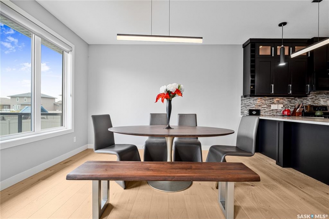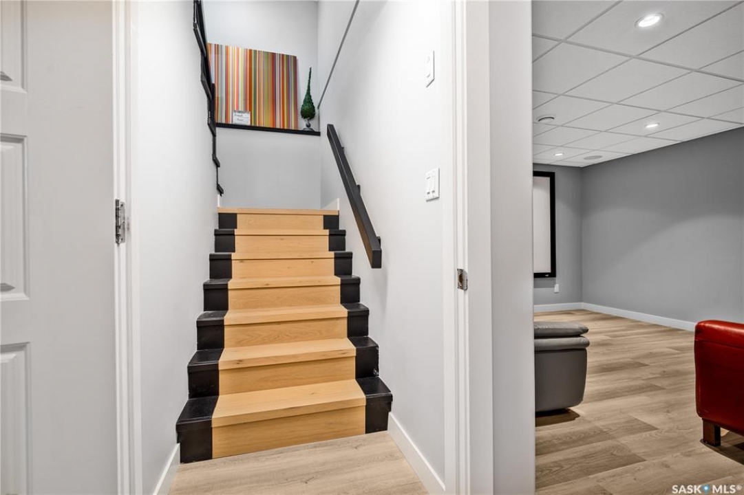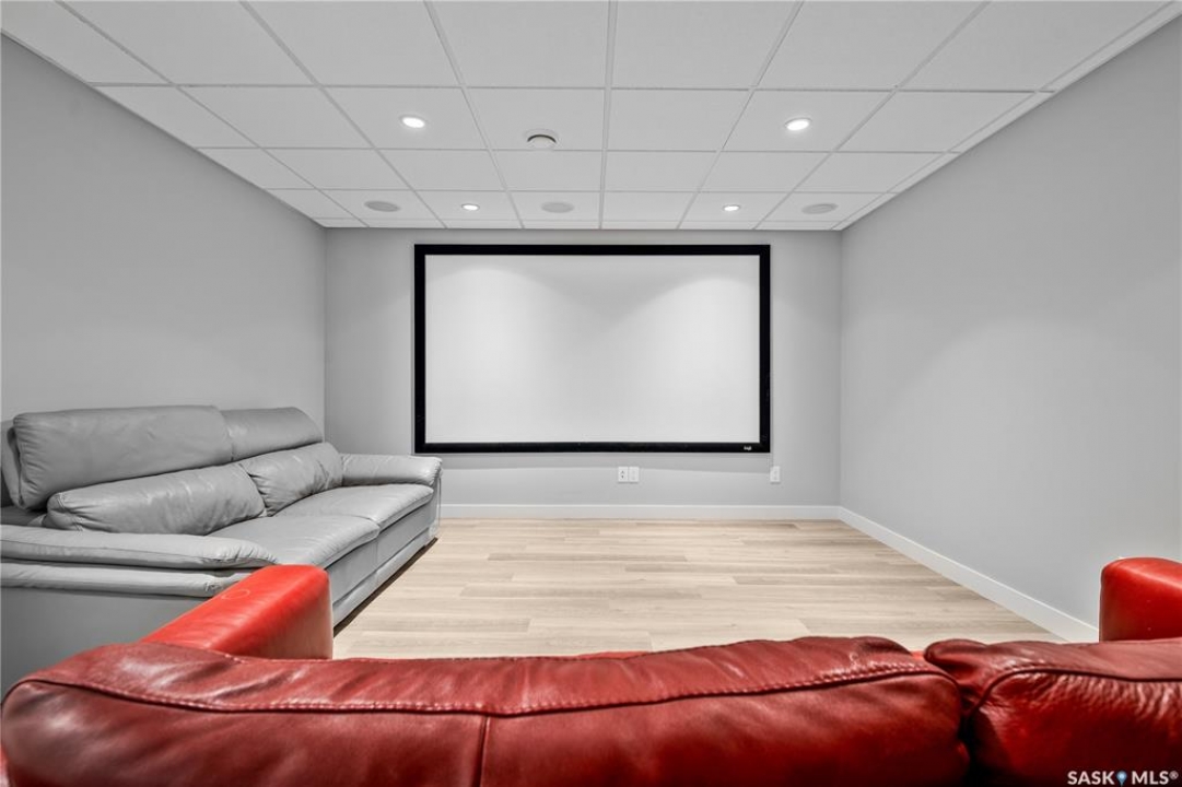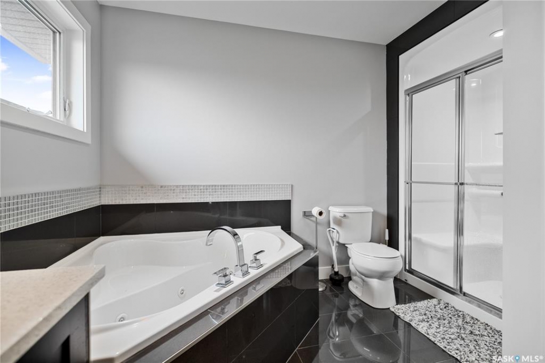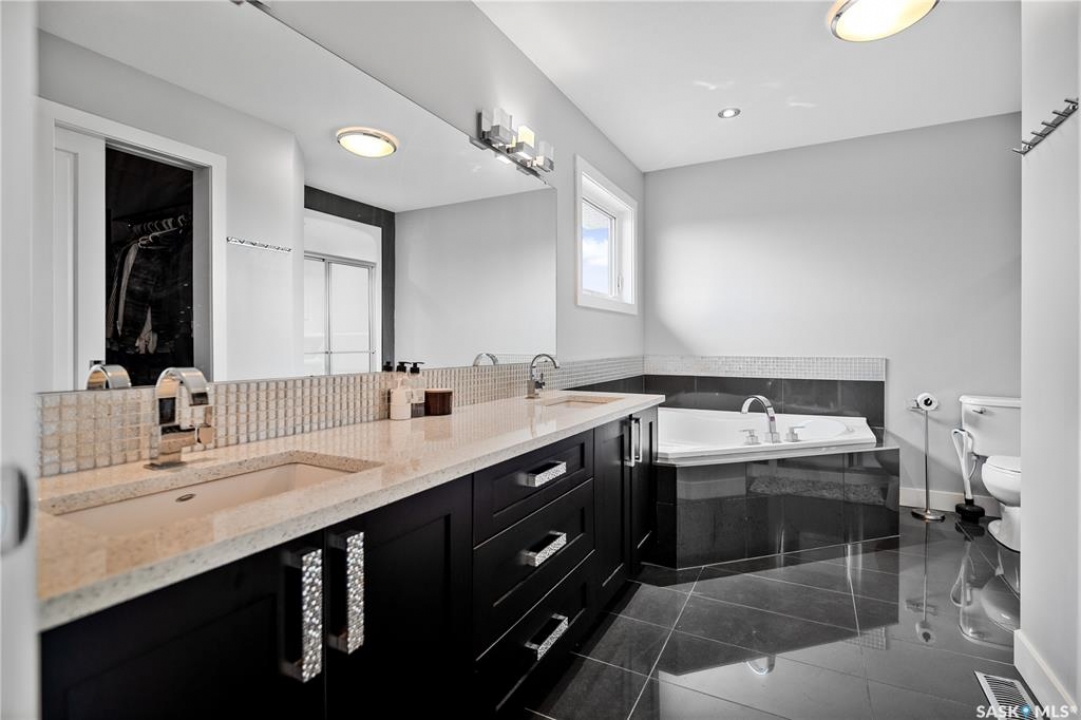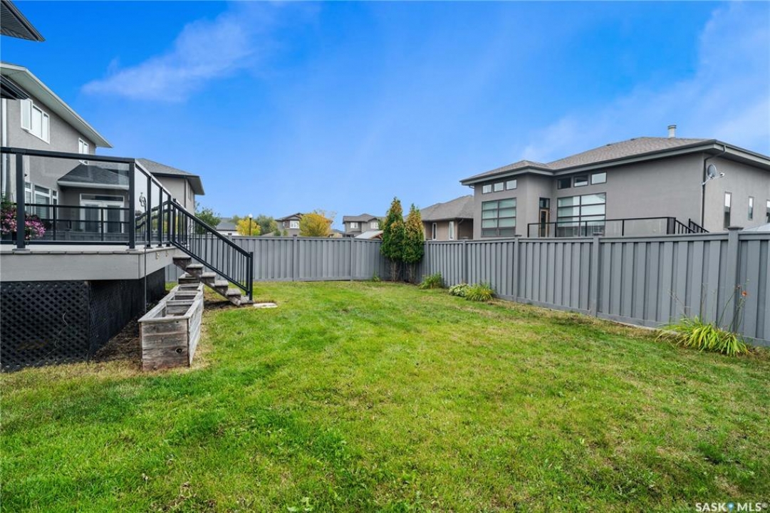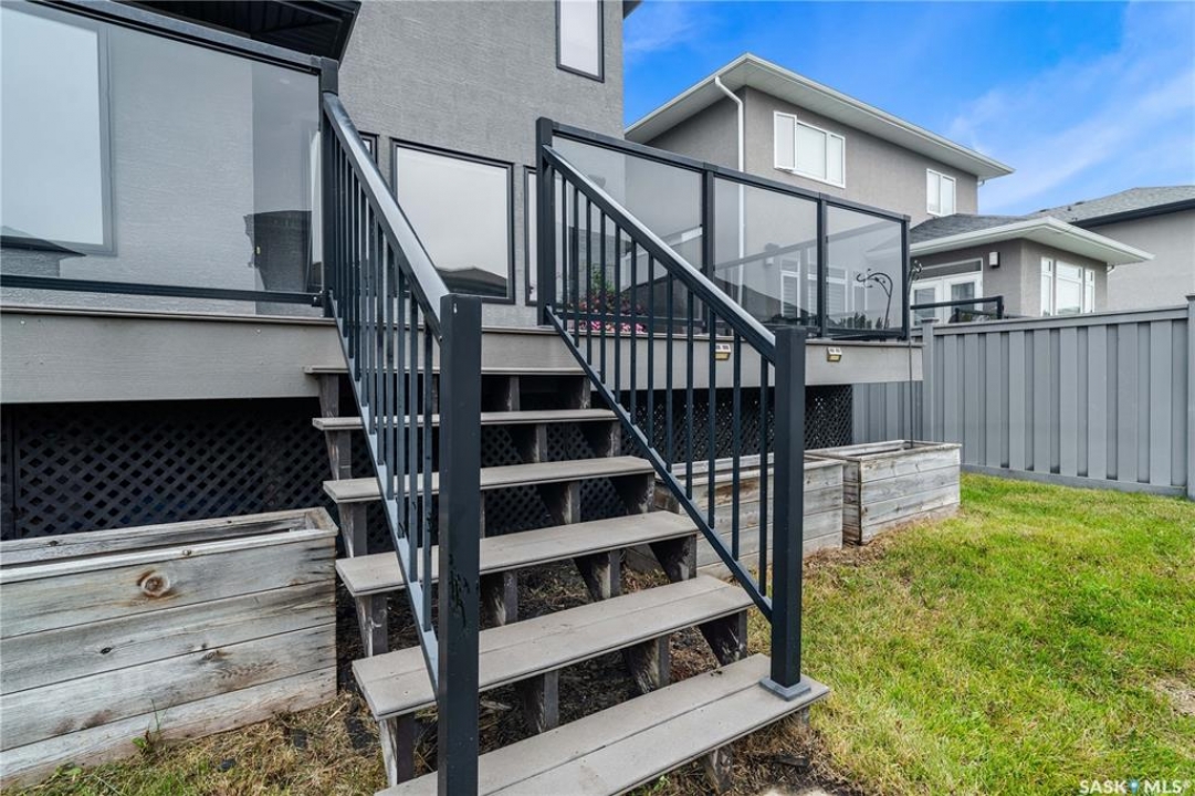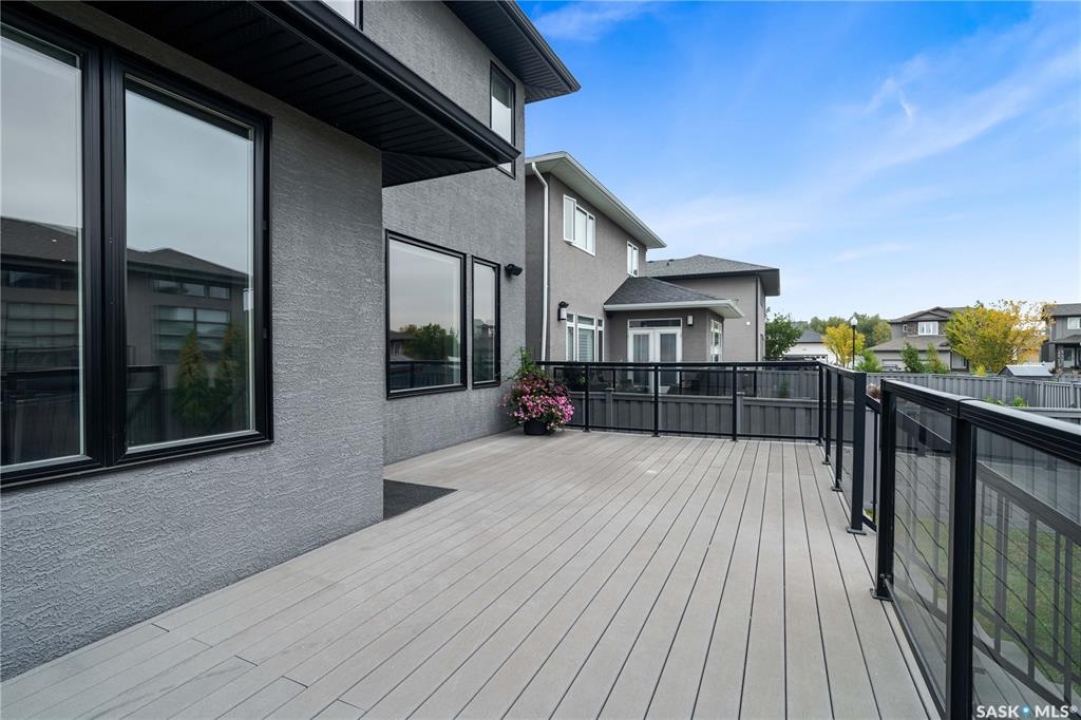 Built by Kratz, this updated 5-bedroom, 3.5-bathroom home in The Creeks blends modern style with everyday comfort—featuring carpet-free living throughout. A spacious foyer welcomes you into the main floor, highlighted by 9' ceilings, engineered hardwood flooring, and a cozy gas fireplace. The kitchen features dark maple cabinetry with soft-close drawers, quartz countertops, a granite sink, stainless steel appliances, and convenient direct access from the garage to the pantry—perfect for unloading groceries. The bright living and dining area opens onto an impressive 25' x 14' oversized deck with glass railing and built-in garden boxes (included as-is), creating an ideal space for entertaining. Professionally installed in-ceiling speakers enhance both the indoor living area and the outdoor deck. The fully fenced yard features low-maintenance TREX/PVC fencing, mature landscaping with vibrant perennials, and a garden shed. Upstairs, a striking open staircase with glass and engineered wood leads to a spacious bonus room, pre-wired for surround sound (speakers not included)—perfect as a media room, office, or family space. The luxurious primary suite includes a walk-in closet and spa-inspired ensuite with heated floors, dual sinks, a jetted tub, and an oversized shower. Two additional bedrooms and a full bathroom complete this level. The professionally developed basement offers a large theatre-style recreation room with a built-in projector screen and projector —ideal for movie nights or entertaining—along with two additional bedrooms, a � bath, and ample storage space. The heated triple garage includes a single-bay partition wall and a rear overhead door providing access to the yard—well-suited for a workshop or home-based business. Additional features include central air conditioning, central vacuum, motion sensor lighting, and dimmer switches throughout the bathrooms, laundry, and pantry. Book your private viewing with your agent today.