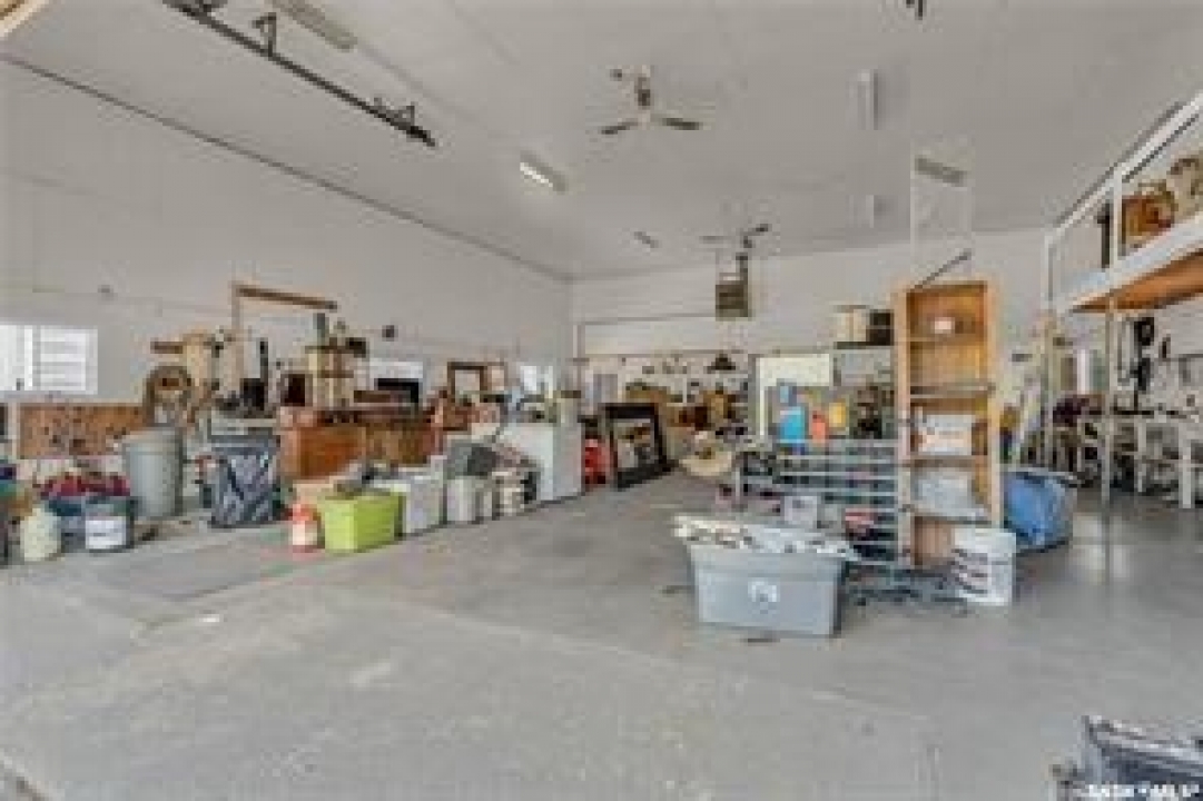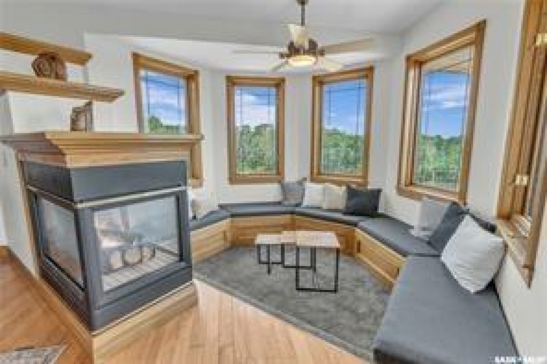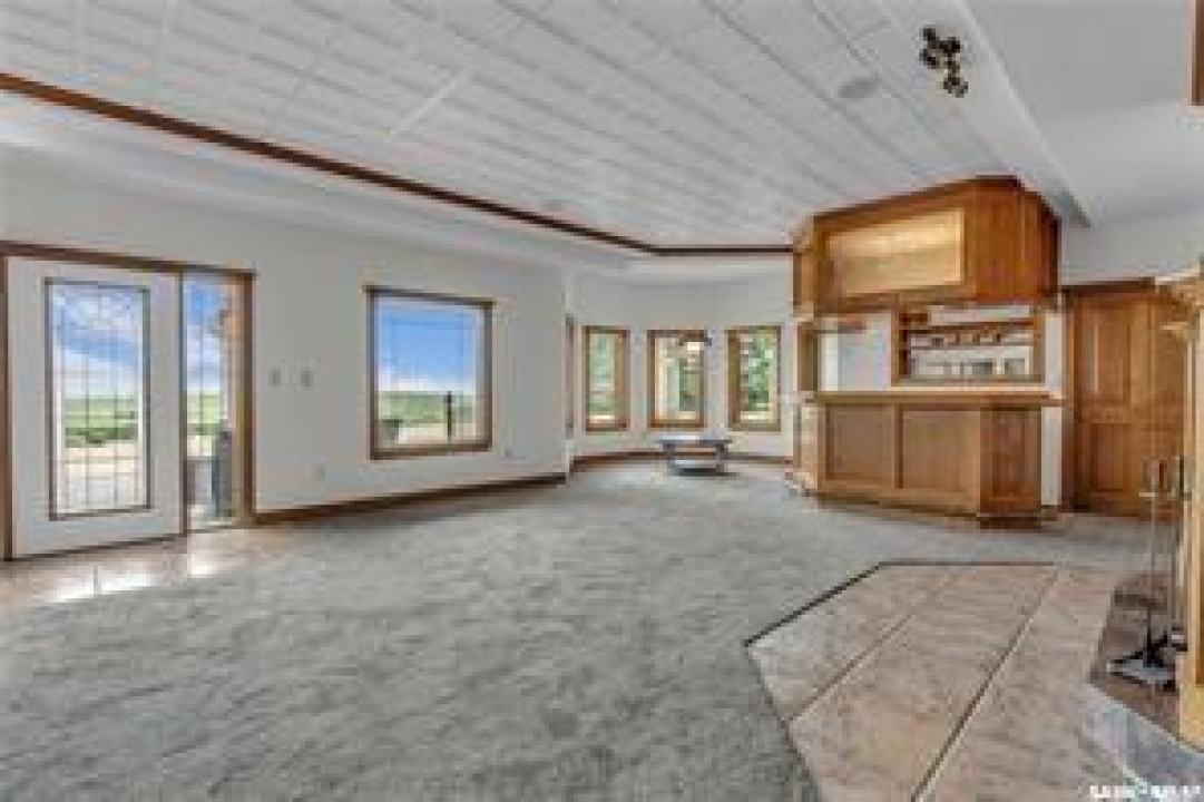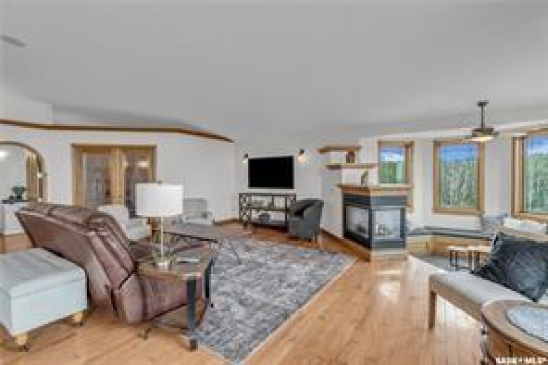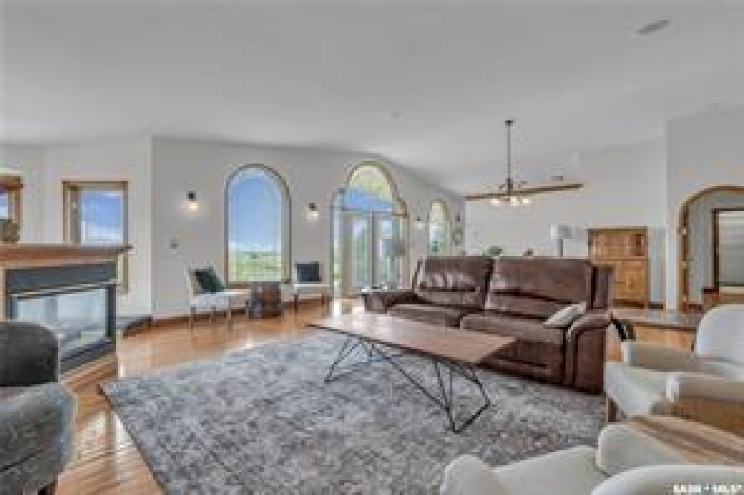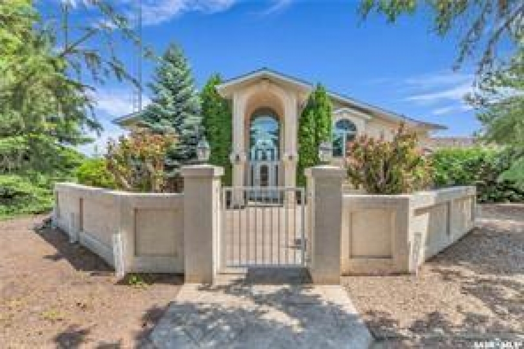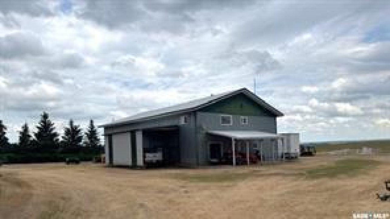 Welcome to your own private equestrian retreat! This breathtaking 79-acre property, a stone's throw from the Battlefords, offers the perfect blend of luxury, comfort, & functionality. Whether you're a horse enthusiast or simply seeking tranquility in nature, this pristine acreage promises the ultimate lifestyle. When you arrive, you're greeted by a grand courtyard entrance, setting a tone of elegance. The open floor plan boasts abundant natural light, between living areas, making this home perfect for entertaining. A stunning three-sided fireplace is the centerpiece of the living space, providing warmth & ambiance on chilly evenings. This spacious four-bedroom, three-and-a-half-bathroom home is designed with both beauty and convenience in mind. The wet bar is perfect for hosting friends & family, while the large entertainment areas, inside & out, offer plenty of room for gatherings. The lower level has a feature wall including a 75-inch Samsung frame TV with non-reflective screen that displays wall art when not in use, surround sound speakers are located on the wall & outside on the deck. The walkout basement extends your living space into the serene outdoors, where a beautiful pond and gazebo await, creating a backdrop for relaxation & peaceful reflection. The property is also a dream for horse lovers, with an impressive barn, stables, riding arena—everything you need to keep your horses in top shape & enjoy the equestrian lifestyle to the fullest. The tranquil surroundings, including the lush fields & serene pond area, create the ideal setting for both you & your animals. This is more than just an acreage—it's a lifestyle. Whether you're riding, relaxing by the pond, or entertaining guests in your beautiful home, you'll experience the ultimate in country living & all the amenities you need. A 48x 40 heated shop also includes living quarters for a hired hand or a guest space for family & friends. The entry to the property has a large, controlled iron gate.