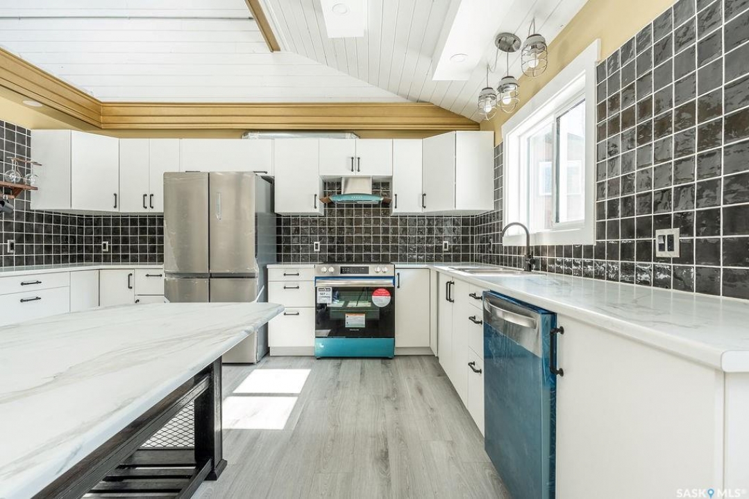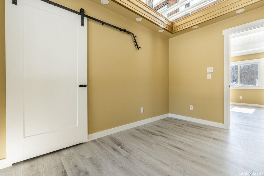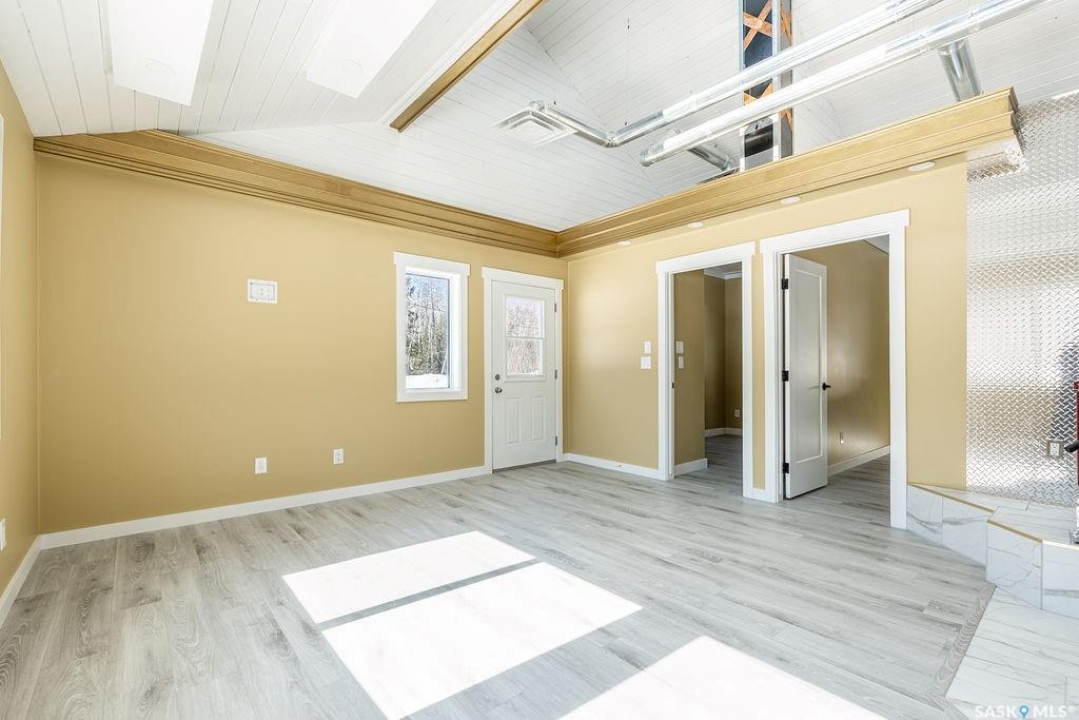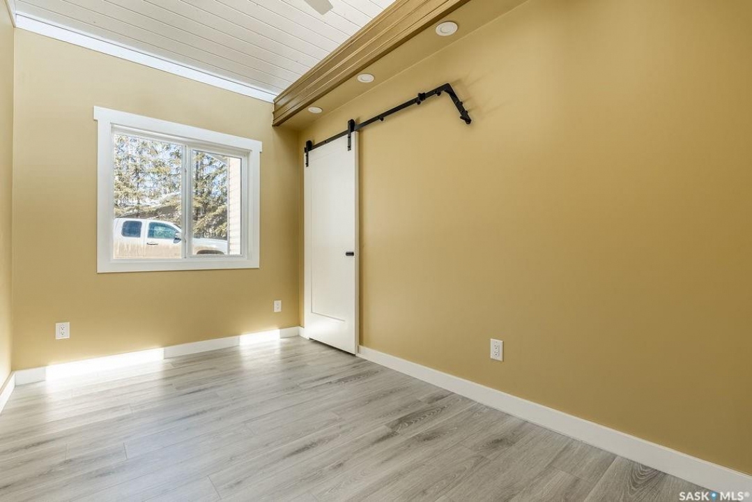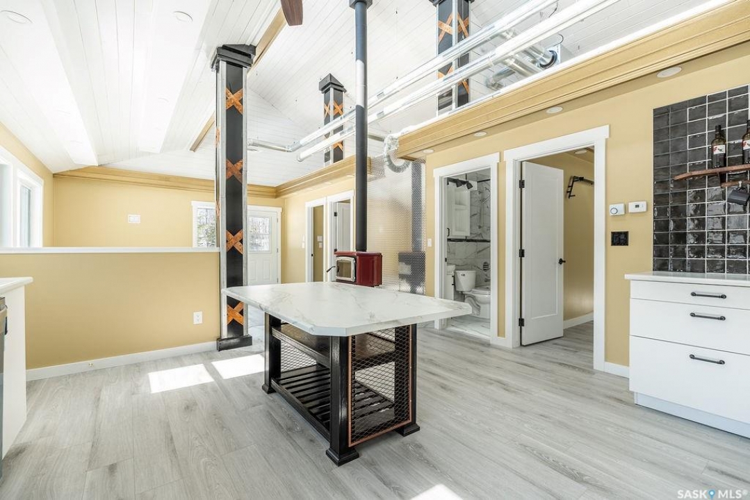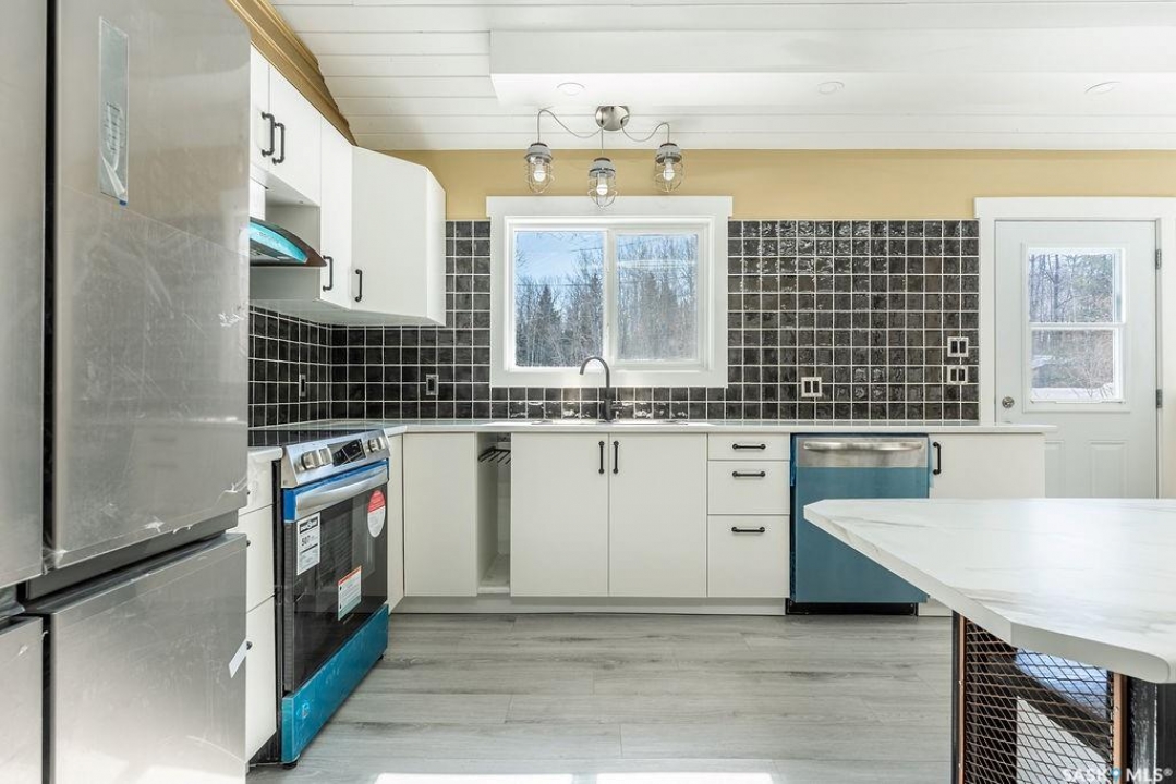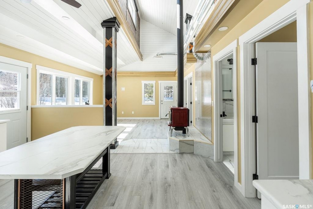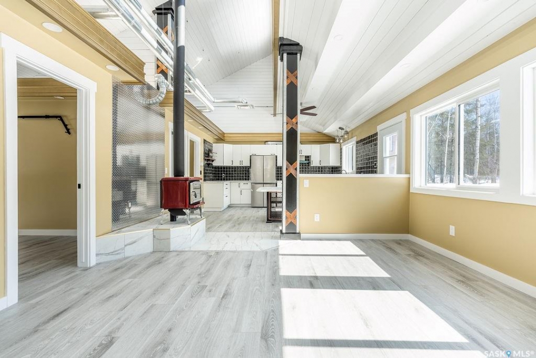 Welcome to 1 May Bay in Pickerel Point at Delaronde Lake — a brand new, never-lived-in cabin that perfectly blends modern industrial style with the peaceful beauty of lake life. This stunning 998 sq. ft. cabin features 3 bedrooms and 1 full bathroom, designed for comfort, style, and easy living. Step inside and you'll immediately notice the impressive 18-ft vaulted ceilings and the abundance of windows that fill the space with natural light. The upper windows are equipped with electric blinds for convenience and comfort. The kitchen is beautifully finished with an eat-up island, brand new stainless steel appliances, and soft-close cabinetry throughout, while extra pot lights have been added across the home to create a bright, welcoming space day or night. Each bedroom includes its own closet with a custom-built barn door complete with coat hooks, adding both character and functionality. The living room features a striking red porcelain wood stove, creating a cozy focal point for cooler evenings. Heated floors run throughout the entire cabin, and vinyl plank flooring makes for durable, low-maintenance living. Custom gold trim accents around the rooms add a unique and stylish finishing touch. The cabin also includes in-home laundry for everyday convenience. Outside, the property offers plenty of space with room to build a future garage, a long gravel driveway perfect for parking RVs and boats, and a gravel patio area ready for outdoor entertaining. The yard is beautifully natural with bush, Saskatoon berry bushes, and newly planted oak trees. Located just a short walk to the water, marina, and boat dock, this property is part of a fantastic lake community and is the perfect place for boating, fishing, relaxing, and making memories year-round.