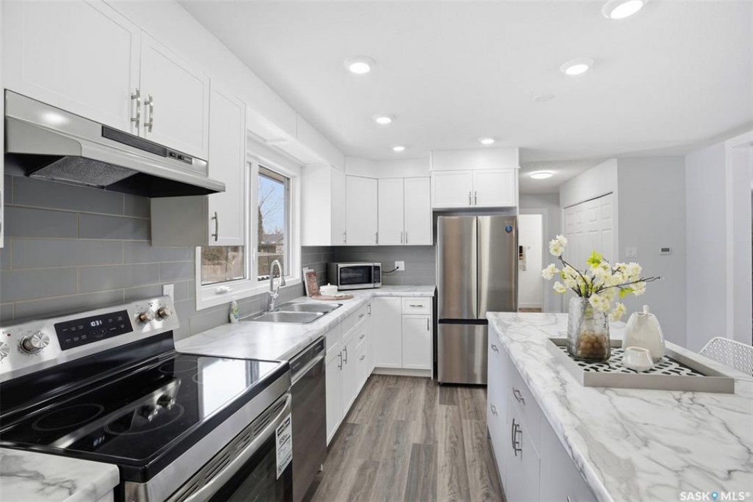 Welcome to 102 Dore Crescent in Lawson Heights, a spacious 1,500 square foot bungalow with a functional layout and a long list of recent updates. The main floor offers an open concept living, dining, and kitchen space that feels connected and easy to live in. The fully renovated kitchen features new cabinetry, new countertops, a stylish backsplash, and new appliances, along with pot lights that brighten the space. It flows naturally into the main living area where a new railing adds a clean, modern touch. Throughout the home you'll find new flooring, fresh paint, updated trim and baseboards, and new light fixtures. All of the bathrooms feature new vanities, and the ensuite has been upgraded with new tile in the shower. The main floor is completed with three bedrooms and 2.5 bathrooms, providing a layout that works well for families. The basement adds even more versatility, featuring a large family room with a wet bar, an additional bedroom, and a full bathroom. Four separate flex spaces offer endless options for home offices, playrooms, workout areas, or the potential for additional bedrooms. A separate entrance to the basement creates added flexibility depending on your needs. Additional updates include a new HRV system, along with window wells added to the basement windows and new eavestroughs completed approximately two years ago. Outside, the property includes a single attached garage and a large driveway with plenty of additional parking. Located within walking distance to Lawson Heights School, St. George School, and Marion Graham Collegiate, and just steps from the river, this home offers an unbeatable location. With close proximity to all amenities and quick access to Circle Drive, getting around the city is simple and convenient. If you're looking for a well-maintained, updated home in a mature neighbourhood with space to grow, 102 Dore Crescent is one to see.