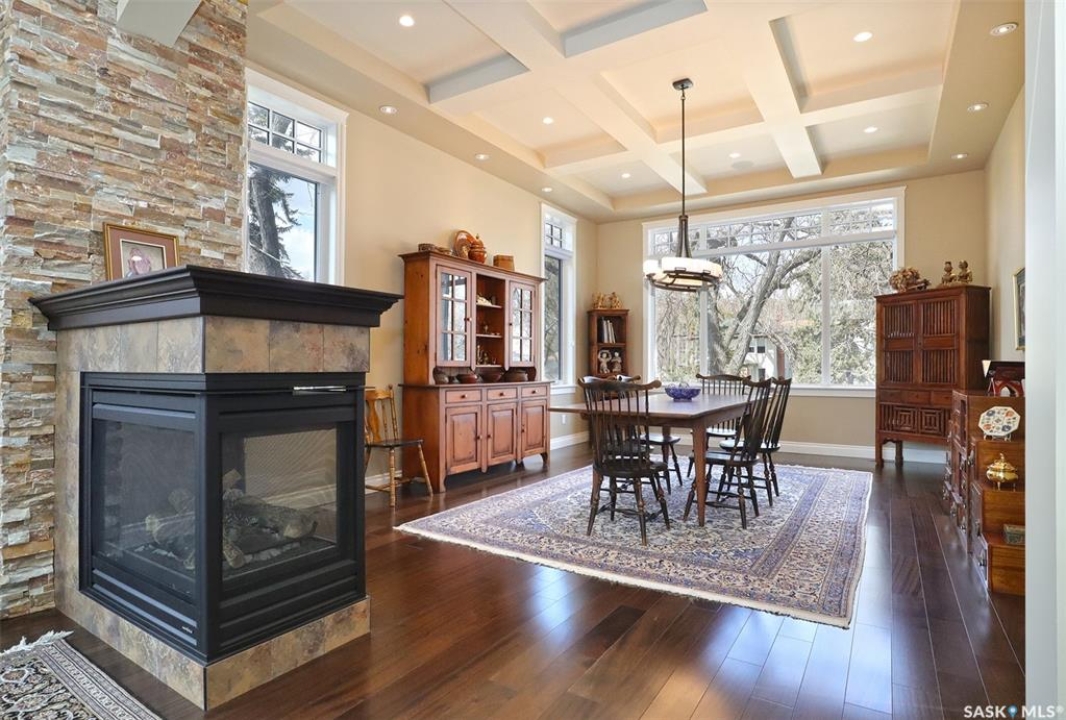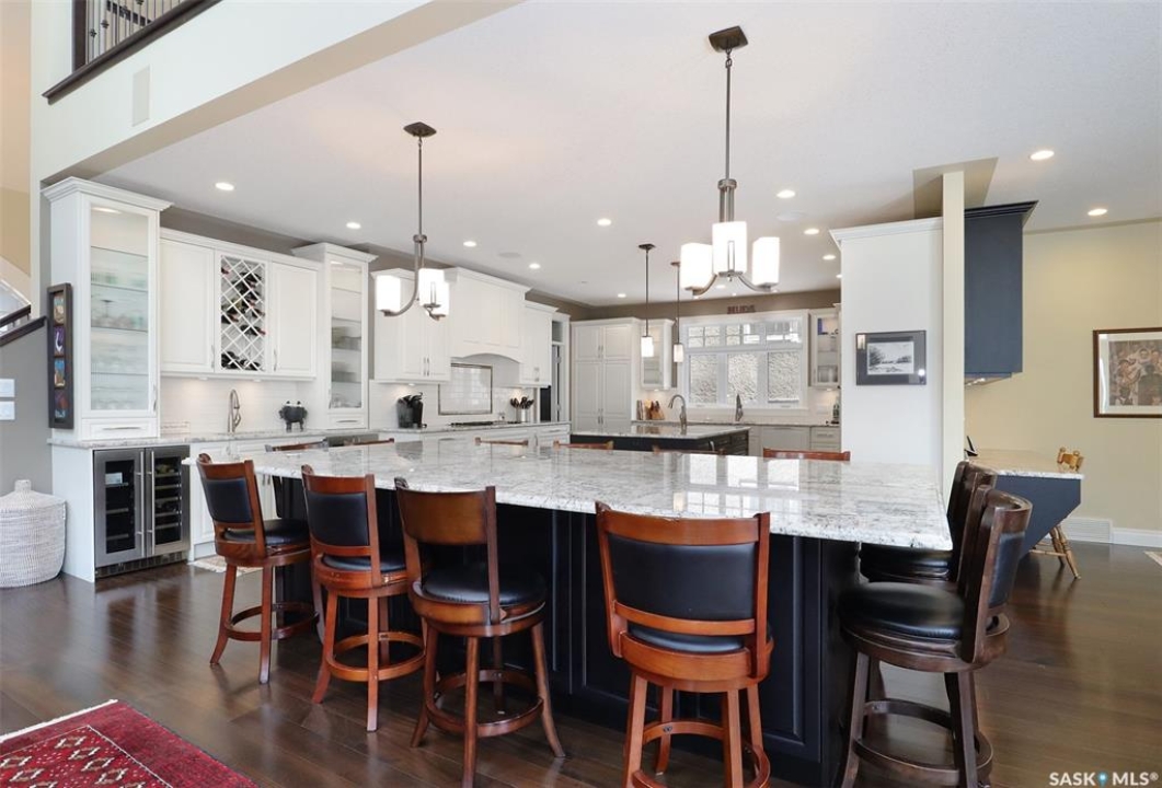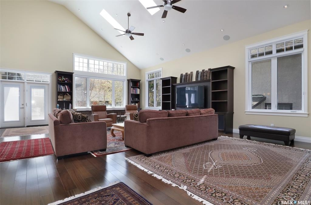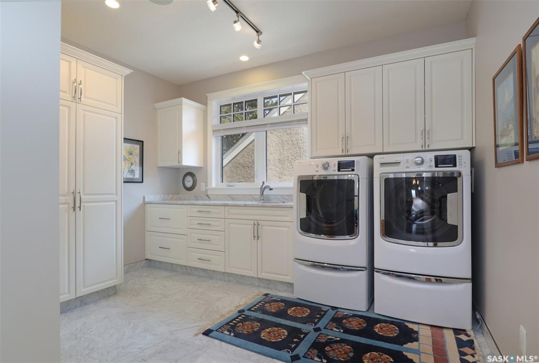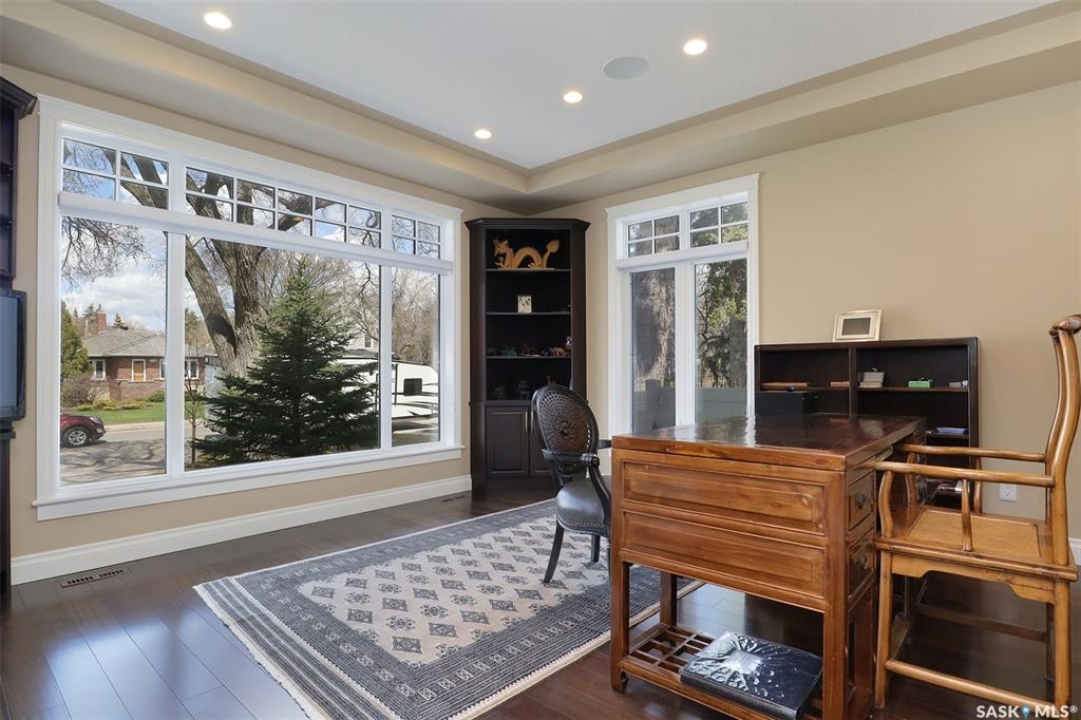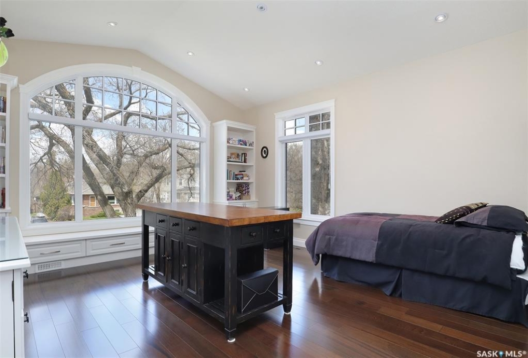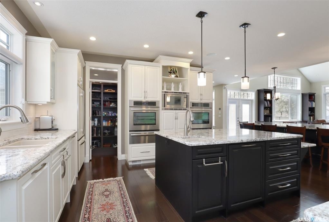 One of kind custom built by Ripplinger Homes a stunning 4100 sq. ft. on 2 levels located on one of the prestigious streets of Regina, within walking distance to Wascana Park. Attention to detail throughout the entire home from pilings under the foundation to top of the line fixtures. Entering the home you are greeted by 2-4 foot leaded glass doors leading into the grand foyer. A large walk-in closet and adjacent is the office. Flooring throughout the house is engineered Brazilian hardwood. The kitchen is a chefs delight: two separate granite top islands, one is a working station and the other will accommodate 12 people comfortably. there are 2 wall ovens, 2 built-in dishwashers, 2 walk-in pantries flanked on each side of the preparation area. 2 new wine coolers, 2 garden doors leading onto a covered 12x16 deck with radiant heat, a remote controlled screen to protect the covered area from the elements. 24x24 slate flooring deck. The formal dining room has a 11 foot ceiling with a 3 sided gas fireplace. Vaulted ceilings in the great room boasting sky lights allowing natural sunlight in throughout the day. The primary bedroom features a 5 pce. ensuite with in floor heated marble floors. Large walk-in closet and garden door leading onto a private balcony. There is a 2nd bedroom, laundry room and loft on the upper level. The lower level is professionally developed by the builder with an additional 2000 sq. ft and 9 foot ceilings featuring 3 additional bedrooms, den, 2-4 pce bathrooms, laundry room, large storage room and mechanical room. The rec. room provides the new owner with a walk up granite top bar with a built-in dishwasher, microwave, wine cooler and fridge. Gas fireplace in the lounging area, plenty of storage room complete with 2 high energy gas furnaces, 2 air handlers, on demand hot water heater, in floor heat, control 4 sound system throughout the house, 2 air conditioners, 200 amp and 100 amp service. 3 car heated attached garage.