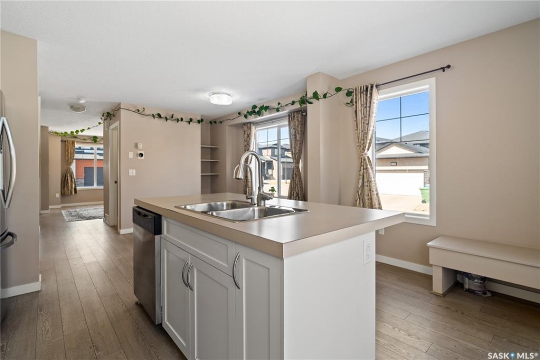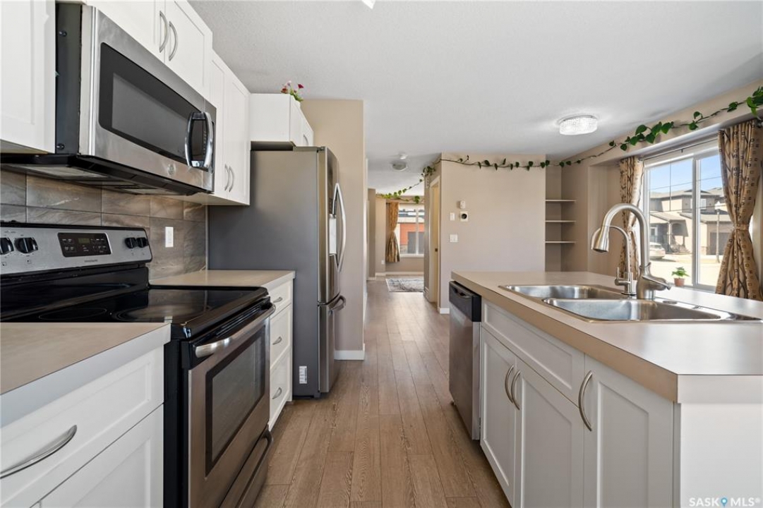 Welcome to this stunning corner unit nestled on a desirable lot in Regina's Harbour Landing, ideally located just steps from Norseman Park, one of the city's largest parks offering a wide range of outdoor activities. This beautifully maintained two-storey home is filled with natural light and offers 4 bedrooms and 3.5 bathrooms, perfectly blending style and functionality. The main floor features a bright and inviting living room, a spacious dining area, a convenient 2-piece bathroom, and a fully equipped kitchen with extra windows, stylish cabinetry, durable countertops, and stainless steel appliances. Upstairs, you will find a generous primary bedroom complete with a private ensuite, along with two additional well-sized bedrooms and a full 4-piece bathroom, as well as a second-floor laundry rough-in for added convenience. The fully finished basement provides excellent additional living space with a large great room, an extra bedroom, and a 3-piece bathroom, making it ideal for guests or extended family. Outside, enjoy a beautifully finished backyard with a patio, perfect for relaxing or entertaining, along with a 2-car detached garage. Additional features include all equipment owned and a tankless (on-demand) water heater for added efficiency. This move-in ready home is a fantastic opportunity in a sought-after location, close to parks, schools, and transit. Contact your REALTOR � today to schedule your private showing.