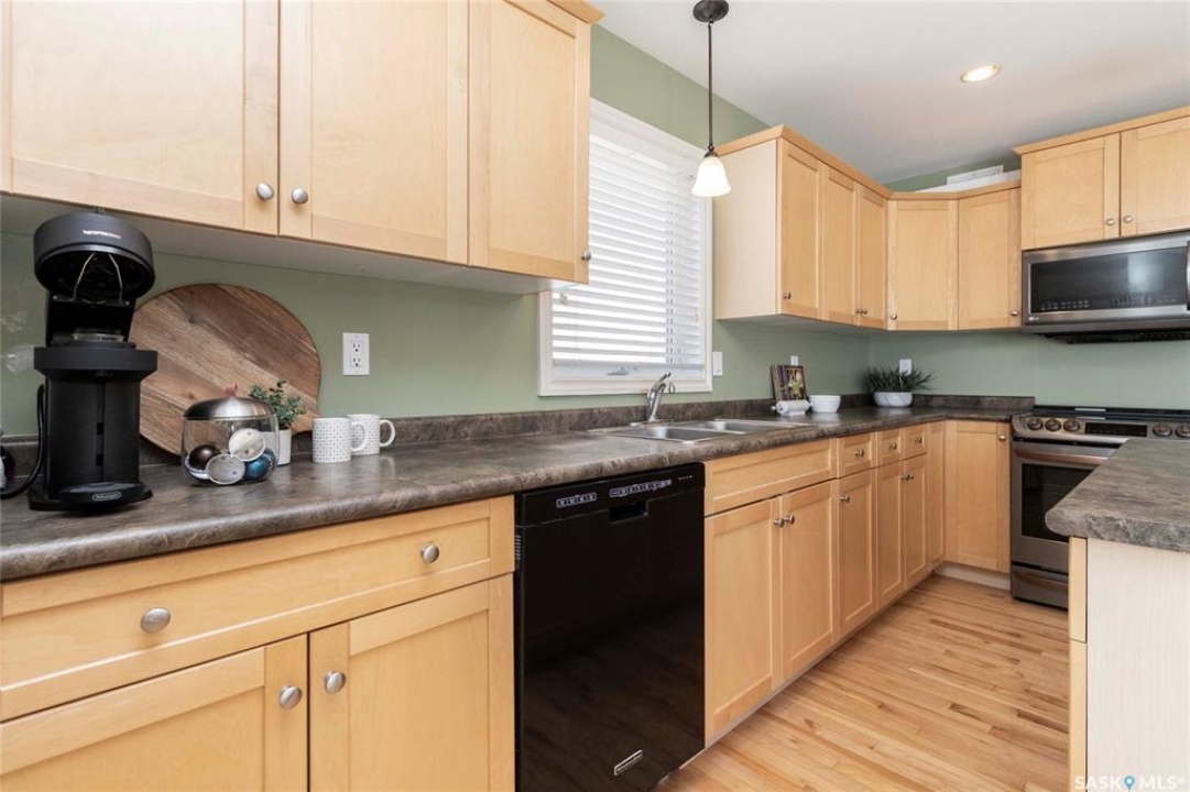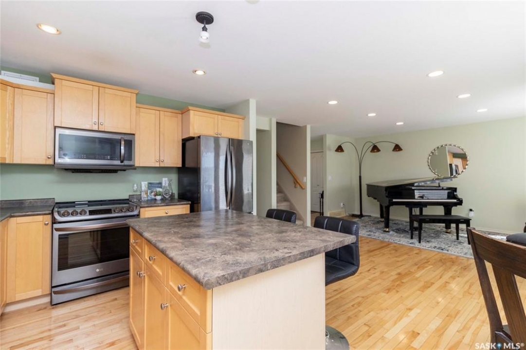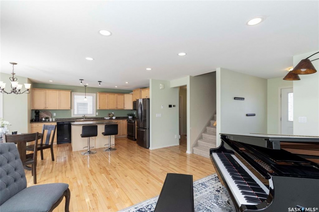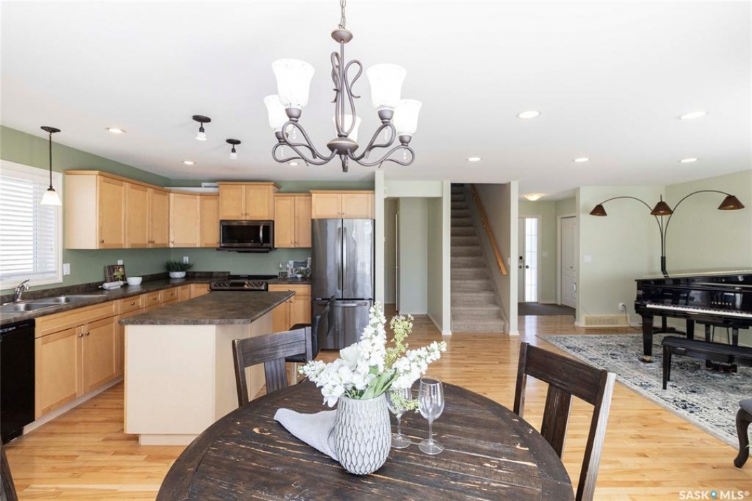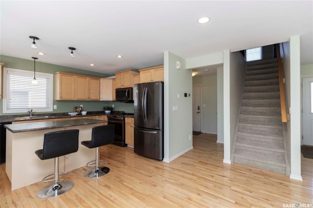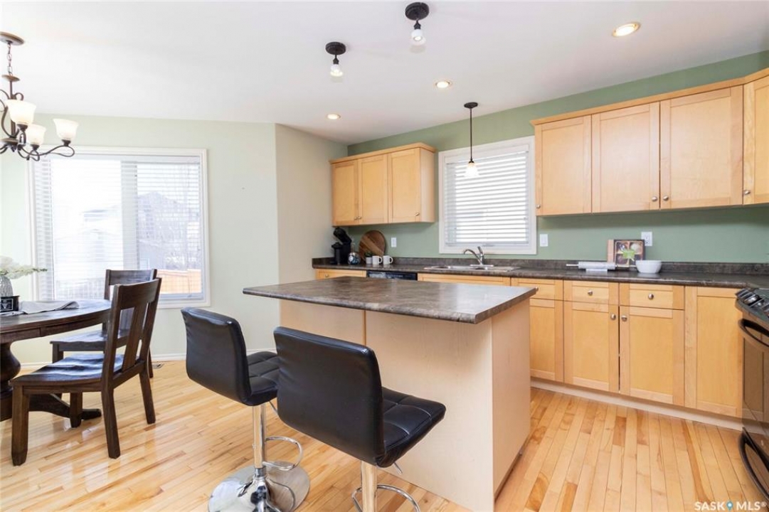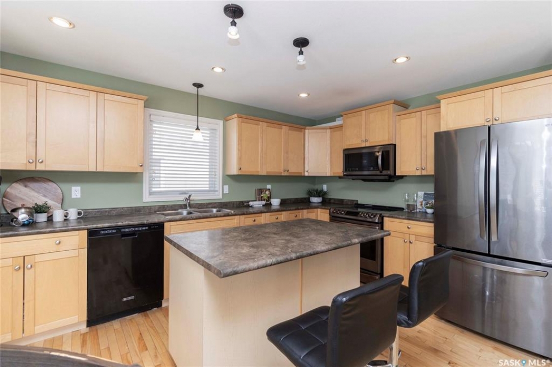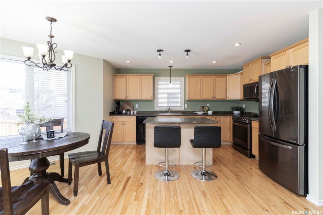 Welcome to this two-storey home in the highly sought-after Stonebridge neighbourhood, offering over 1,700 sq ft above grade plus a fully finished basement—perfect for families seeking space, comfort, and value. The bright, open-concept main floor features hardwood flooring, a spacious living room, and a functional kitchen with maple cabinetry, island with eating ledge, and abundant storage. The adjoining dining area is filled with natural light from large windows and provides direct access to the deck and fully landscaped, fenced backyard—ideal for entertaining. A convenient main-floor laundry and direct entry to the insulated double attached garage add everyday practicality. Upstairs, you'll find a generous bonus room with a cozy gas fireplace, along with three bedrooms including a spacious primary suite complete with a walk-in closet and private 3-piece ensuite. A full bathroom featuring a jetted tub and slate tile surround completes the upper level. The finished basement offers excellent additional living space with a large family/recreation room, an extra bedroom, and a full bathroom. Outside, enjoy a beautifully landscaped yard with mature trees, shrubs, and a sandbox. Ideally located close to parks, schools, and all amenities, this home delivers the perfect blend of style, function, and location—an exceptional opportunity in a family-friendly community.