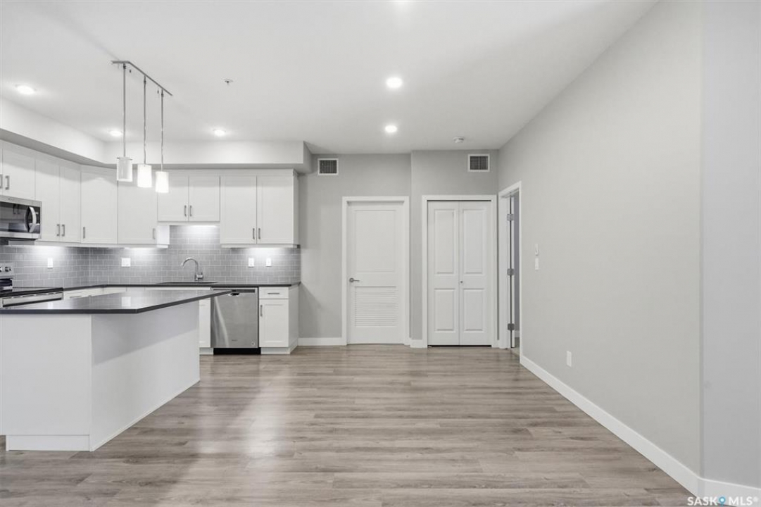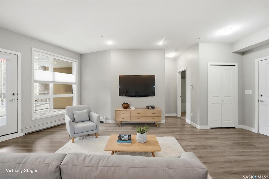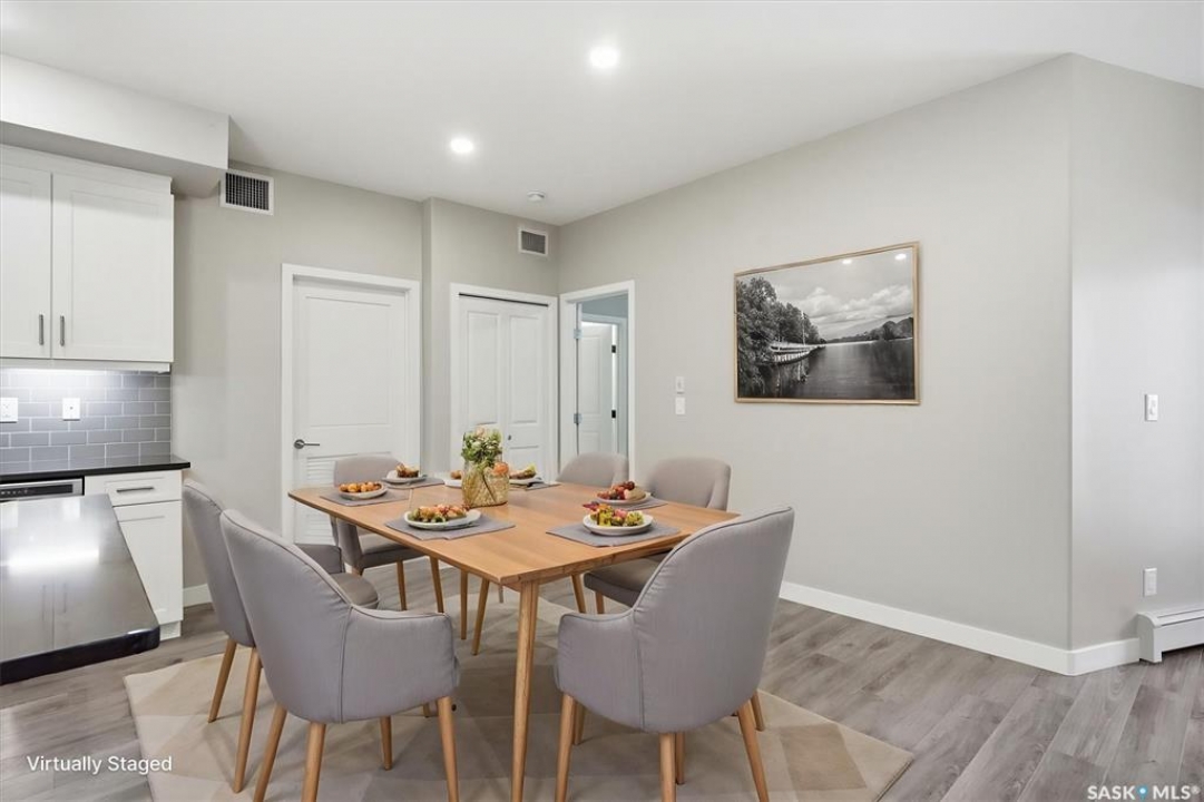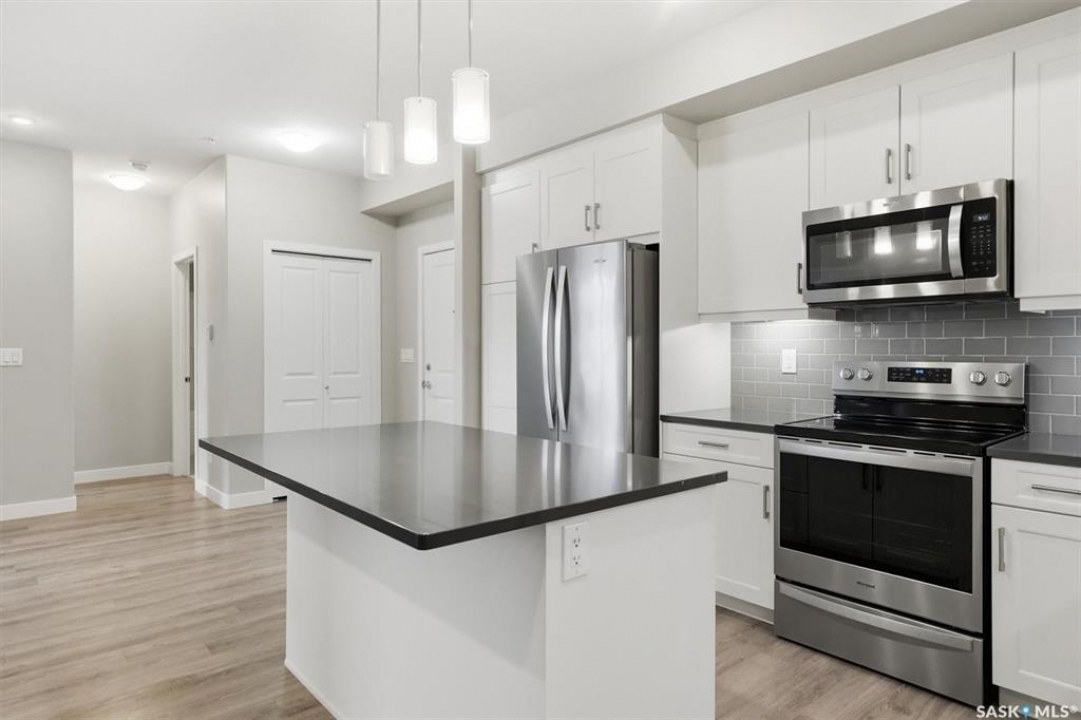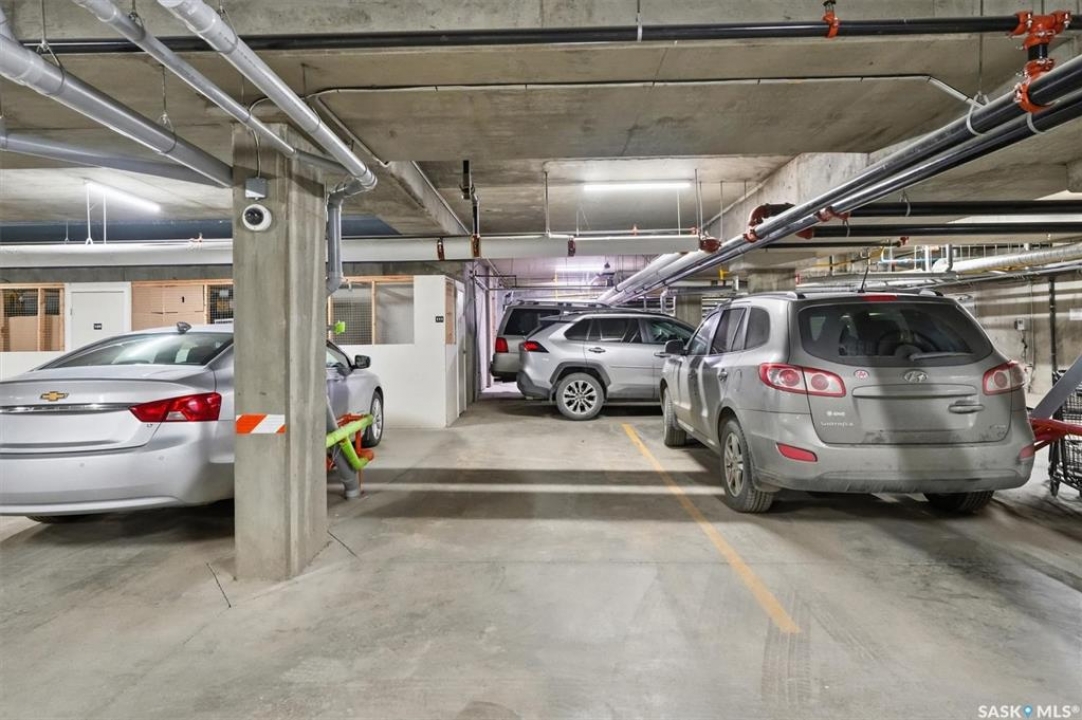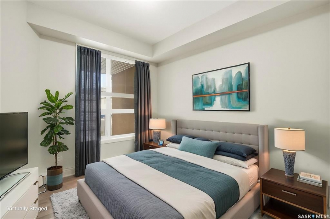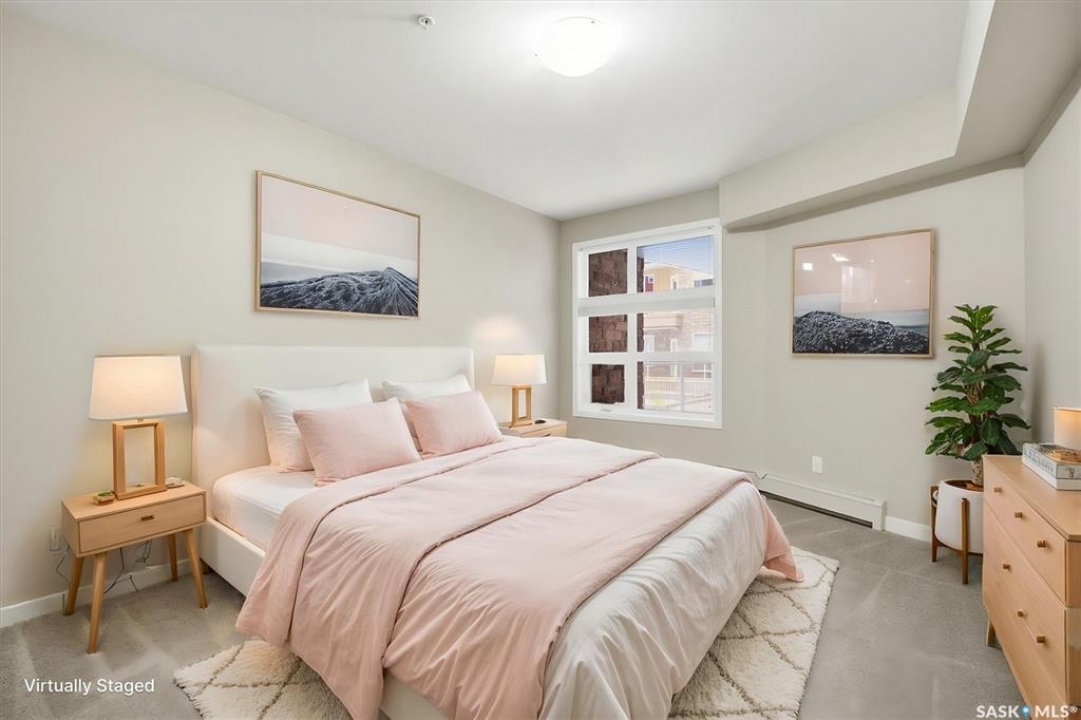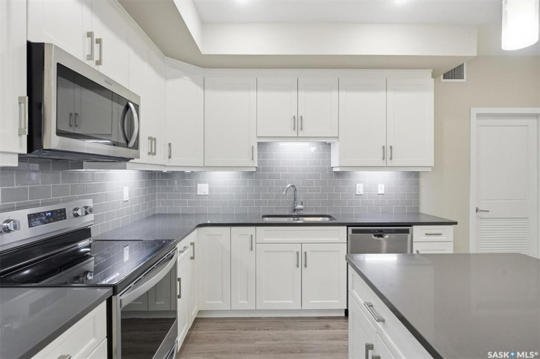 Experience easy living in this well-appointed 2-bedroom condo in The Bentley, a sought-after River Heights complex. The bright, open-concept layout centres around a stylish kitchen featuring quartz countertops, tile backsplash, soft-close cabinetry, under-cabinet lighting, and 4 stainless steel appliances. A pantry cabinet with rollout drawers adds functional storage, while the eat-up island is perfect for casual meals. There's ample space for both a dining table and additional furniture without feeling crowded. The living room is warm and inviting, with oversized windows, up/down blinds, and dimmable pot lights. Garden doors lead to a large covered balcony with natural gas BBQ hookup—ideal for summer evenings. The spacious primary bedroom is complemented by a 3-piece ensuite, while a second bedroom and full 4-piece bathroom offer flexibility for guests or a home office. A dedicated laundry room with washer and dryer adds everyday convenience. Additional features include one underground parking stall and a heated storage unit in the parkade. Residents enjoy access to a fitness centre, amenities room, and guest suite for overnight visitors. Located just steps from the river and walking paths, and close to shopping, dining, and transit—this is low-maintenance living in a prime location. Perfect for downsizers or investors looking for a solid, well-designed property. Some photos are virtually staged.