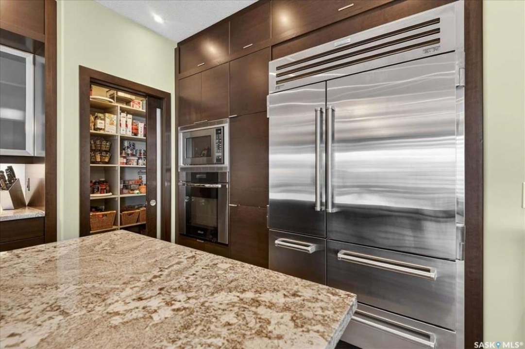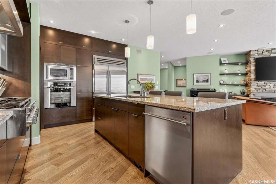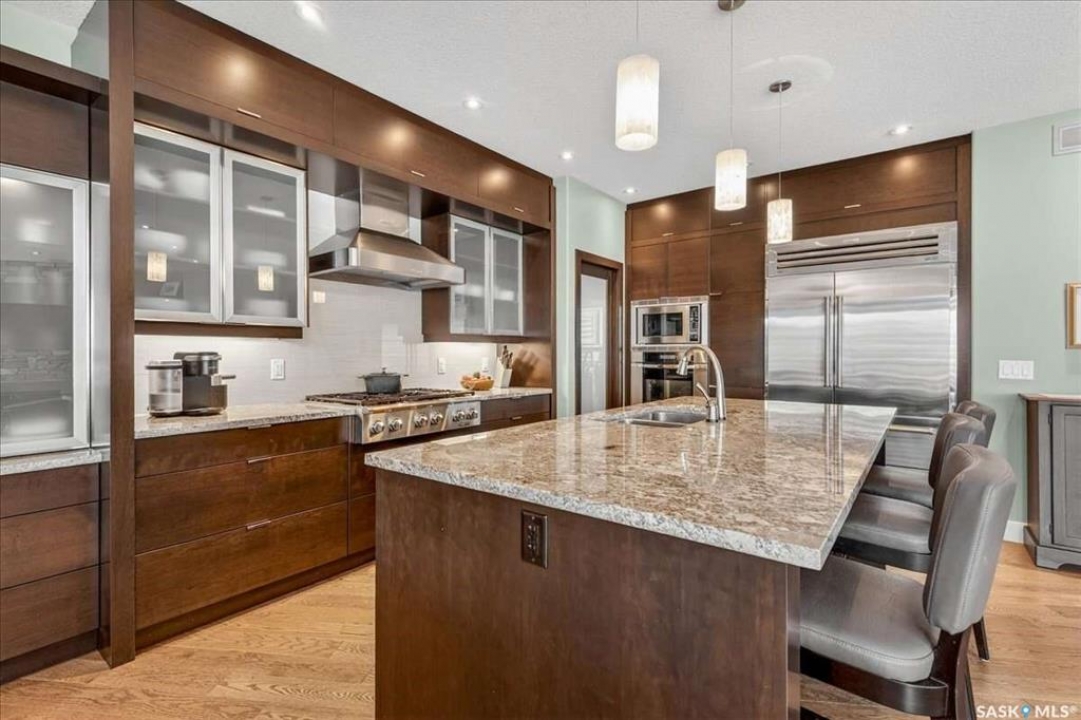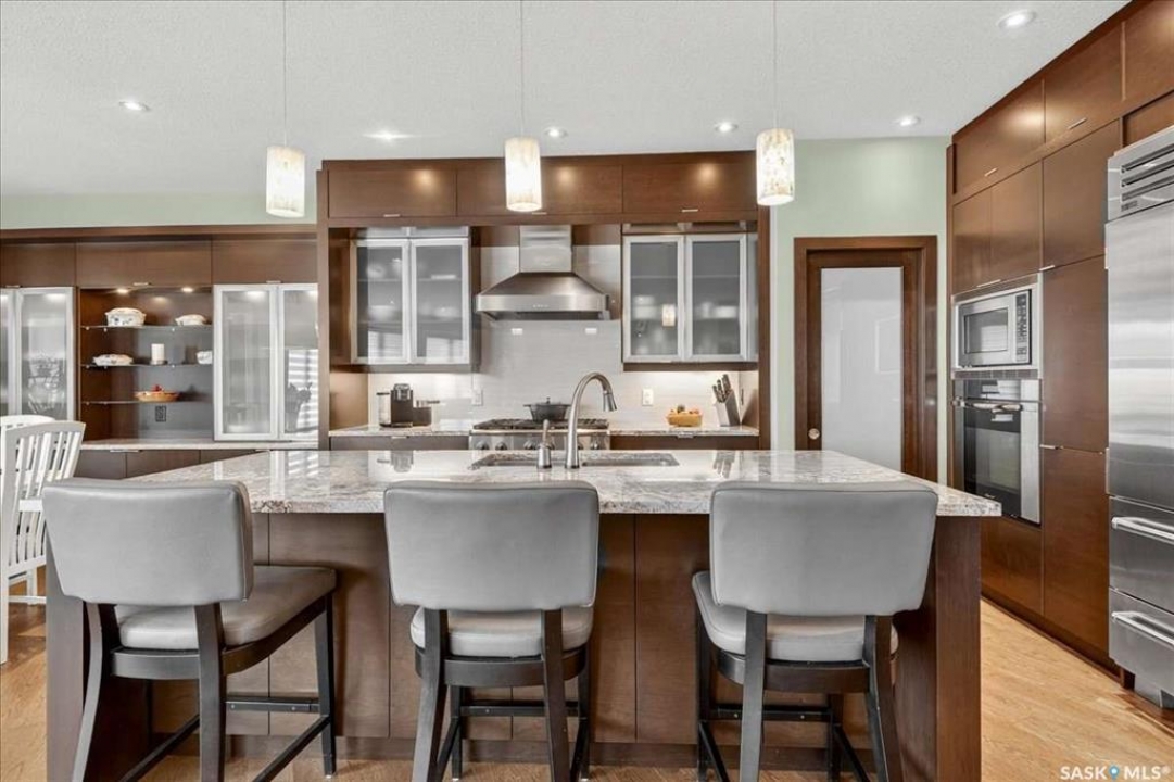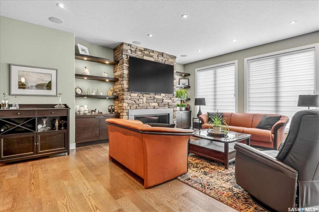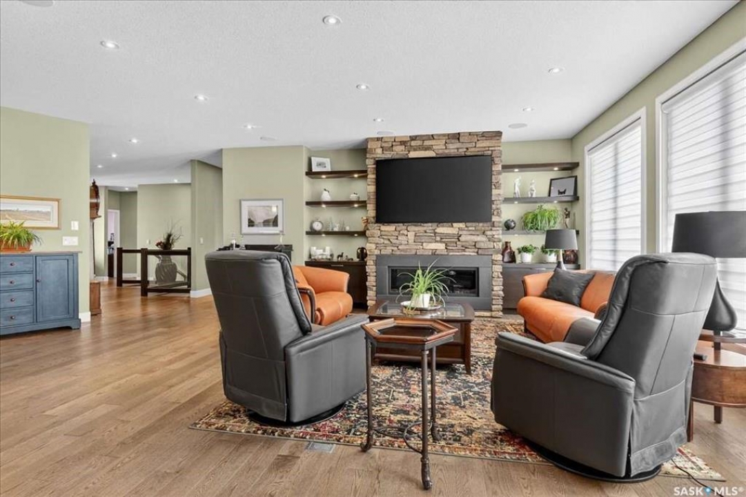 For more information, please click the "More Information" button. 4134 Timber Creek Place, Regina, Saskatchewan S4V 3G7 is a beautifully crafted custom Munro home offering 2,273 sq ft on the main floor, designed with high-end finishes throughout. The home welcomes you with 9-foot ceilings, hardwood flooring, and large windows with electric light-filtering blinds that bring in abundant natural light. The open-concept layout features a spacious living room with a stunning stone gas fireplace, built-in shelving, and cabinetry. The kitchen centers around a large island with granite countertops and includes premium appliances such as a Decro 6-burner gas stove, wall oven, microwave, Sub-Zero fridge/freezer, and a walk-in pantry. The dining area includes matching cabinetry and opens to a four-season sunroom with radiant in-floor heating, along with an adjacent screened and covered space featuring a Hot Springs hot tub. The primary bedroom is generously sized with a large closet and a luxurious ensuite featuring a soaker tub, custom tiled shower, and dual sinks. The main floor also includes an additional bedroom, bathroom, den, and a laundry room with custom cabinetry. The finished basement offers two more bedrooms, a 4-piece bathroom, and a large recreation room with a granite bar and appliances, ideal for entertaining. The mechanical room includes a Control-4 system managing heating, cooling, sound, and TV, plus a Sub-Zero freezer. The garage, basement, and sunroom all feature in-floor heating supported by a Triangle Tube boiler, Navien system, and Bryant furnace. The triple garage includes 15-foot ceilings, epoxy heated floors, and a vehicle lift. Outside features include a patio, planters, mature trees, a Generac generator, gemstone lighting, and a security system, with snow and lawn care handled by the bare-land strata.