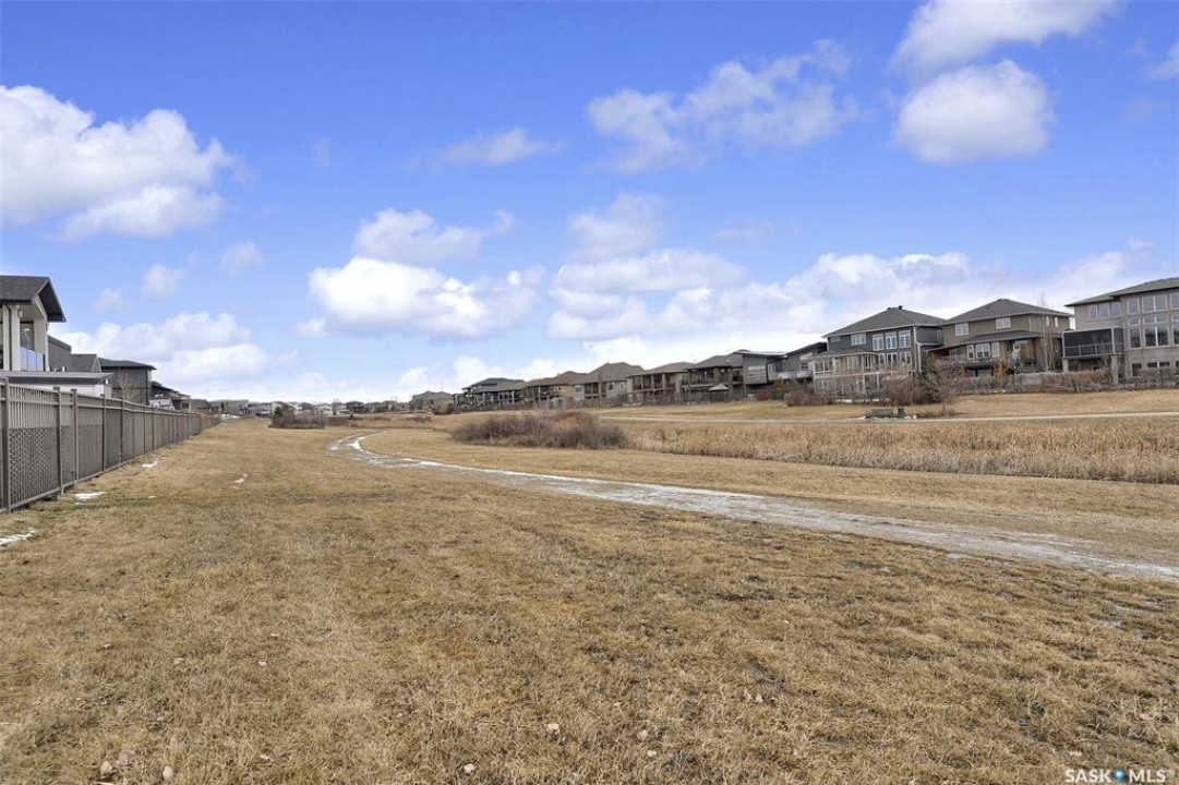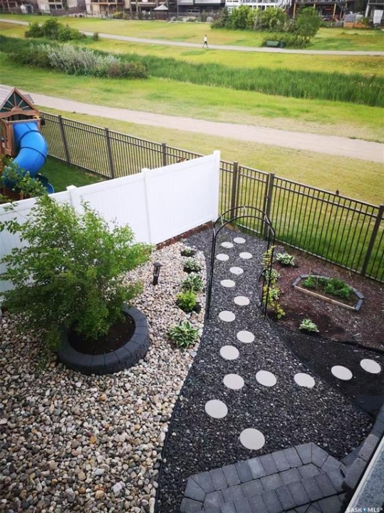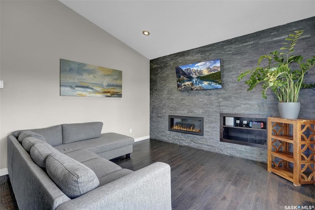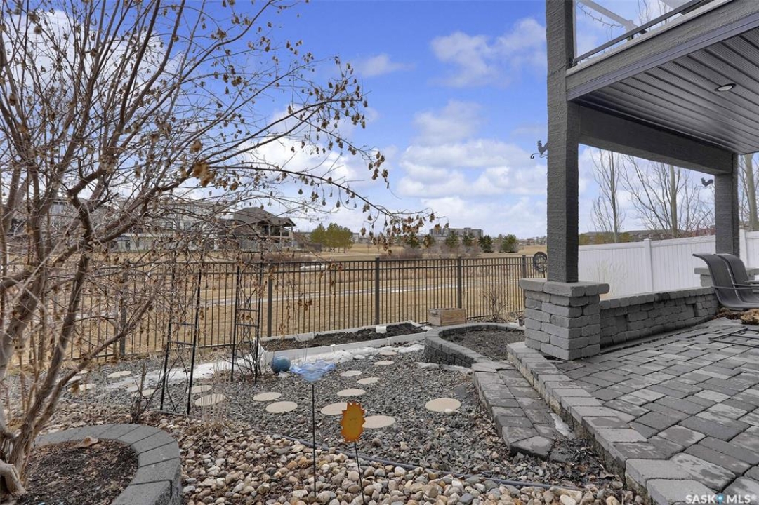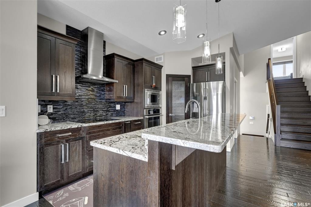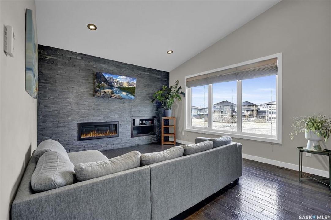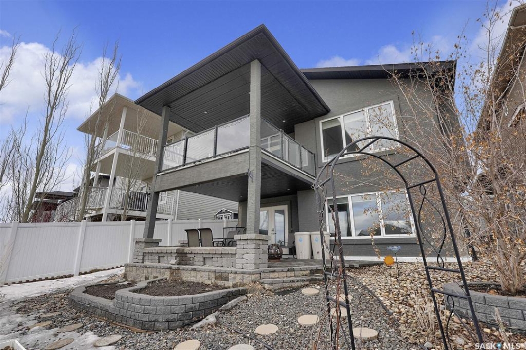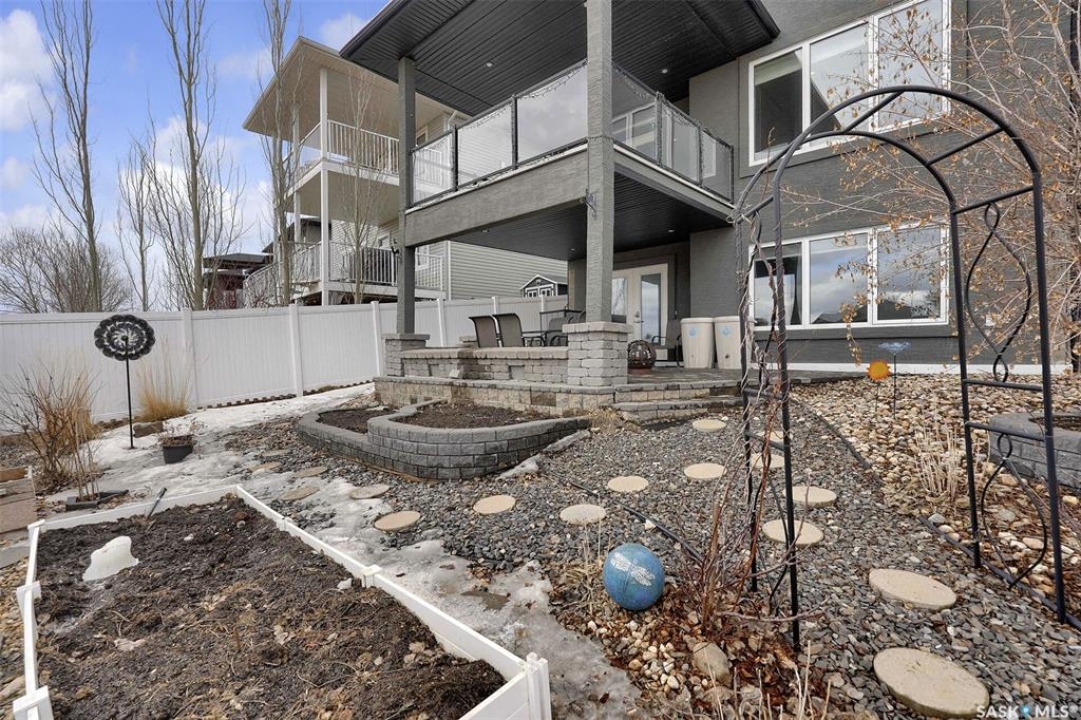 Custom-built home on piles with a walk-out basement! Welcome to this beautiful bi-level offering 5 bedrooms and 3 bathrooms. The open-concept main floor features impressive 11' ceilings and hand-crafted hardwood flooring throughout the kitchen, living, and dining areas. The kitchen showcases extensive maple cabinetry, elegant quartz countertops, tile backsplash, a large island, and a walk-in pantry. The dining area provides access to a spacious covered balcony with glass railing, overlooking the landscaped yard, green space, and walking paths. The bright and inviting living room offers generous space, a fireplace, and a stylish brick feature wall, complemented by large windows that fill the home with natural light. The main floor includes 3 bedrooms and 2 full bathrooms. The primary suite features large windows, a walk-in closet, and a well-appointed ensuite with tile flooring, separate shower, corner soaker tub, and dual sinks. Two additional good-sized bedrooms, a full bathroom, and a convenient laundry/storage area complete this level. The fully developed walk-out basement expands the living space with 2 additional bedrooms, a spacious family room, kitchen/bar and dining area, an additional full bathroom, and plenty of storage. The double attached garage is fully insulated and drywalled, with wiring in place for a future heater. Ideally located just steps from parks, an elementary school, green spaces, and walking paths, this home offers a fantastic location with beautiful views.