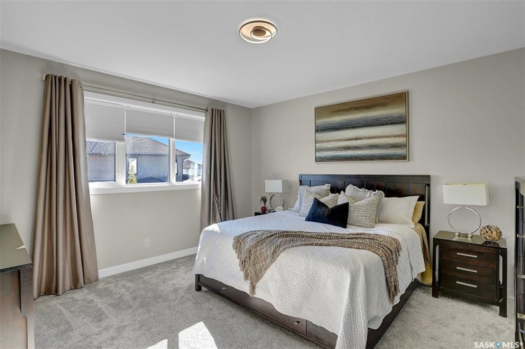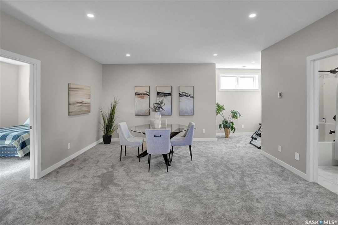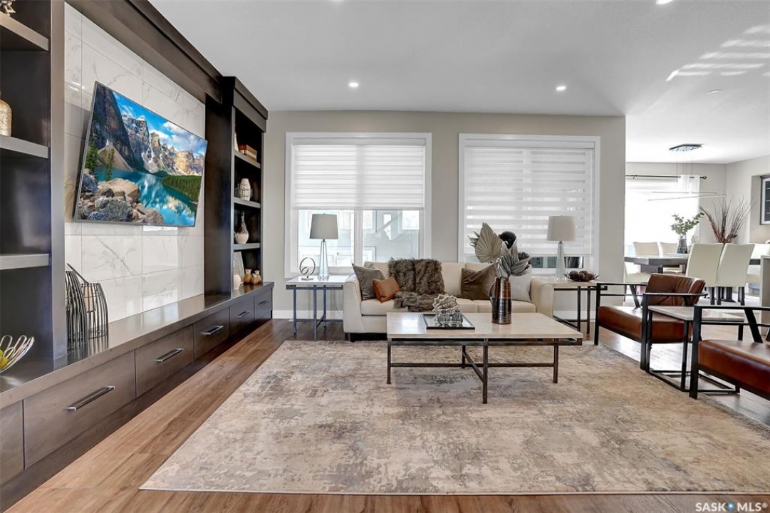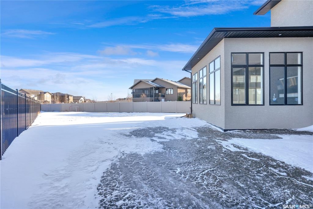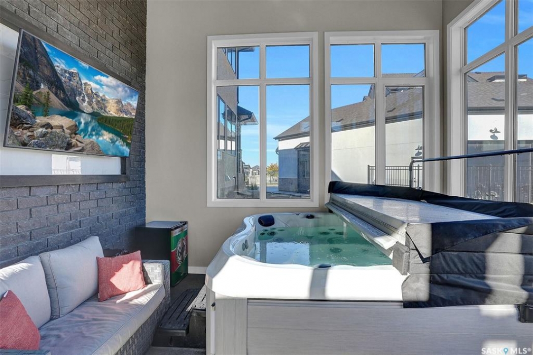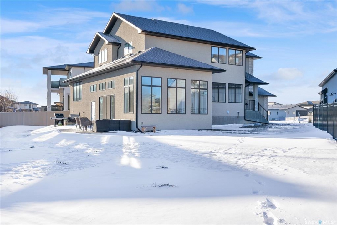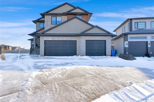 Welcome to 4244 Elderberry Crescent E, Where Luxury Meets Livability. Nestled in Regina's premier neighbourhood, The Creeks, this exceptional Gilroy-built home blends contemporary elegance with practical design. From the moment you turn onto the quiet crescent, you'll feel right at home. Sitting on a massive 11,000+ sq. ft. pie-shaped, park-view lot, this property offers endless potential to create your dream outdoor space. The acrylic stucco and stone-accented exterior paired with a grand entryway set an impressive tone from the moment of arrival. Step inside to a breathtaking two-storey foyer that opens into a spacious family room, complete with a full feature presentation wall. The chef's kitchen is a true showstopper, featuring a large eat-up island, abundant drawer storage, upgraded Chef's style appliances, and a walk-in pantry built for organization and convenience. A stylish 2pc bath, mudroom, and laundry area round out the main floor. The triple attached heated garage offers ample room for parking, projects, entertainment, and storage. Upstairs, unwind in the oversized bonus room overlooking the foyer or get productive in the dedicated office (or optional 4th bedroom). Two generously sized secondary bedrooms each feature their own walk-in closets. The primary suite is a private retreat, showcasing impressive square footage outfitted in plush carpeting, a spa-inspired ensuite with dual sinks, a deep soaker tub, and a custom-tiled shower, plus direct access to a beautifully designed walk-in closet. The newly finished basement adds even more living space, including a sprawling rec room, nook or workout area, a full bathroom, and a fifth bedroom ideal for guests or a growing family. To top it all off, enjoy year-round relaxation in the 4 season heated sunroom, complete with a hot tub, the perfect spot for entertaining or unwinding after a long day. 4244 Elderberry Crescent E is more than a home, it's a statement of quality, comfort, and modern luxury.