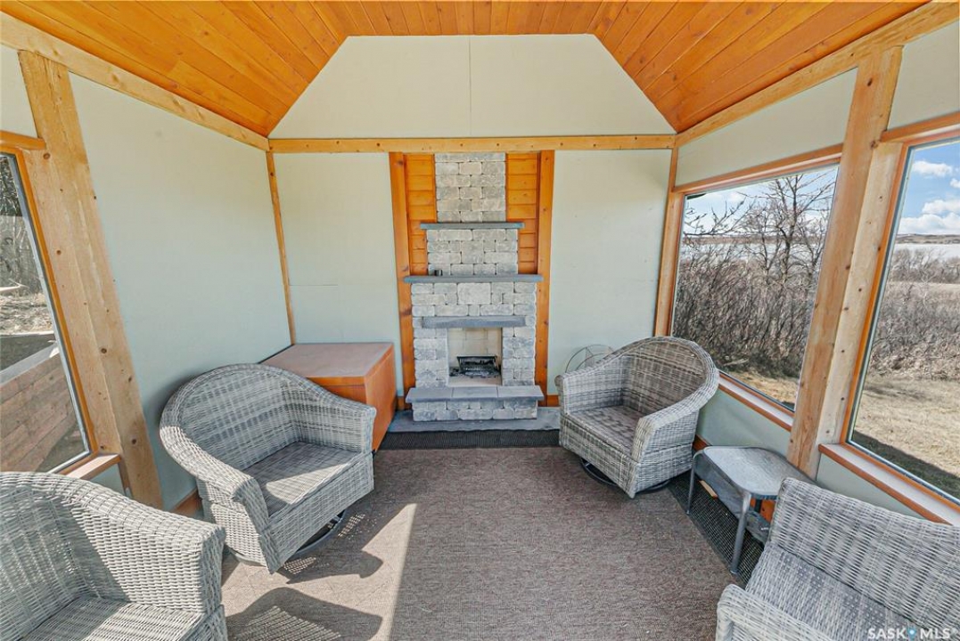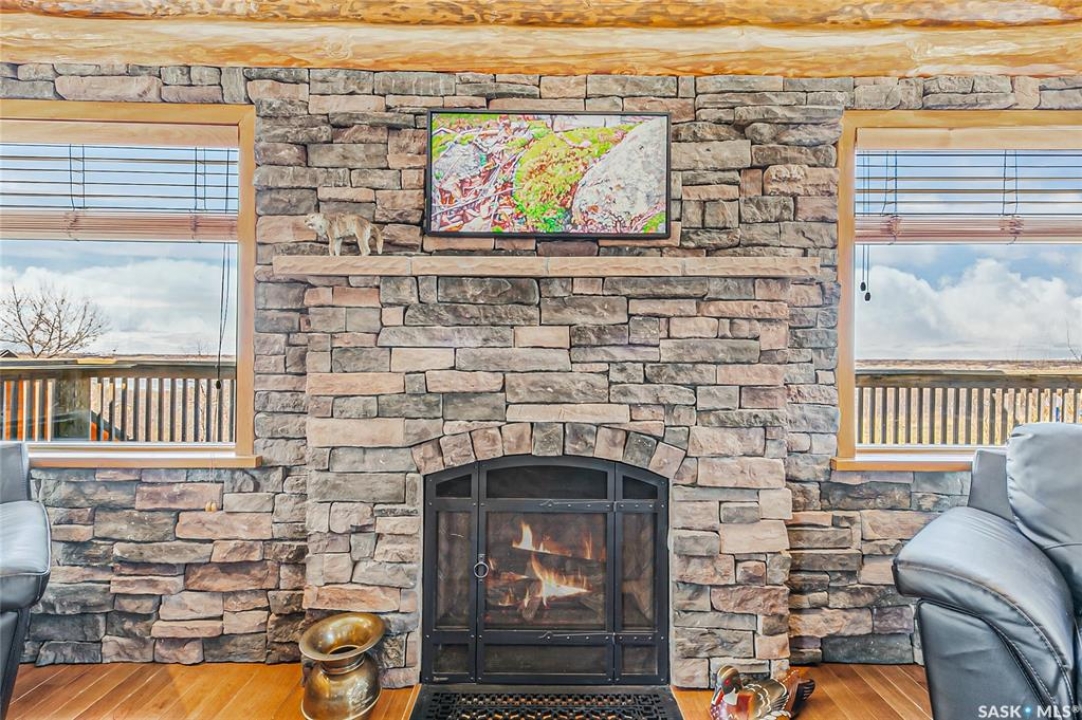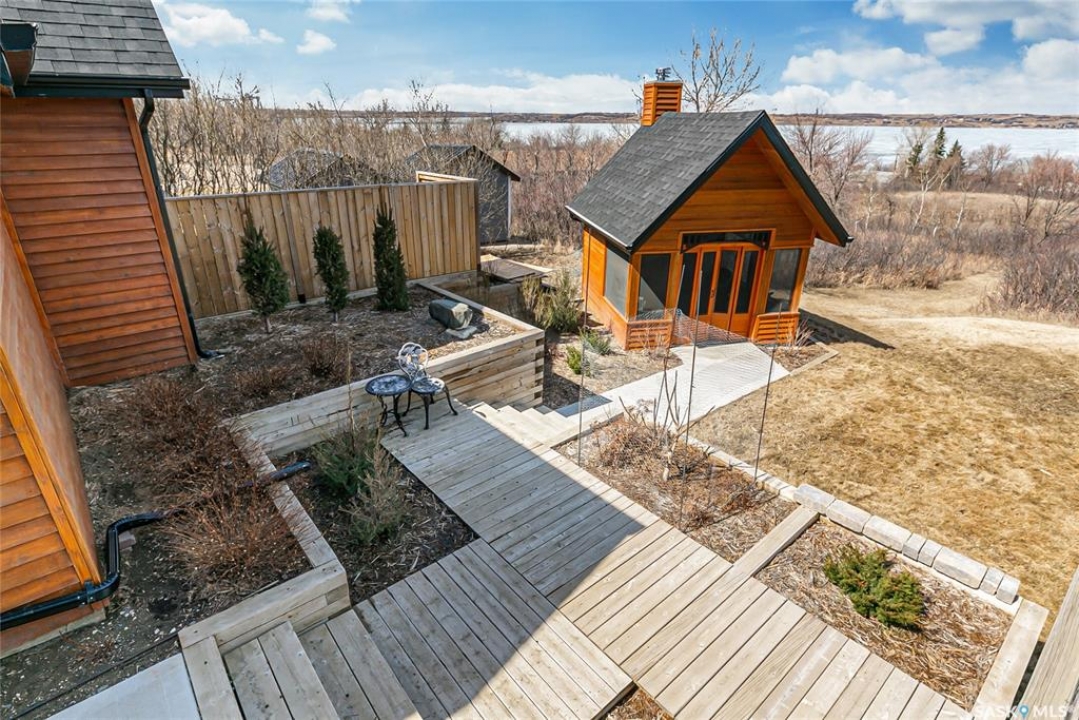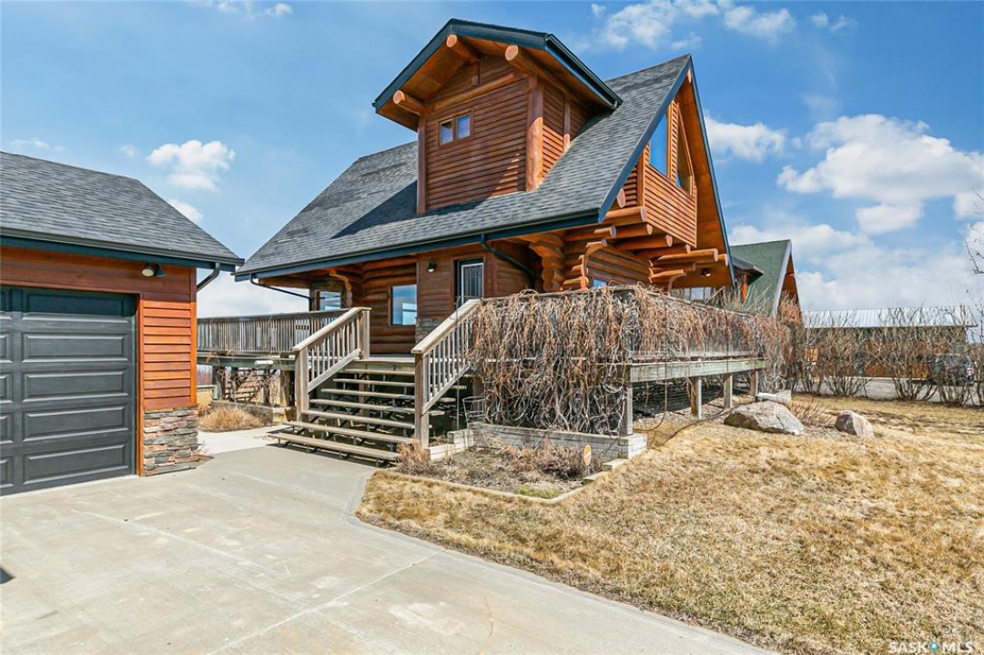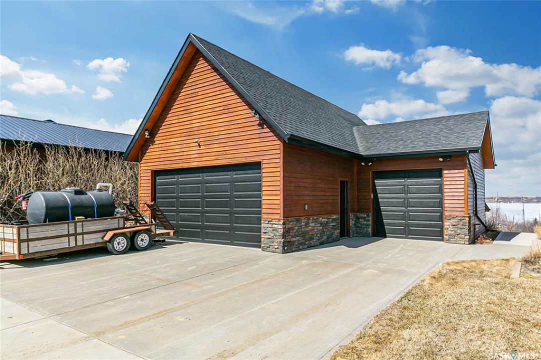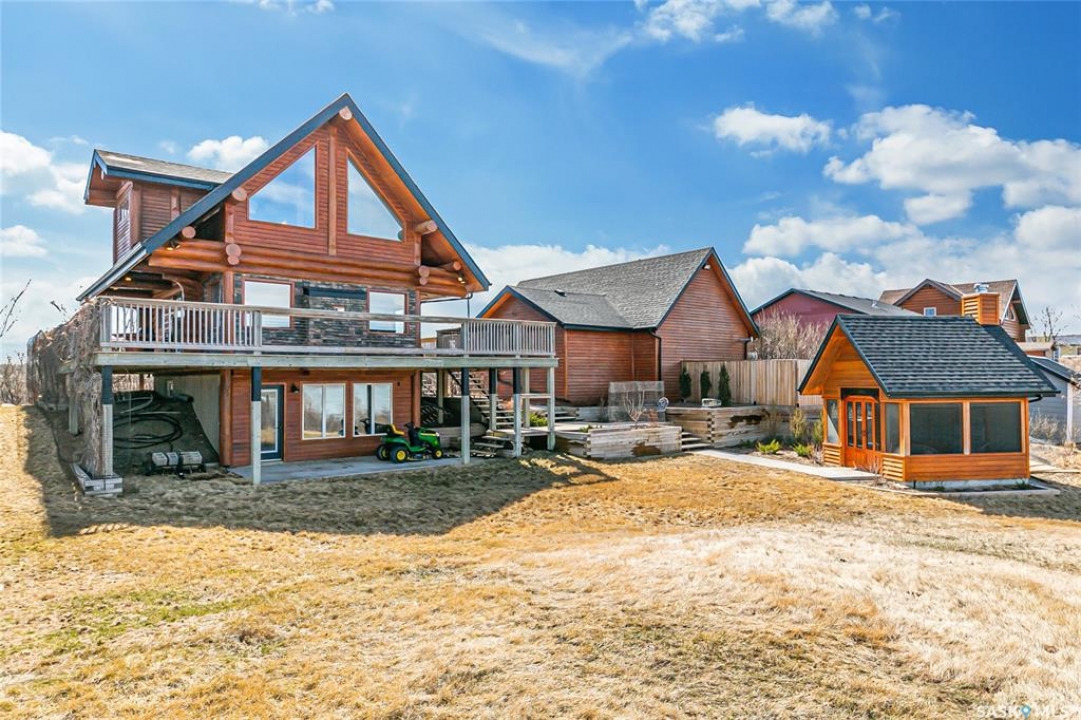 Welcome to your private retreat in Kinookimaw, next to Regina Beach and the Regina Beach Golf Club, just 30 minutes from Regina. Surrounded by nature, this beautifully landscaped double lot features retaining walls, mature greenery, and a 3.41-acre green space in front, preserving views of Last Mountain Lake. The home showcases quality craftsmanship, including 3-inch hardwood flooring across most of the main floor, triple-pane windows, and double-pane doors with built-in blinds. The inviting living space centres around a natural gas stone fireplace. The kitchen offers granite countertops, rich dark oak cabinetry, and timeless finishes, complemented by cast iron floor registers and return air. Outdoor living shines with a 360-degree wraparound deck, concrete patio, and a stunning gazebo with a concrete floor and wood-burning fireplace with a Class A chimney. The walkout basement adds a bedroom, large family room, 4-piece bathroom, and utility room with storage. Upstairs, the spacious primary bedroom fits a king bed and includes a 3-piece ensuite. Additional highlights include spray foam-insulated basement walls, a spray foamed ceiling roof for enhanced efficiency, a high-efficiency furnace with central air conditioning, and an owned natural gas water heater. The detached, fully heated 2' x 6' constructed garage offers 1,040 sq ft with 10-foot ceilings, accommodating up to five vehicles. The annual lease of $2,488 includes water. Sold fully furnished (excluding a few items). A rare opportunity for space, privacy, and lifestyle just minutes from Regina Beach.