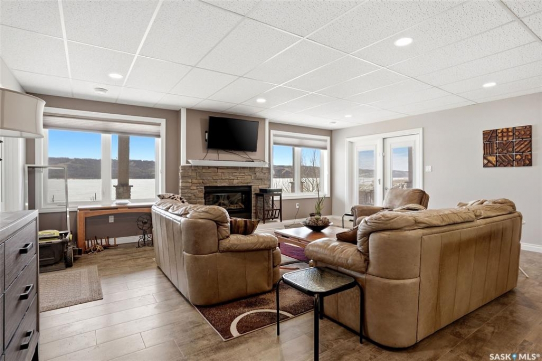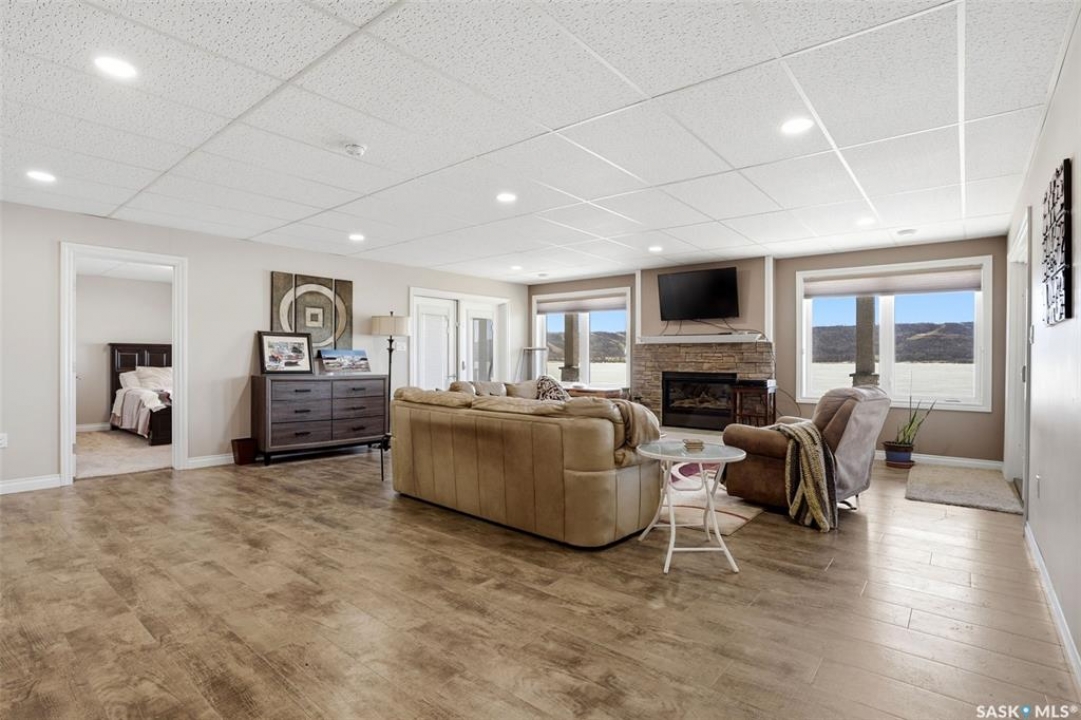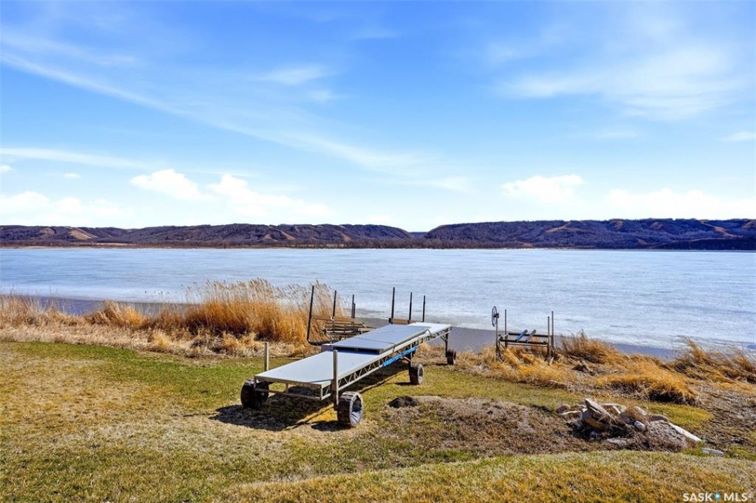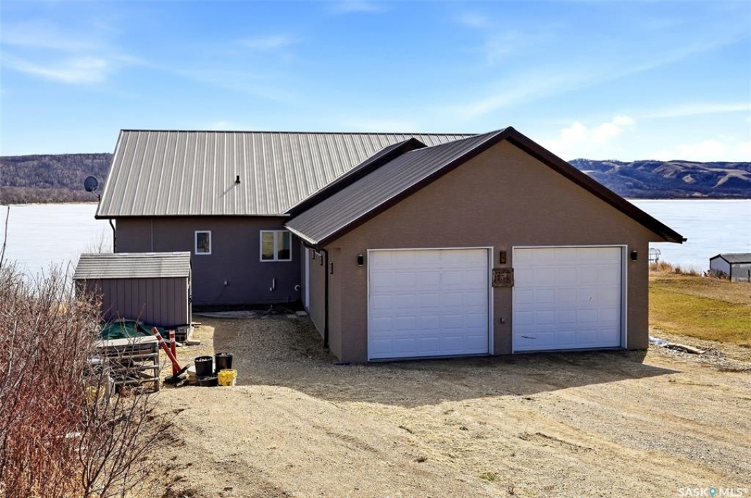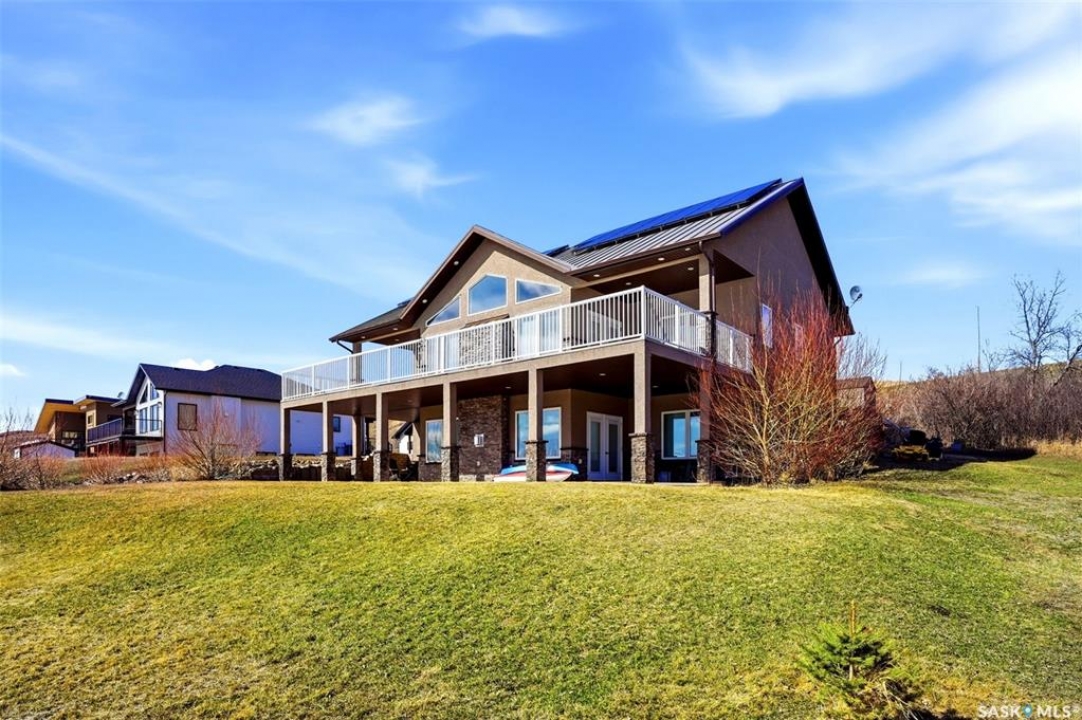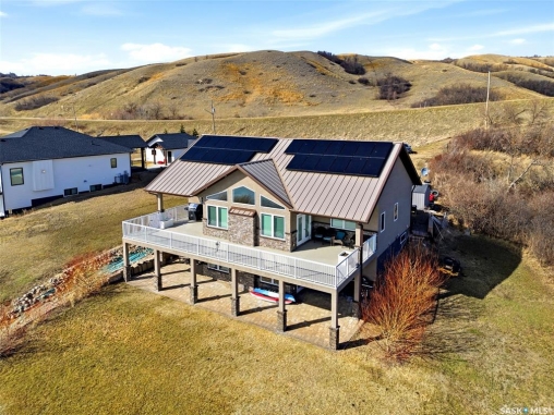 Lakefront living on beautiful Pasqua Lake with panoramic water views from nearly every living space! This thoughtfully designed walkout bungalow offers 1,566 sq. ft. above grade on a 0.22-acre waterfront lot with direct lake access, a double attached garage, & exceptional energy-conscious features including solar panels, backup generator, & 200-amp electrical. Exterior is finished in stucco with a durable metal roof, while the insulated double attached garage includes metal cladding, floor drain, & plumbing in place for future in-floor heat. A mudroom connects the garage to the home & is also finished with metal cladding for durability. Inside, the custom-built kitchen is designed for both function & entertaining, featuring a large island, granite countertops, soft-close cabinetry, pantry, stainless steel appliances, built-in dishwasher, gas stove, microwave, fridge, & freezer included. The main floor offers 3 bedrooms, including a spacious primary retreat with abundant natural light, walk-in closet, and generous 3-pc ensuite. A dedicated main floor laundry room & an additional 4-pc bathroom complete the level. The living room is framed by expansive windows that fully capture the lakefront setting, anchored by an electric fireplace & offering 2 separate accesses to the upper deck overlooking the water. The walkout lower level continues the lake views with a large family room featuring a natural gas fireplace, wet bar, in-floor heat, & 2 separate sets of French doors leading directly to the lower lakeside patio. This level also includes 2 additional bedrooms, a den ideal for a home office or exercise room with lake views, storage room, utility room, & extensive mechanical systems including pumps, water filtration, on-demand hot water, & natural gas forced-air heating. Gravel driveway, storage shed, excellent storage throughout, & a layout designed to fully embrace lake life make this an outstanding year-round property!
