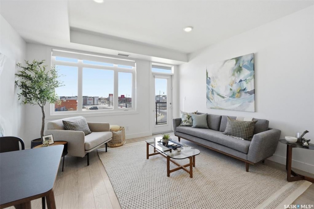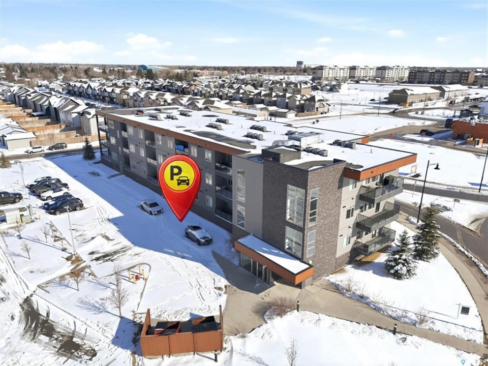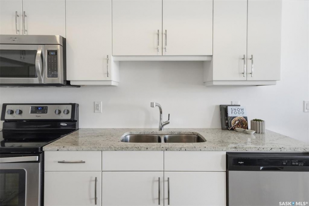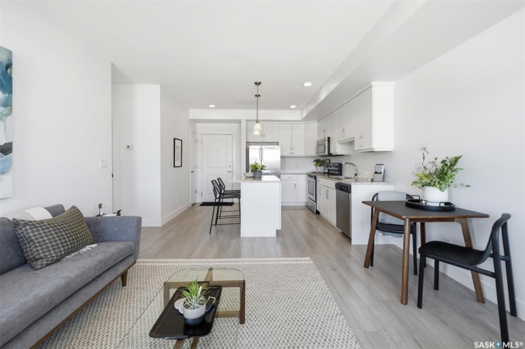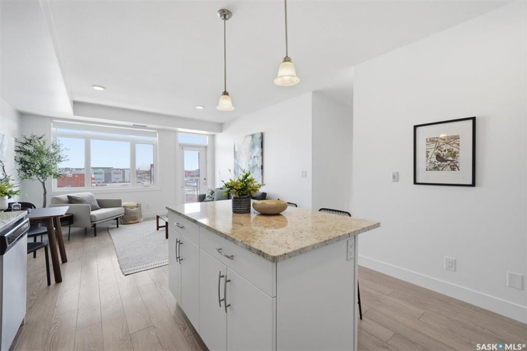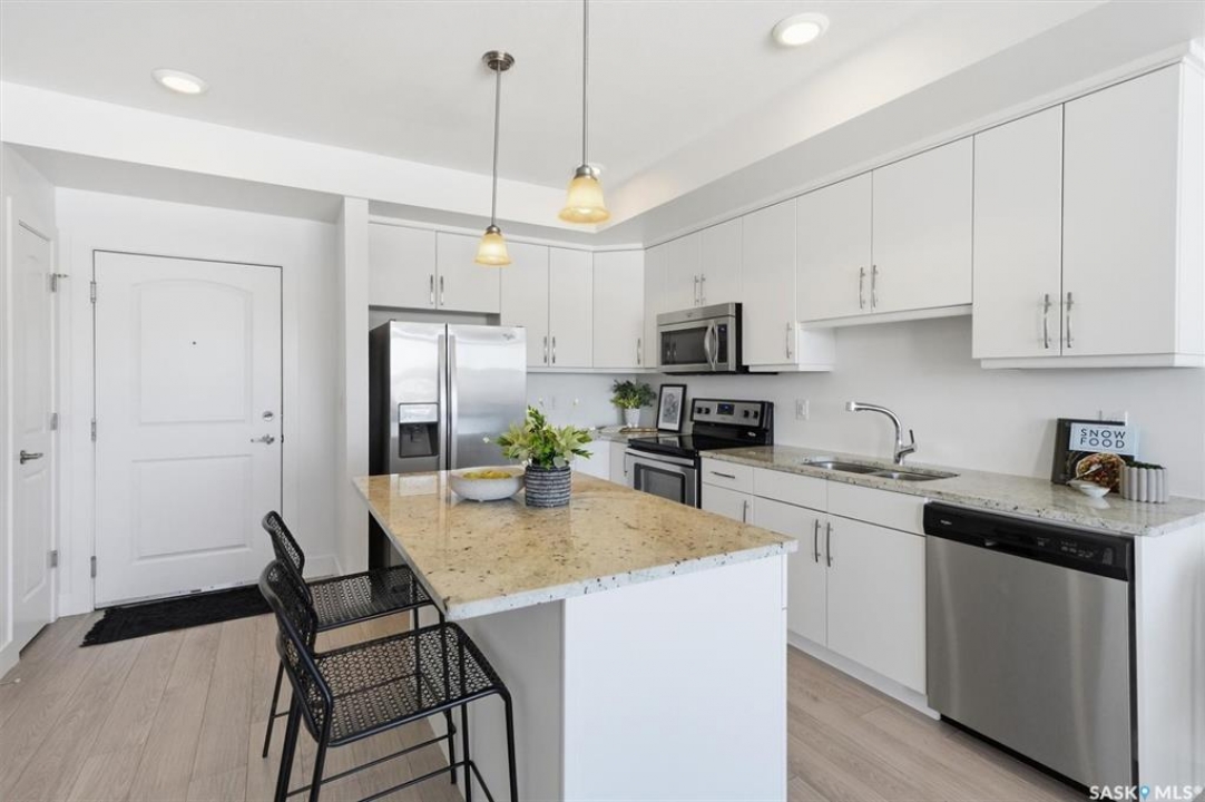 Welcome to this well-designed condo in the heart of Kensington, offering a bright and functional space in a location buyers love. The open-concept layout is filled with natural light, thanks to its south-facing exposure, keeping the main living areas warm and sunny throughout the day. The kitchen is a standout feature, complete with granite countertops, stainless steel appliances, ample cabinetry, and a spacious island with eat-up seating, perfect for both everyday living and entertaining. This unit offers two bedrooms, including a primary suite with a walk-in closet and a four-piece ensuite, along with a second full bathroom. Step out onto the south-facing balcony to enjoy your own sun-soaked outdoor space, ideal for morning coffee or winding down at the end of the day. You'll appreciate the added value of two parking stalls: one secure, heated underground stall and one non-electrified surface stall. Additional features include in-suite laundry, central air conditioning, forced-air heating, and elevator access. Located just steps from Kensington's shops, restaurants, groceries, parks, and more, with quick access to main routes. Bright, functional, and in a prime location—this is an easy one to step into.