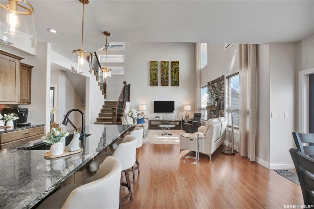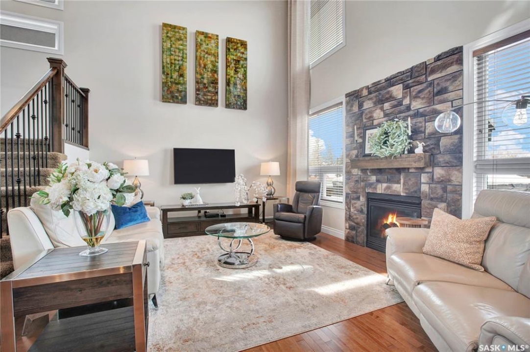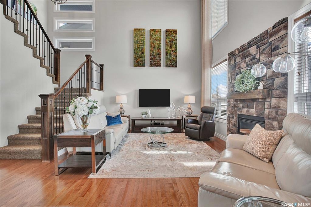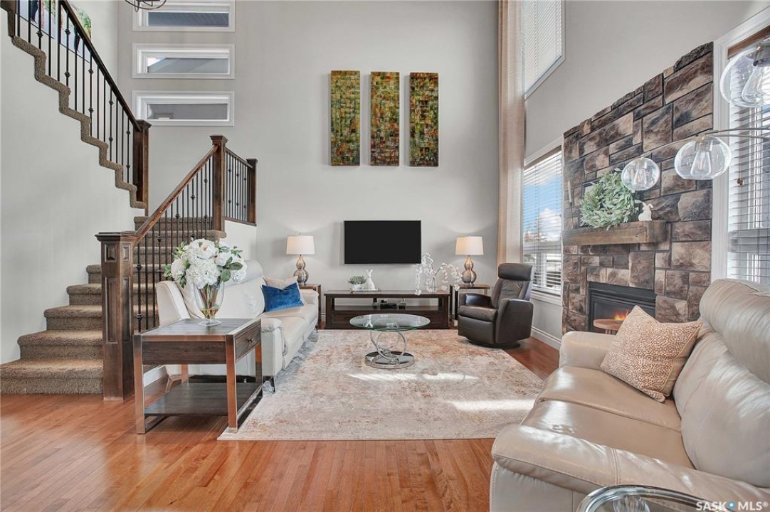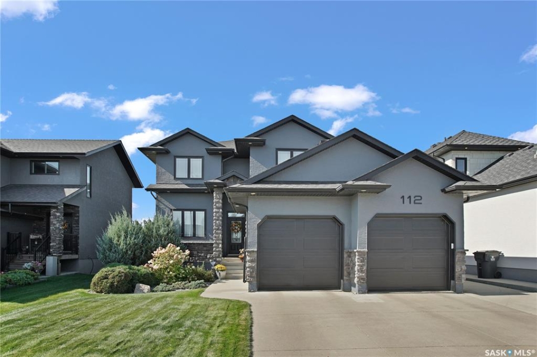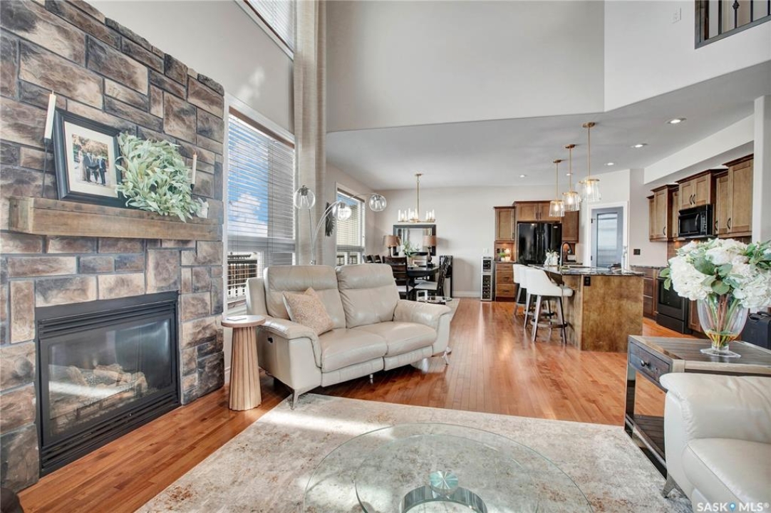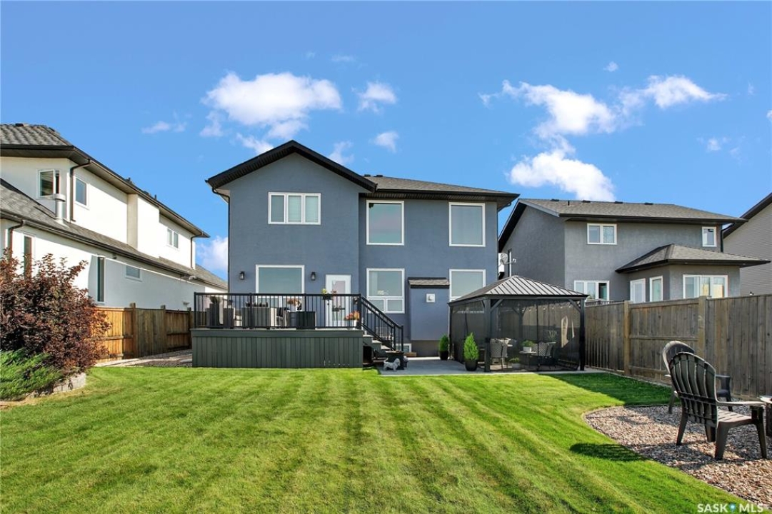 Welcome to this immaculate two-storey home, ideally located on one of Martensville's most desirable streets. Thoughtfully designed with an open-concept layout, this home offers the perfect blend of style, comfort, and functionality. The main floor features a spacious kitchen and dining area complete with a massive island, granite countertops, and a convenient walk-through pantry—perfect for everyday living and entertaining alike. The inviting living room is highlighted by a cozy gas fireplace, while the laundry/mudroom is ideally situated just off the fully finished 2-car garage, which boasts PVC paneling on both walls and ceiling. Upstairs, you'll find a beautiful primary retreat with a stunning ensuite and walk-in closet, along with two additional good sized bedrooms and a full 4-piece bathroom. The fully developed basement offers even more living space, including a large family room with a second gas fireplace, an additional bedroom, a 4-piece bathroom, and ample storage. This home is loaded with upgrades, including Chic Stucco Coating, UV window coating at the rear of the home, programmable underground sprinklers, and a premium polyaspartic-coated concrete patio. Additional highlights include a newer gazebo, newer garage doors, updated lighting throughout, updated paint and a newer composite deck. And so much more! A truly turnkey property with exceptional attention to detail—this is one you won't want to miss.