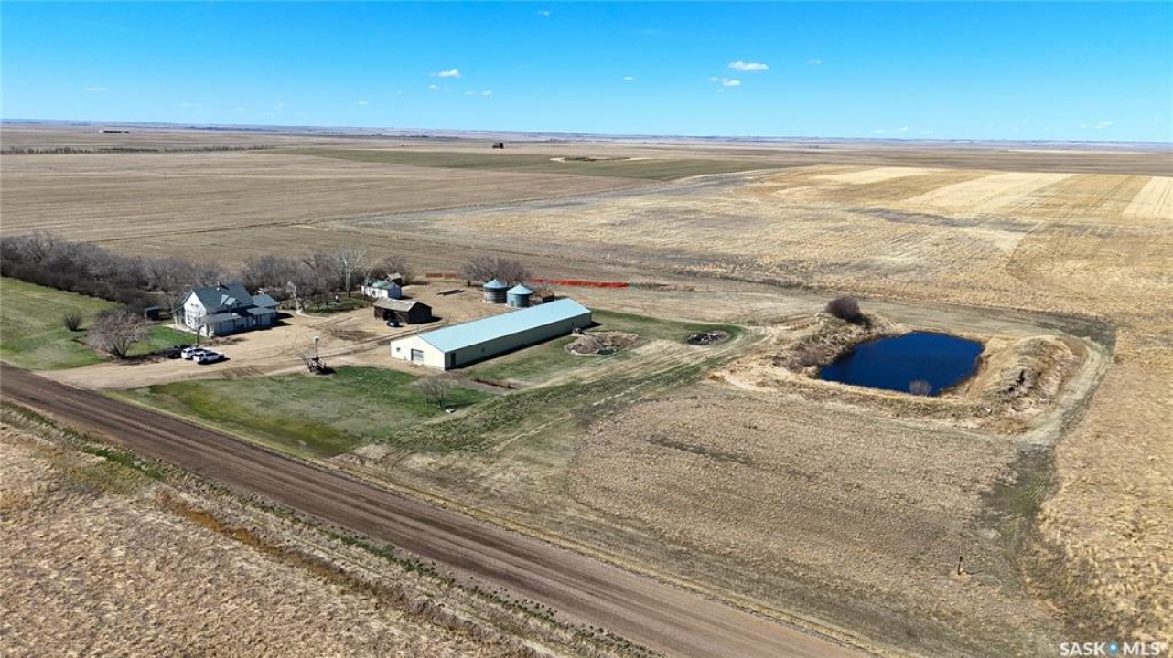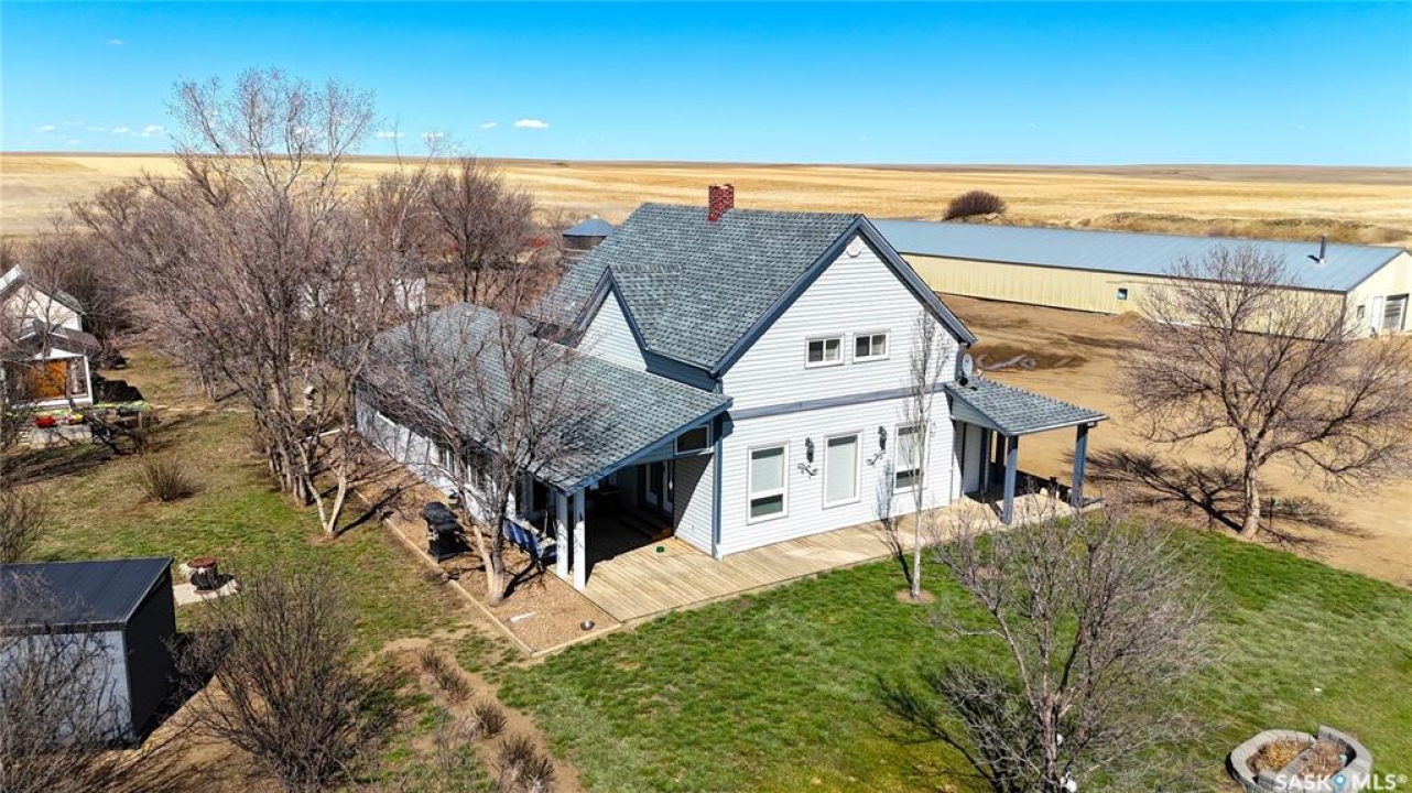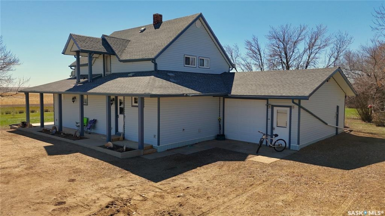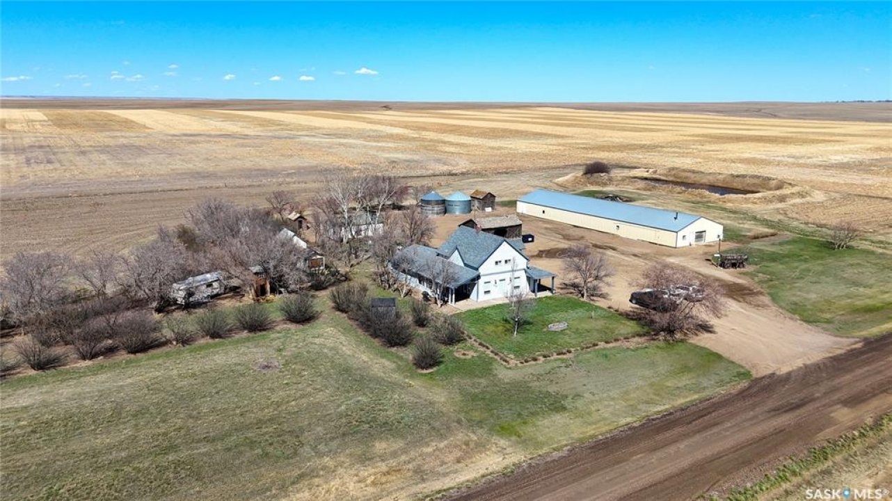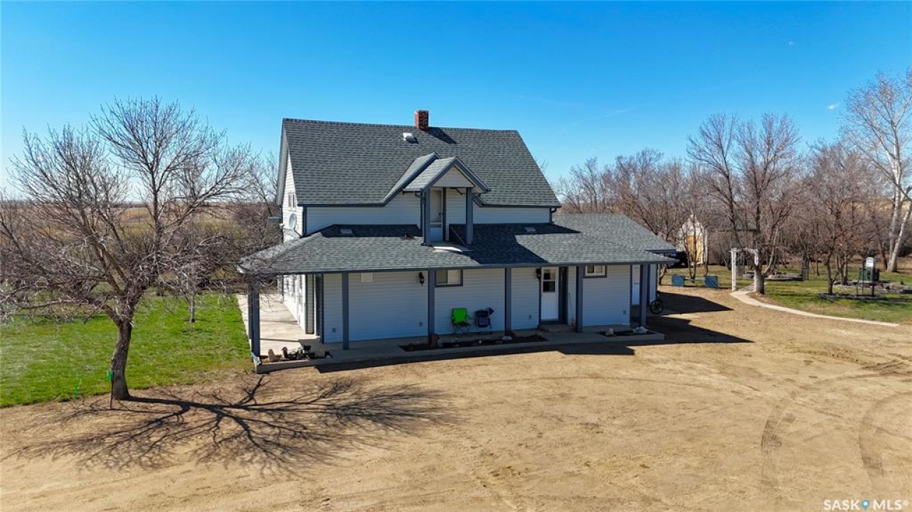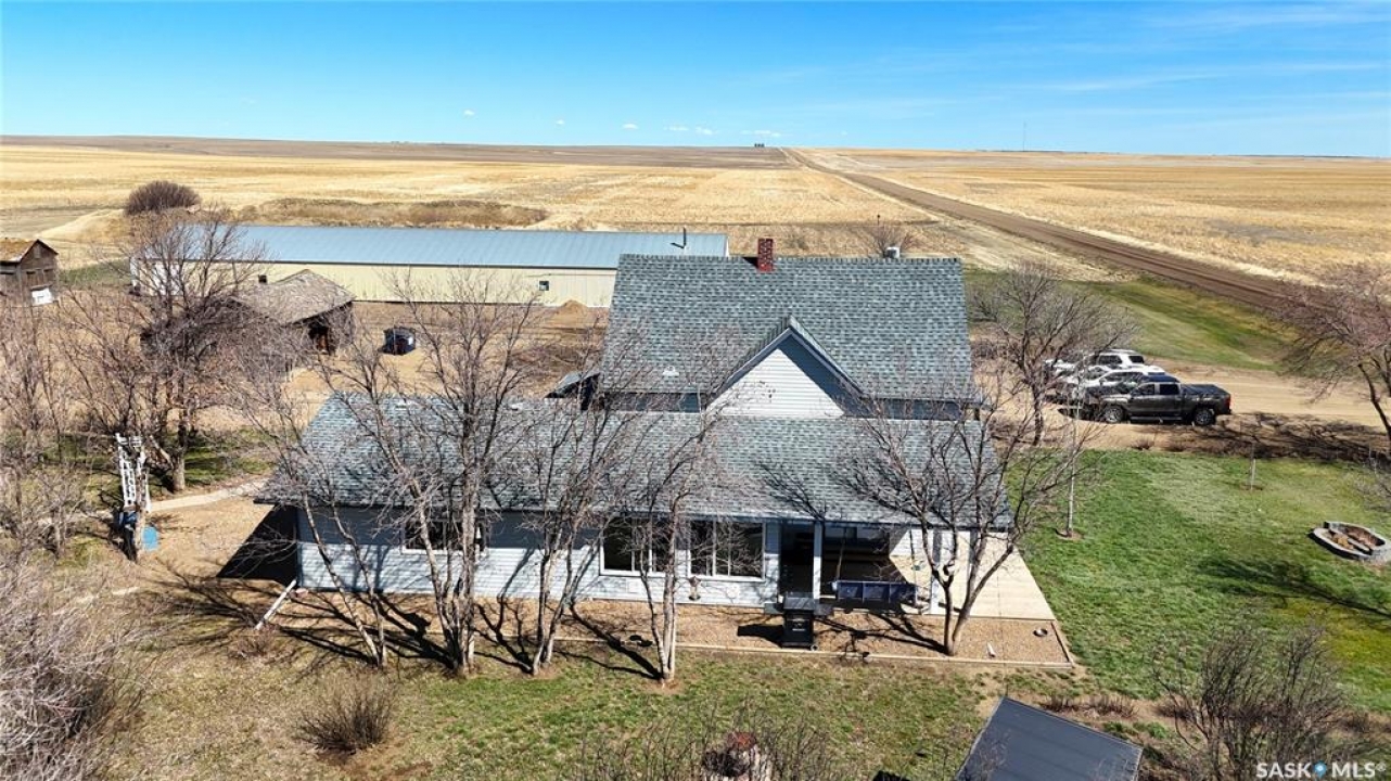 Located approximately 9 km east of Ponteix, this exceptionally well-maintained & affordable 10-acre acreage offers a mature, treed yard site w outstanding shelter & sweeping prairie views. 6 acres of productive hayland make it perfectly suited for hobby farming. There is a 40' x 140' metal-clad building w partial concrete flooring & power, previously used as a rabbit barn, providing options for storage, livestock, or workshop use. The home clearly reflects pride of ownership, w brand new shingles (2026), PVC windows & vinyl siding updated. A covered east-facing veranda adds warmth & curb appeal. The east entrance opens into a practical addition (late 1990s) featuring a foyer, ample closet space, & a convenient 3-piece bath. The main floor also includes a mudroom/laundry area off the kitchen h direct access to the heated garage. This garage is well-equipped as a workshop w in-floor heat & includes an RV hookup on the north exterior. The bright country kitchen flows seamlessly into the dining area w island, while the spacious living room is filled w natural light from the many windows. Garden doors lead to a covered deck & a 12' x 15' enclosed 3-season sunroom (added in 2010), ideal for entertaining or relaxing. Upstairs features 4 generously sized bedrooms, including one w built-in bunk beds. The primary bedroom is spacious (bed included). Both a 3-piece & 4-piece bathroom are conveniently located on the main floor. The basement offers a versatile rec area, perfect for hobbies or crafting. The yard is immaculately cared for, showcasing mature trees & numerous perennials. The property is serviced by a well w abundant water supply. Additional features include sheds, bins, a treehouse, older RV & a dugout. Included: 2 fridges, zero-turn mower, & most contents of exterior buildings. A move-in-ready acreage that stands out for its condition, care, & affordability—an excellent opportunity for those seeking value without compromise.