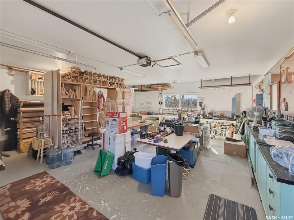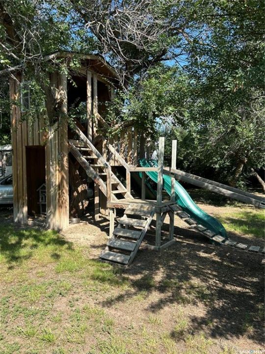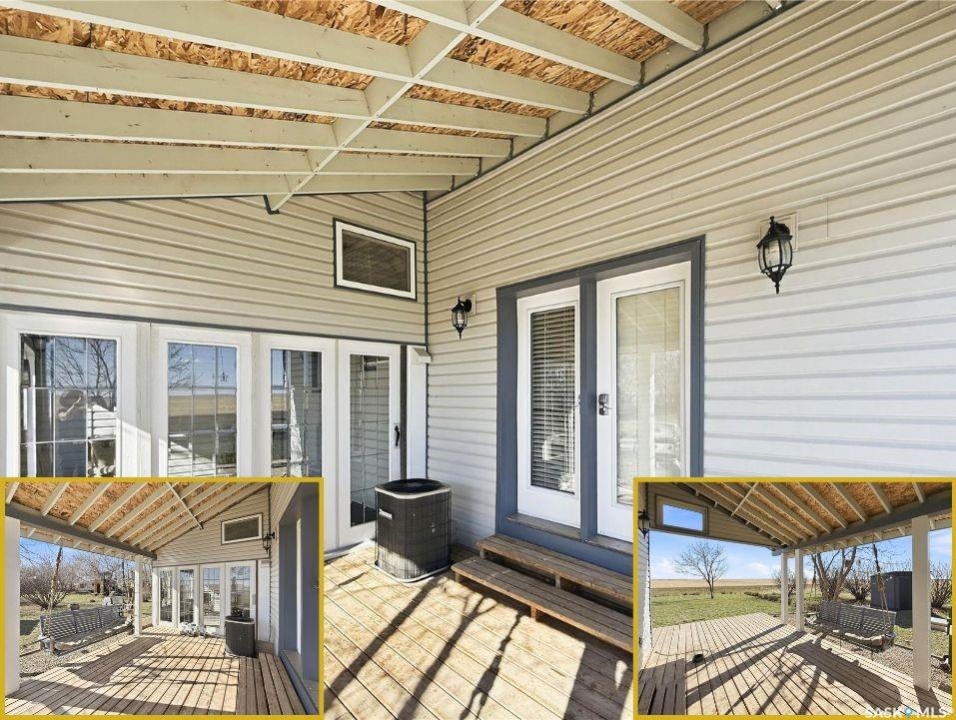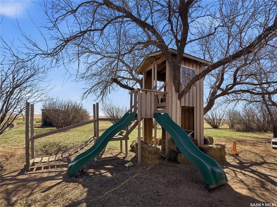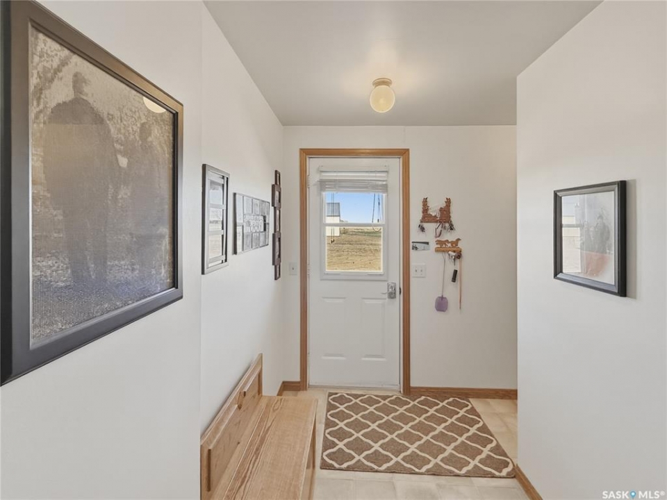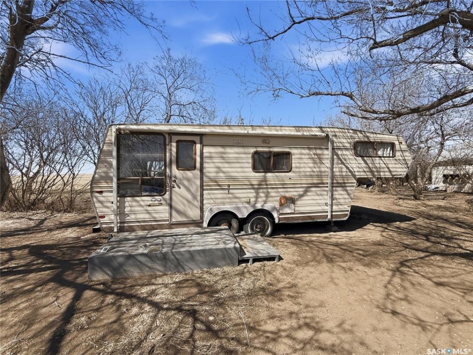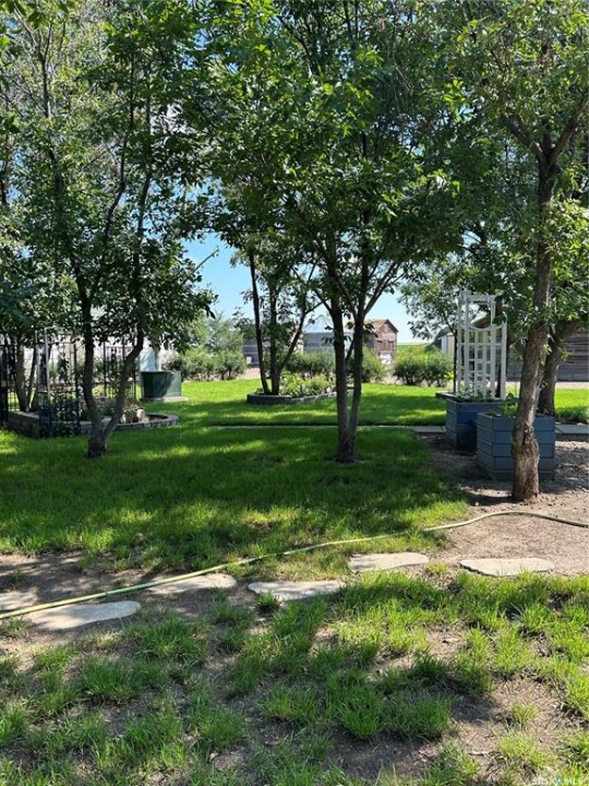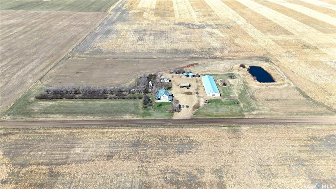 Located approximately 9 km east of Ponteix, this exceptionally well-maintained & affordable 10-acre acreage offers a mature, treed yard site w outstanding shelter & sweeping prairie views. 6 acres of productive hayland make it perfectly suited for hobby farming. There is a 40' x 140' metal-clad building w partial concrete flooring & power, previously used as a rabbit barn, providing options for storage, livestock, or workshop use. The home clearly reflects pride of ownership, w brand new shingles (2026), PVC windows & vinyl siding updated. A covered east-facing veranda adds warmth & curb appeal. The east entrance opens into a practical addition (late 1990s) featuring a foyer, ample closet space, & a convenient 3-piece bath. The main floor also includes a mudroom/laundry area off the kitchen h direct access to the heated garage. This garage is well-equipped as a workshop w in-floor heat & includes an RV hookup on the north exterior. The bright country kitchen flows seamlessly into the dining area w island, while the spacious living room is filled w natural light from the many windows. Garden doors lead to a covered deck & a 12' x 15' enclosed 3-season sunroom (added in 2010), ideal for entertaining or relaxing. Upstairs features 4 generously sized bedrooms, including one w built-in bunk beds. The primary bedroom is spacious (bed included). Both a 3-piece & 4-piece bathroom are conveniently located on the main floor. The basement offers a versatile rec area, perfect for hobbies or crafting. The yard is immaculately cared for, showcasing mature trees & numerous perennials. The property is serviced by a well w abundant water supply. Additional features include sheds, bins, a treehouse, older RV & a dugout. Included: 2 fridges, zero-turn mower, & most contents of exterior buildings. A move-in-ready acreage that stands out for its condition, care, & affordability—an excellent opportunity for those seeking value without compromise.