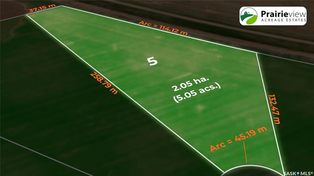 Build your dream home in Prairieview Acreage Estates! Located on paved HWY 734, just 10 minutes from Regina's north end, you will find this country residential acreage community. Escape the hustle of the city and live the acreage lifestyle you have been dreaming of! Gas and power services are provided to the property, making building your dream home a breeze. The acreages in the development range in size from 4.6 acres to 6.75 acres. These large acreage lots provide ample opportunity for creative home designs. The location is just minutes from three golf courses (Flowing Springs, Deer Valley, and Sherwood Forest Country Club). Bus access is provided to Lumsden Elementary and Lumsden High School, offering both English and French programs. Another bonus—choose your own builder! Don't miss the opportunity to visit Prairieview Acreage Estates today and experience the unmatched views and peaceful serenity of country living at its finest. Visit the developer's website at �https://www.prairieviewestates.ca