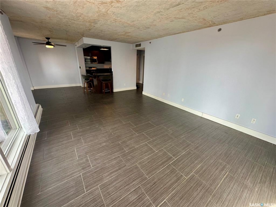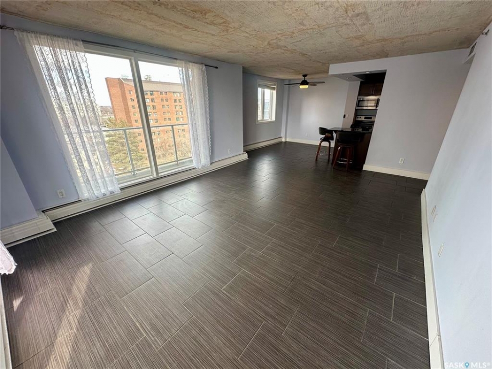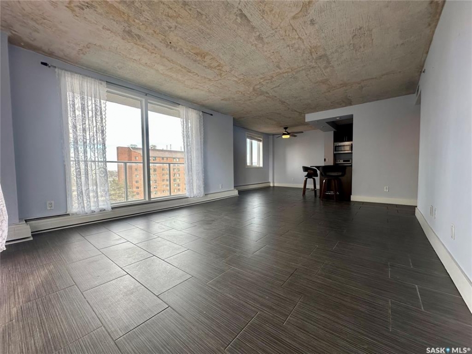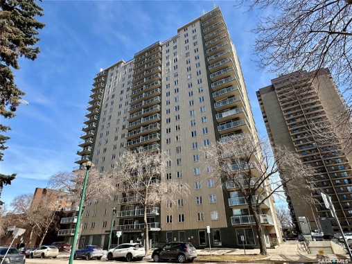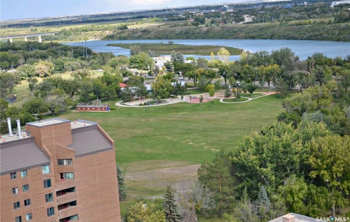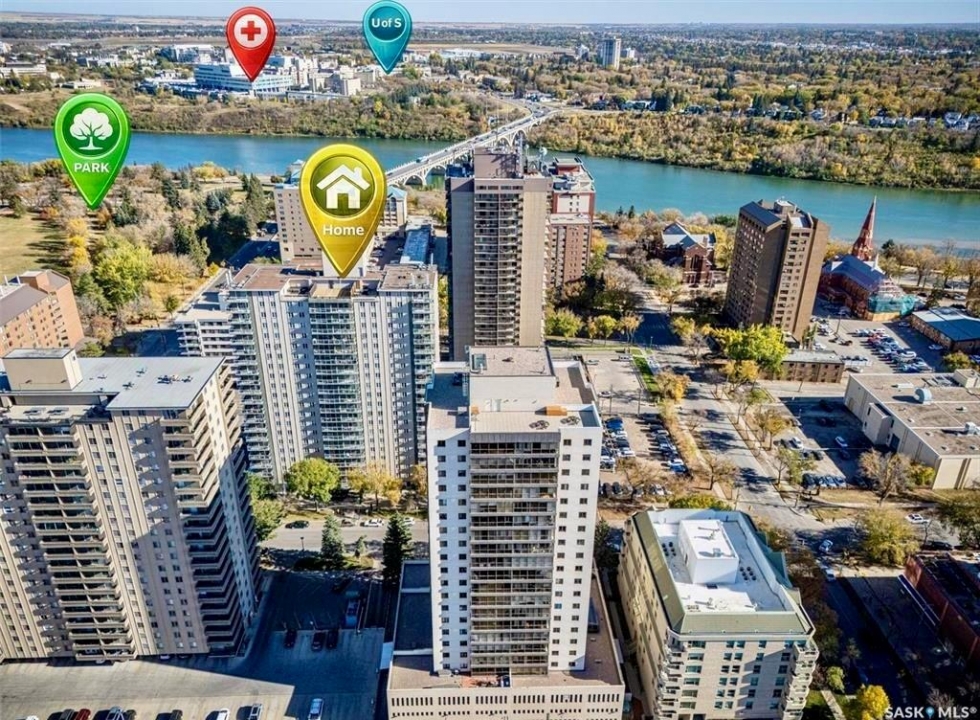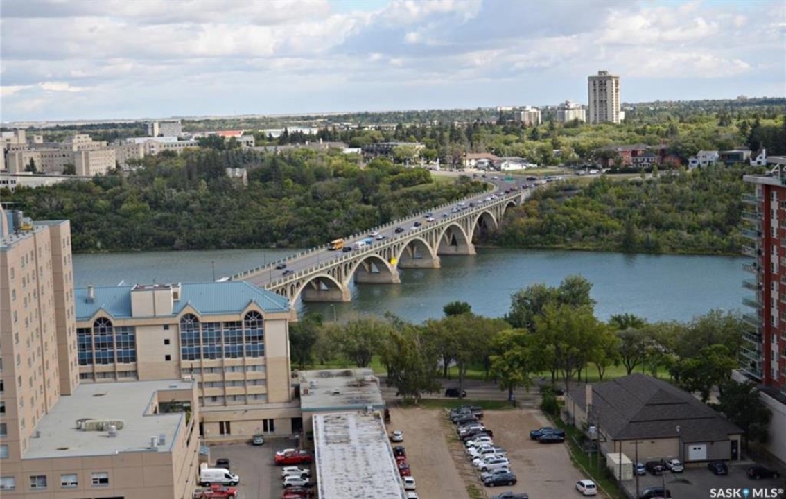 Welcome to The View, a sought-after concrete high-rise offering exceptional urban living in the heart of Saskatoon. This bright and spacious 2-bedroom, 1-bathroom unit features stunning natural light and a modern aesthetic, highlighted by an exposed concrete ceiling in the living area. Enjoy breathtaking views of Kinsmen Park and downtown Saskatoon from your impressive 34-foot wraparound balcony—perfect for relaxing or entertaining. The building boasts incredible amenities including a fully equipped gym, amenities room, and two rooftop patios, all within walking distance to the University of Saskatchewan, restaurants, the river, and scenic walking trails. Additional conveniences include in-suite laundry, free laundry on every floor, garbage chute access, and one included parking stall. A rare bonus: electricity is included in the condo fees, making this an outstanding value in a prime location. Call today for your private tour!