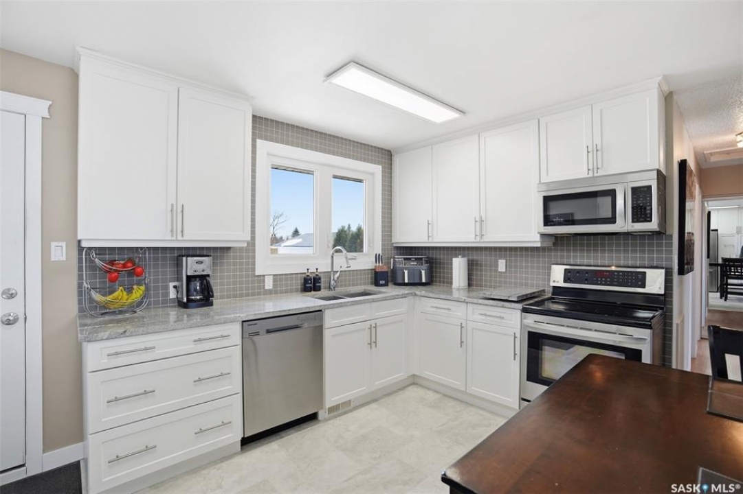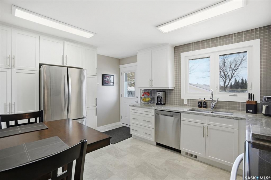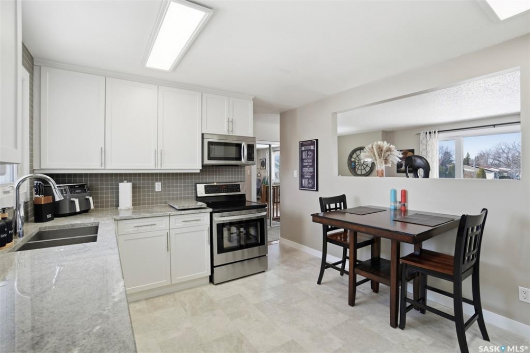 Welcome to 29 Tupper Crescent, a beautifully maintained bi-level home located on a quiet crescent in the desirable Confederation Park neighbourhood of Saskatoon. Backing directly onto Parc Canada Sports Field Diamonds, this property offers a rare combination of privacy, open views, and easy access to outdoor recreation, making it an ideal setting for families and active lifestyles. Inside, the home showcases a bright and inviting main floor with a thoughtfully updated kitchen that truly stands out. Featuring all-new cabinetry, granite countertops, and stainless steel appliances, this space is both stylish and functional, seamlessly connecting to the living area with a pass-through for effortless everyday living and entertaining. The home has been extensively upgraded, with highlights including vinyl windows throughout, modern flooring and trim, and upgraded lighting, enhancing its clean, contemporary feel. The main level offers comfortable living with well-sized bedrooms and a beautifully renovated full bathroom. Downstairs, the fully developed basement provides additional living space with a large family room, an extra bedroom, and a second fully renovated bathroom highlighted by a spacious tiled shower. This level is perfect for guests, teenagers, or a cozy retreat. Situated on an irregular lot backing green space, the outdoor area is designed for enjoyment, featuring a deck, a fenced yard, mature trees, and space to relax or entertain. The property also features a heated, fully insulated 24' x 24' detached garage and off-street parking, offering excellent functionality year-round. This solid 1973-built home has been thoughtfully updated throughout and is move-in ready, combining modern upgrades with a fantastic location close to parks, schools, and amenities. Offering exceptional value starting at $399,900, this is a great opportunity to own a stylish, well-cared-for home in a sought-after neighbourhood.
